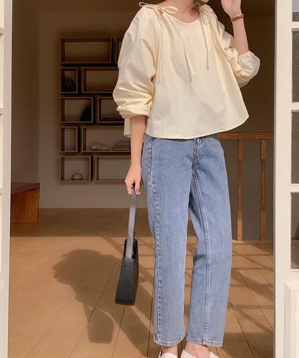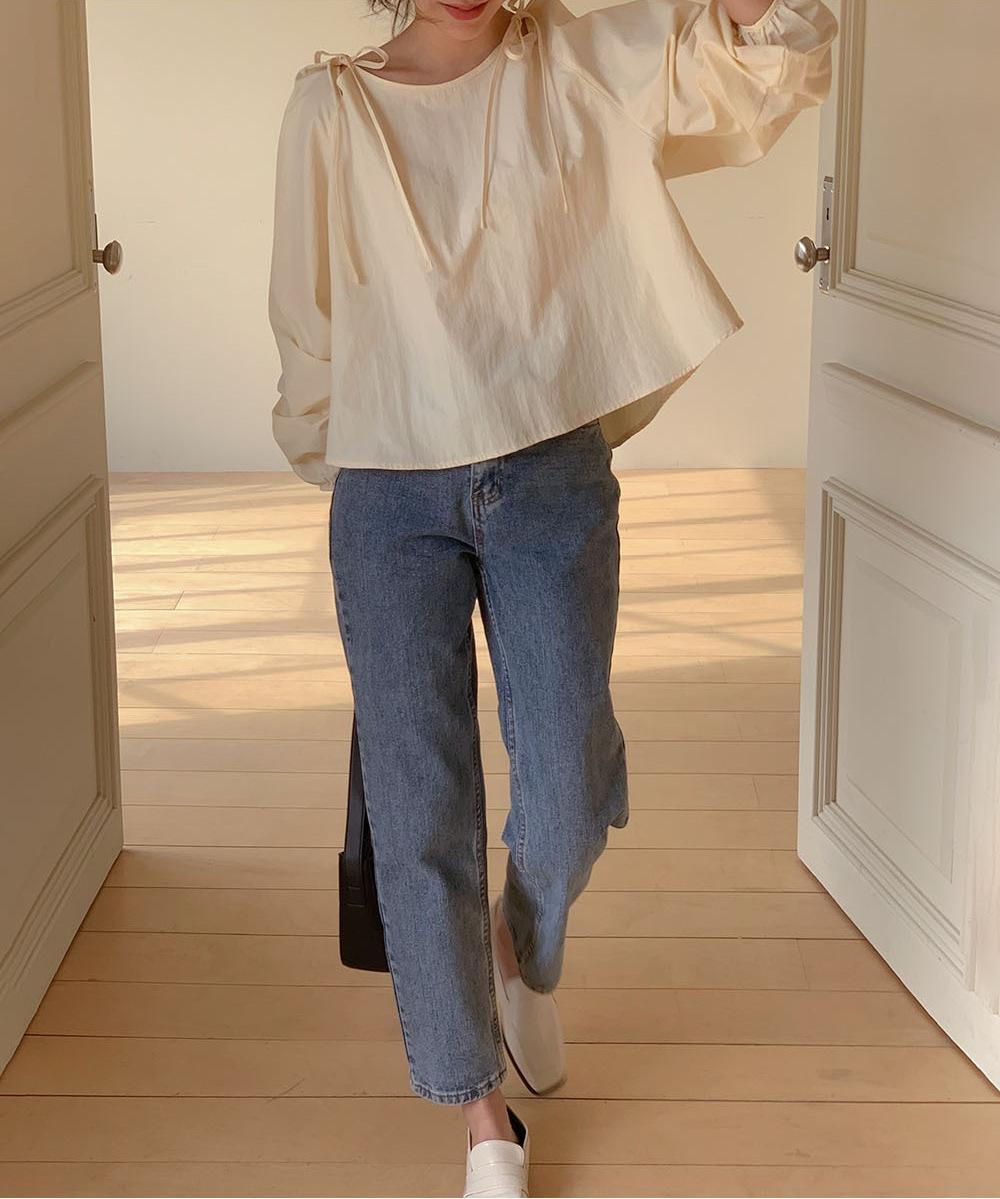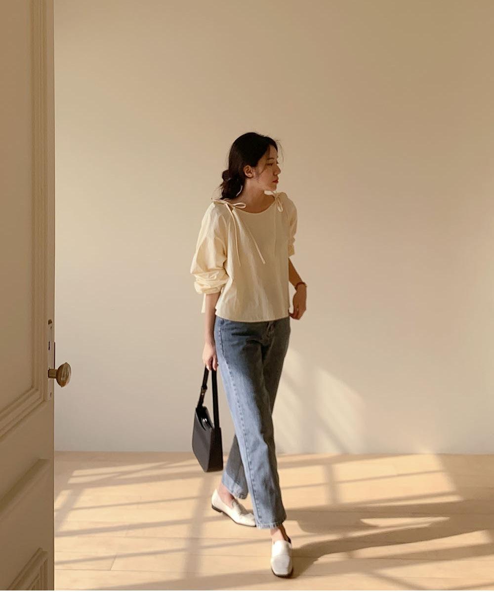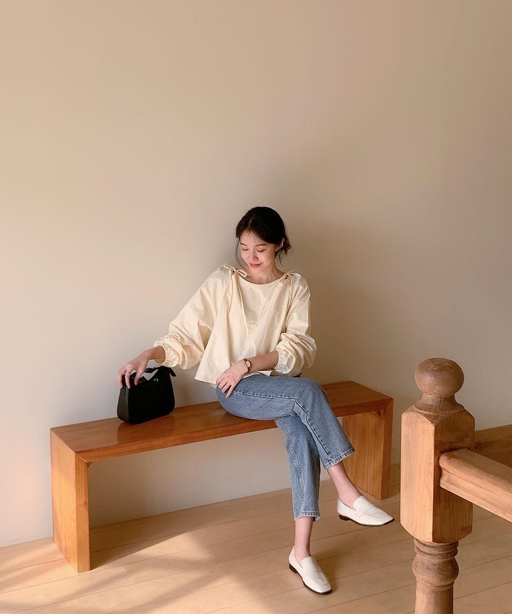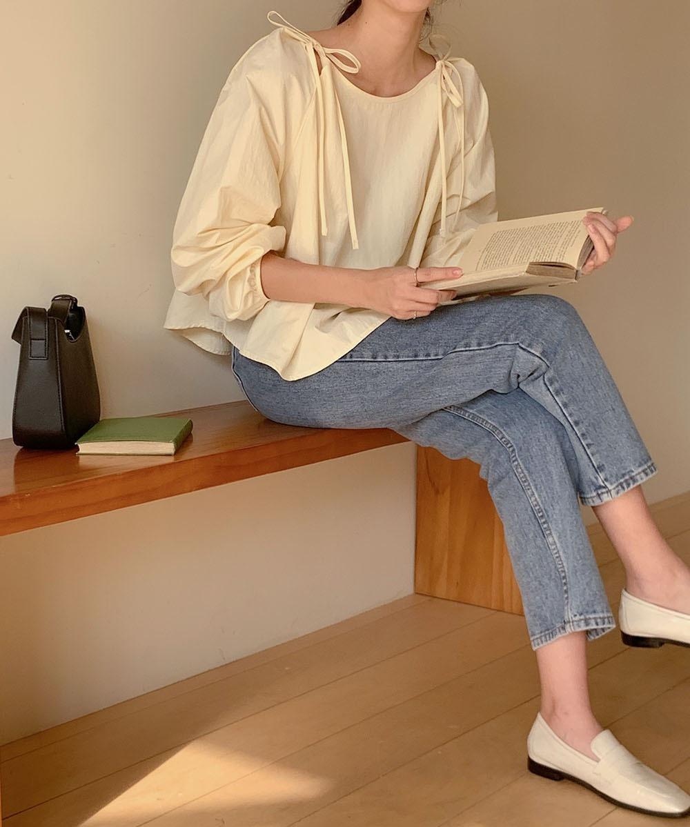 Camisa holgada con protección solar y mangas con lazo en los hombros, estilo coreano chic de primavera y estilo fresco.