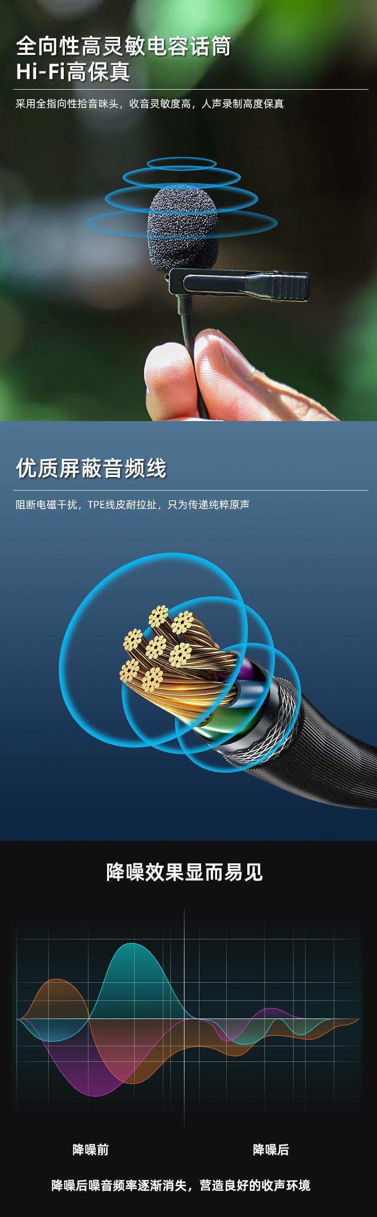 Adopta una cápsula de micrófono de captación omnidireccional con alta sensibilidad de sonido y grabación vocal de alta fidelidad.