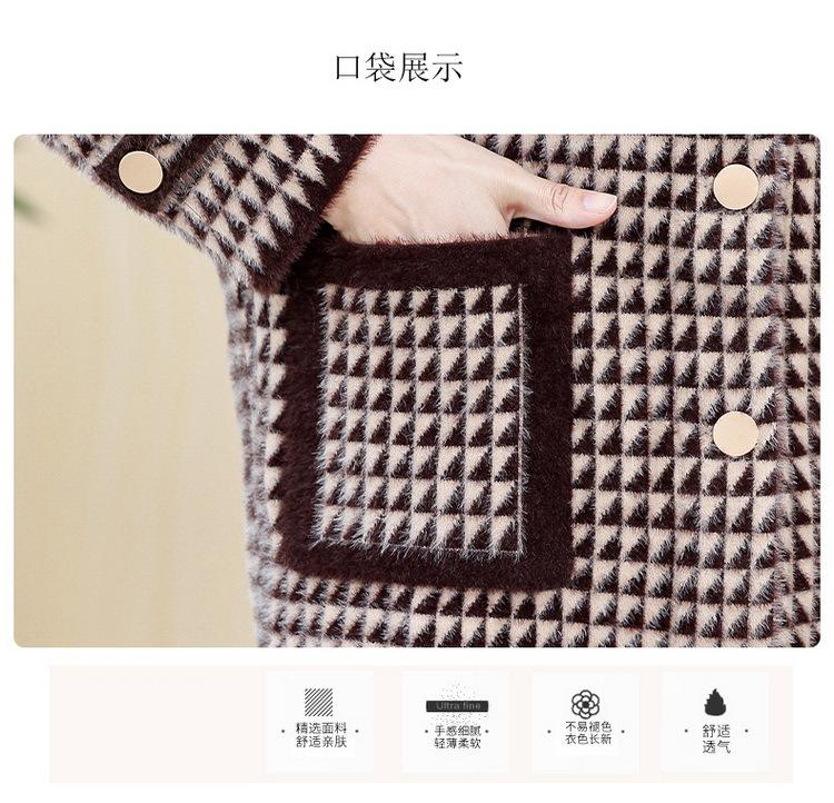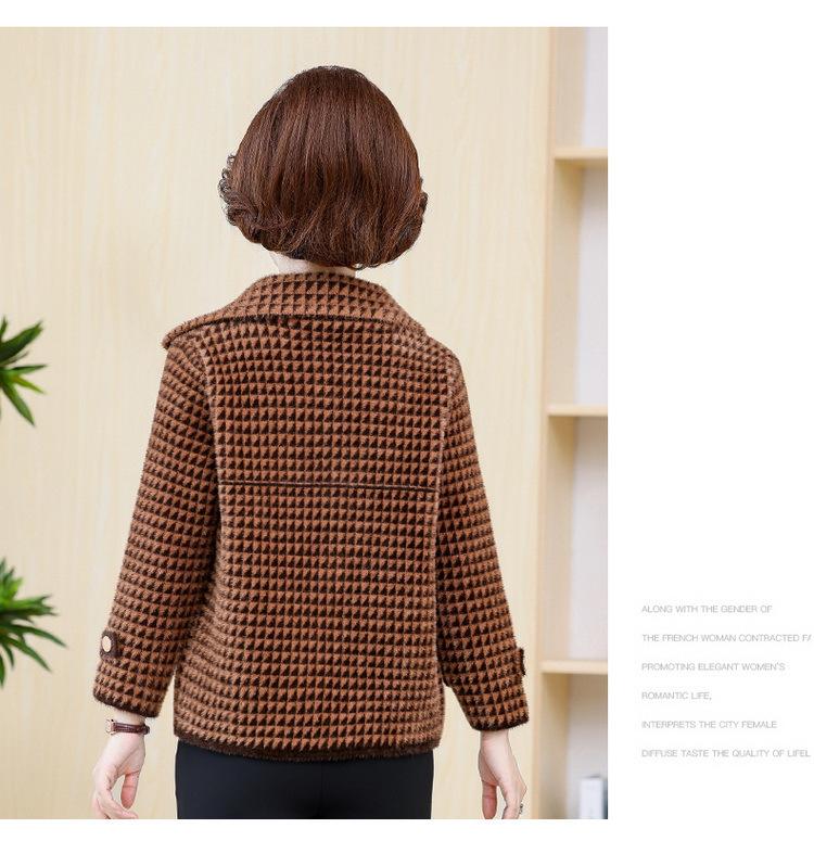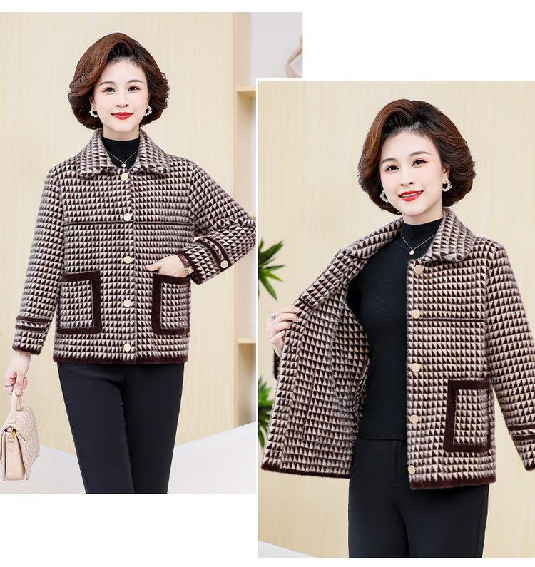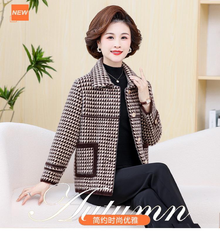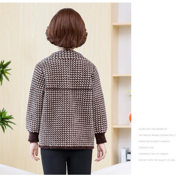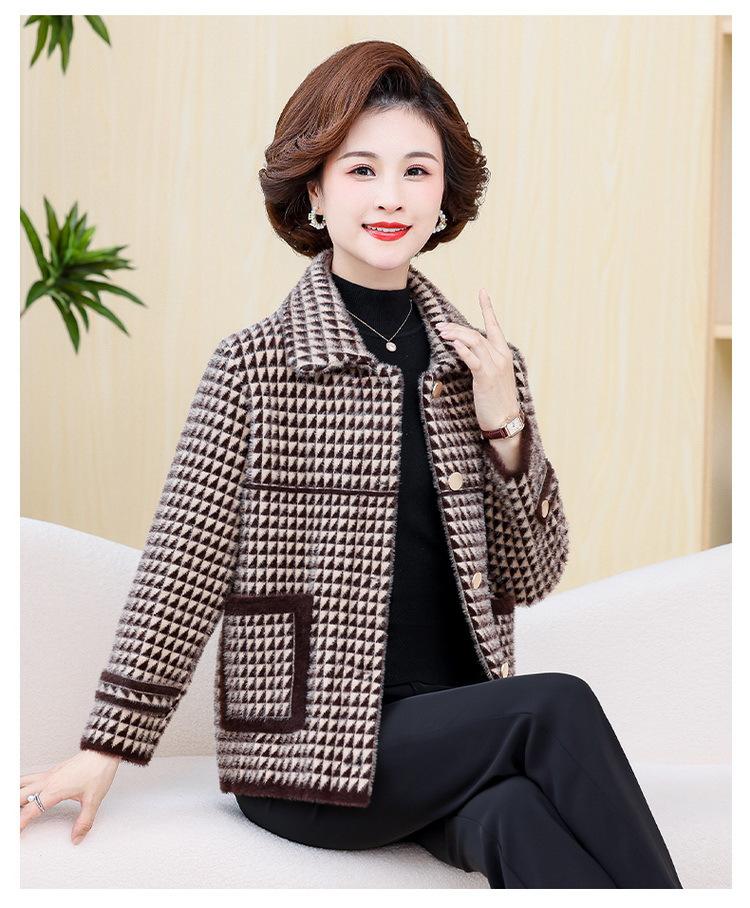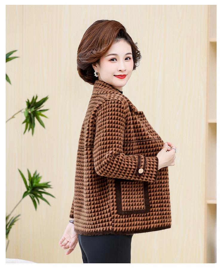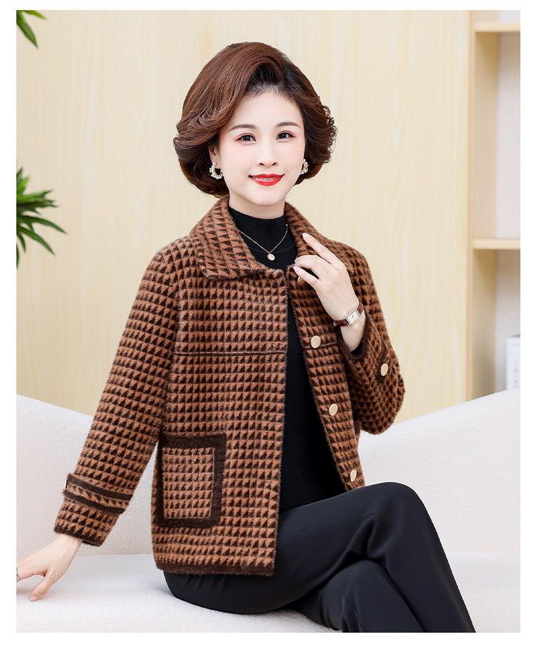 Abrigo Corto de Otoño Tartán para Mujeres de Mediana Edad y Mayores, Cárdigan de Punto de Moda de Terciopelo Imitación Visón con Estampado de Pata de Gallo