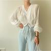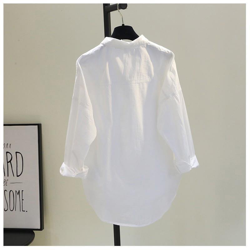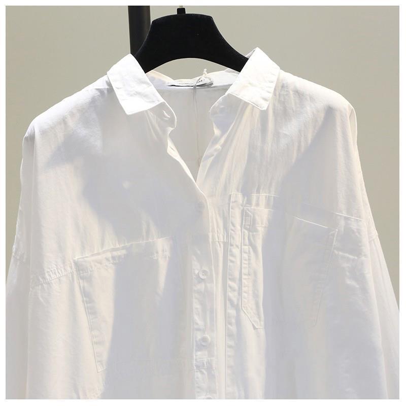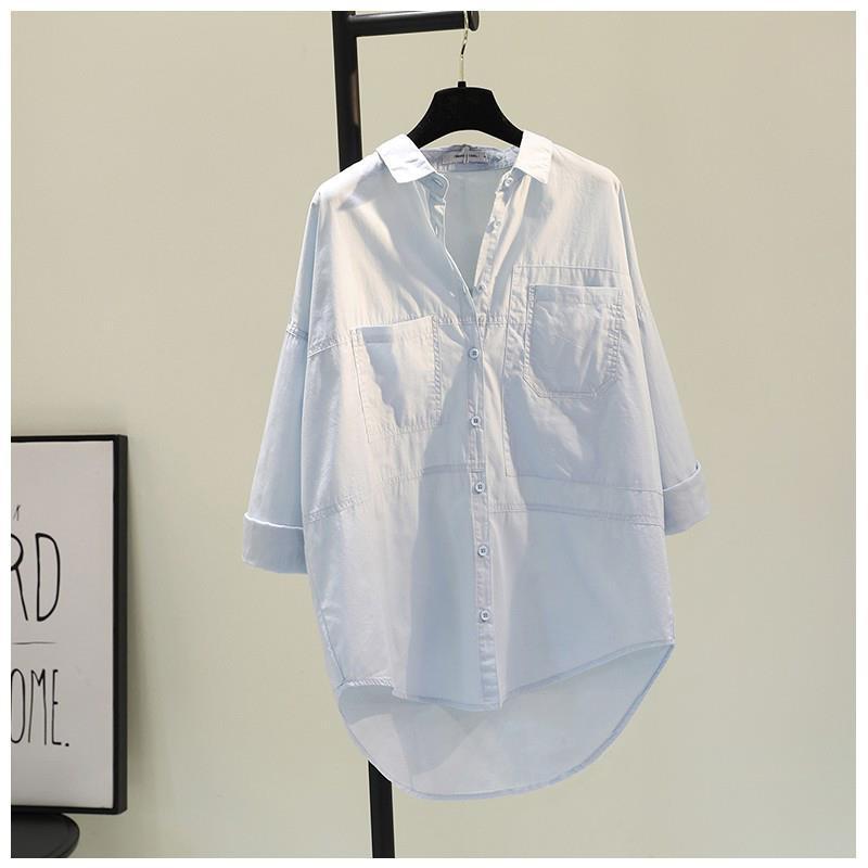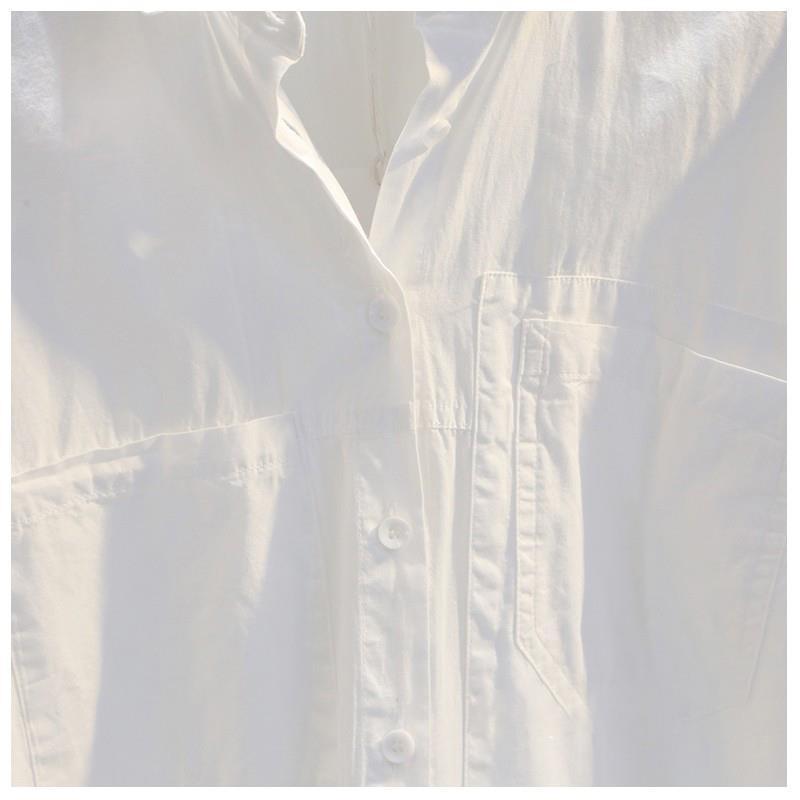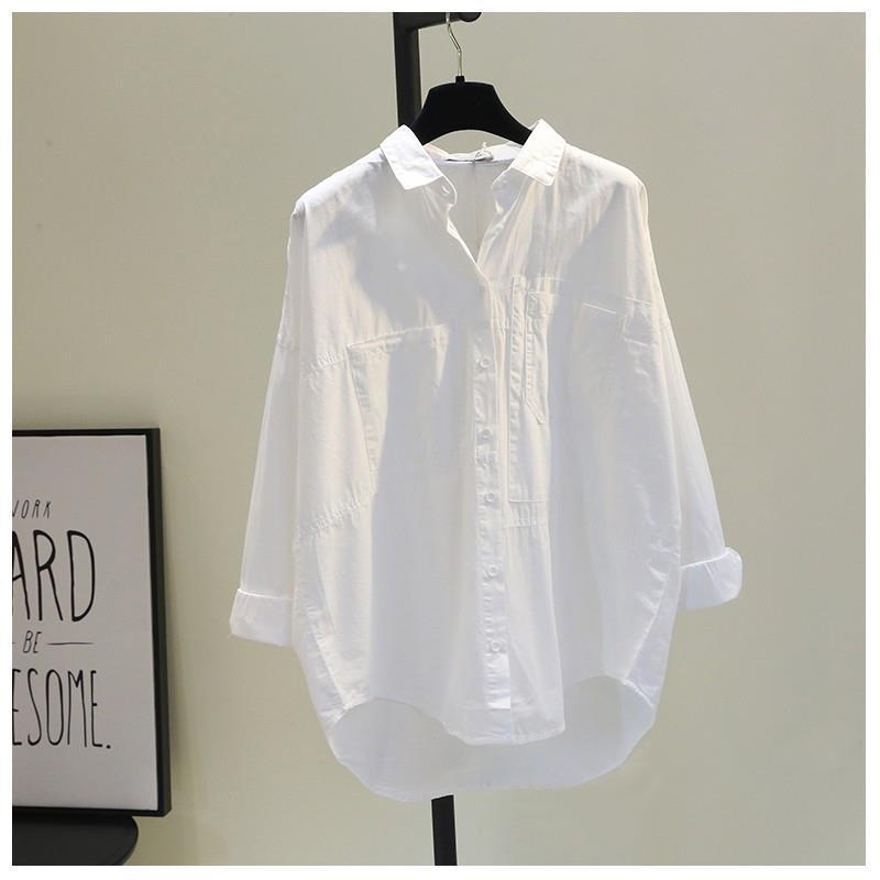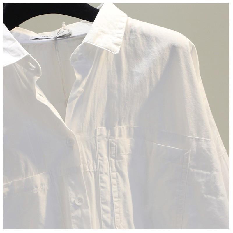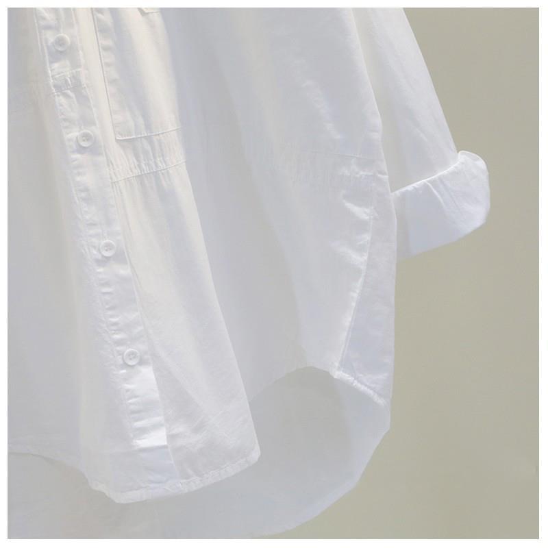 Camisa informal holgada de estilo coreano para mujer, estilo bf artístico, con doble bolsillo delantero, corta y larga en la espalda, de algodón blanco, de moda para primavera 2022
