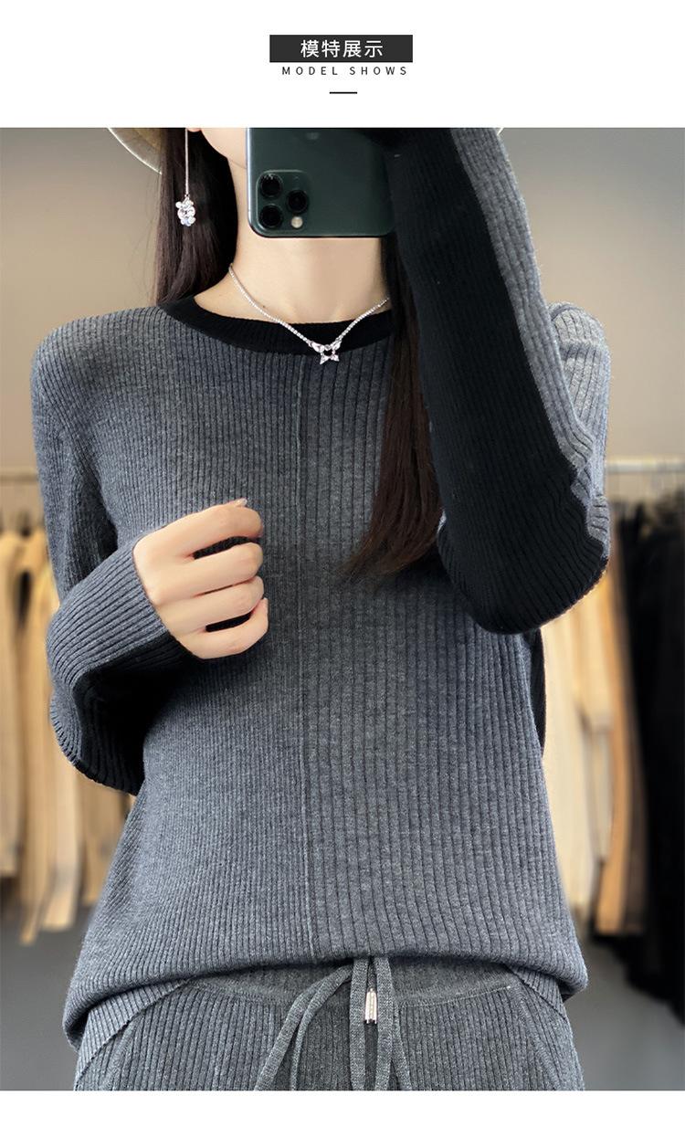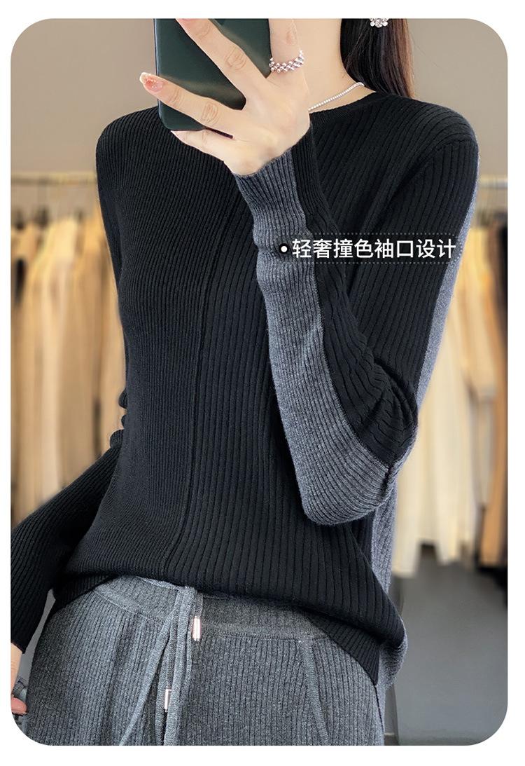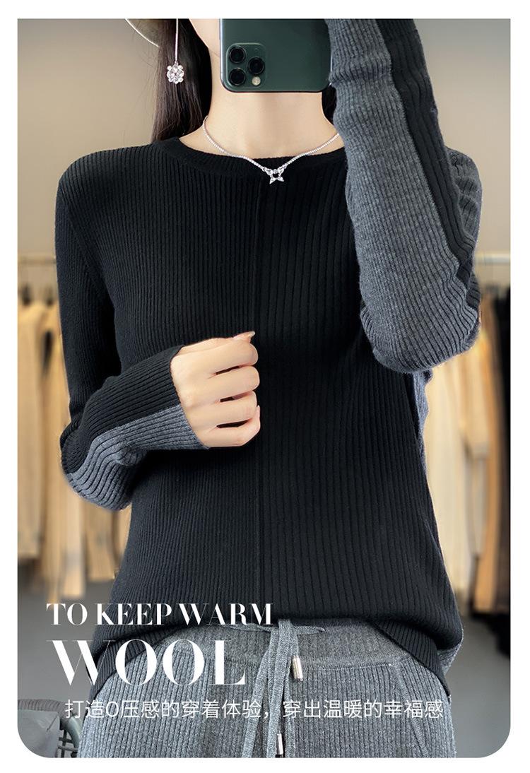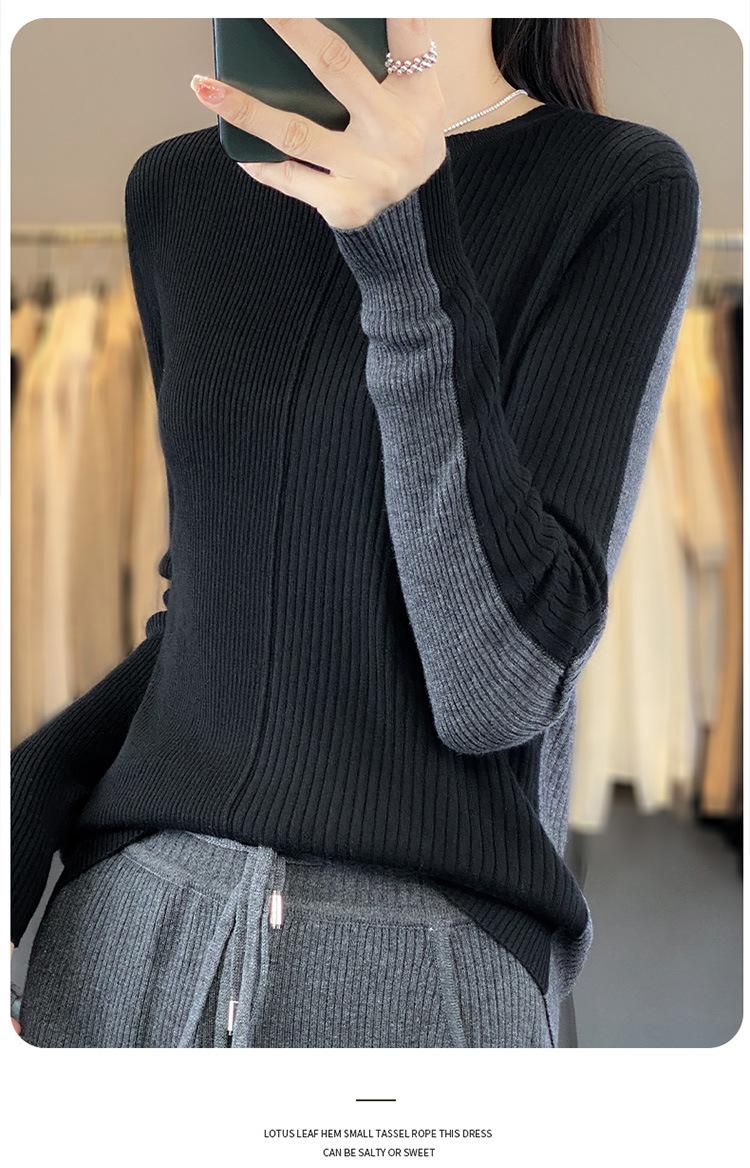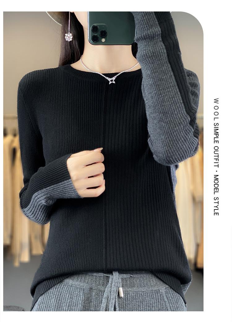 Suéter de lana con cuello redondo y diseño de contraste de color para mujer, nuevo suéter adelgazante versátil de primavera, camiseta de manga larga con parte inferior.
