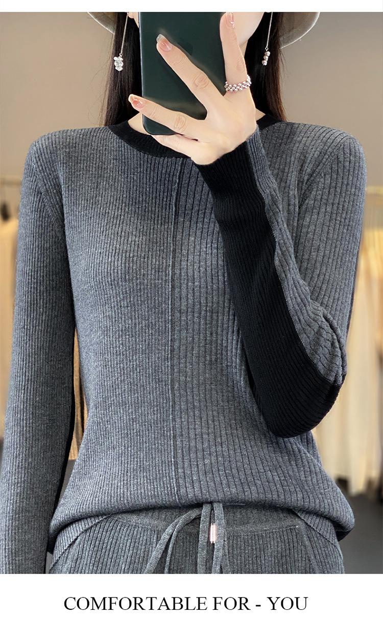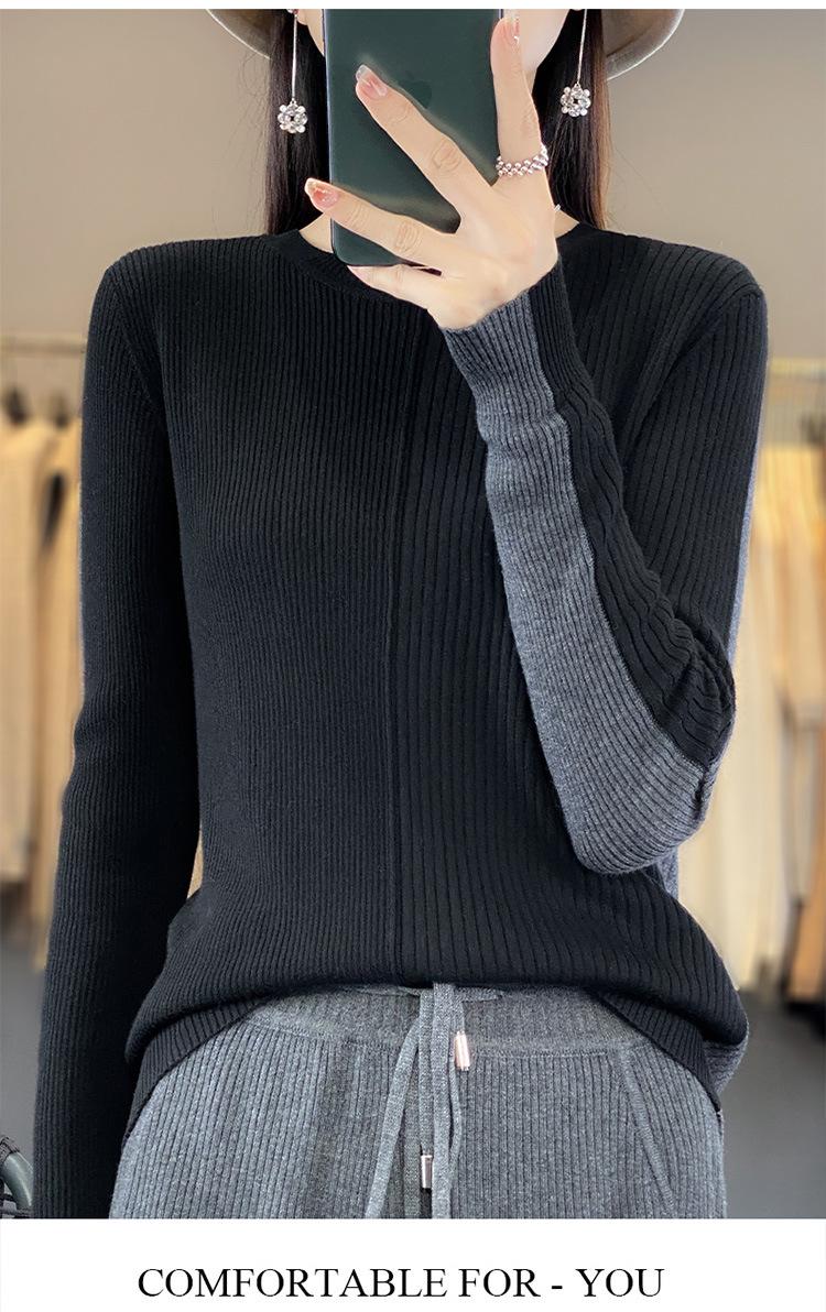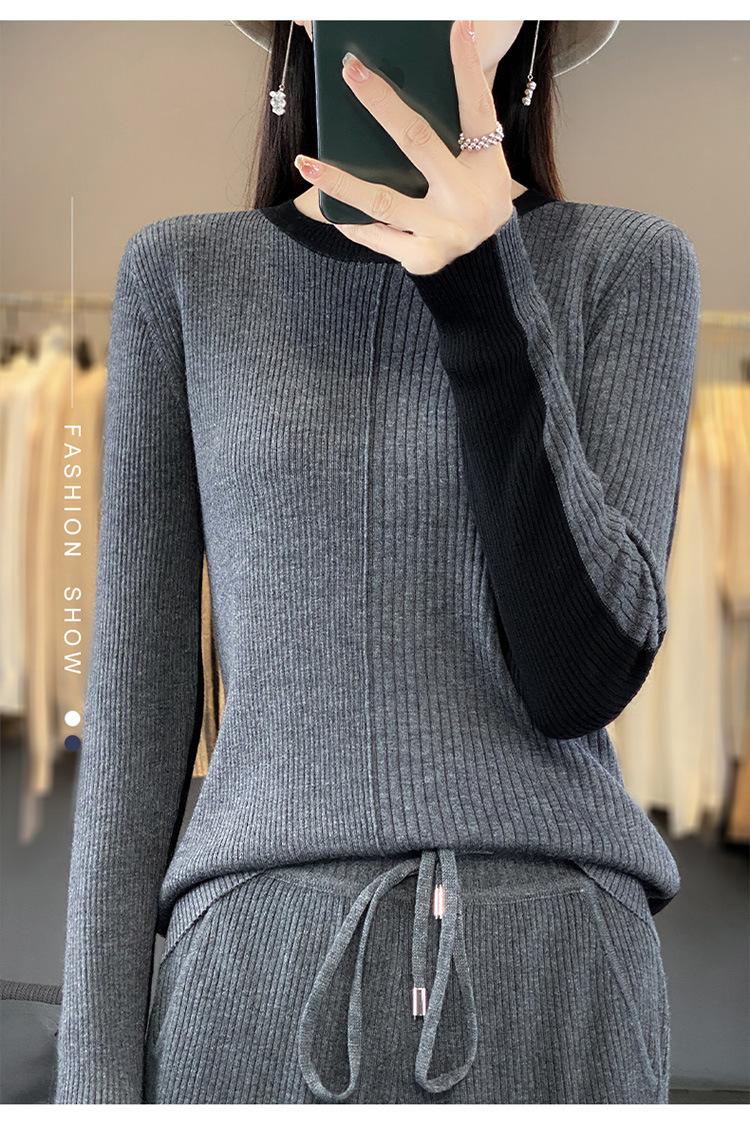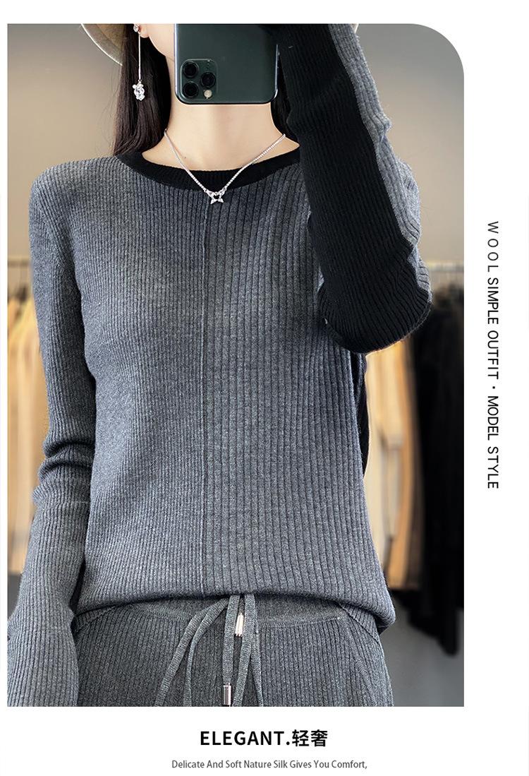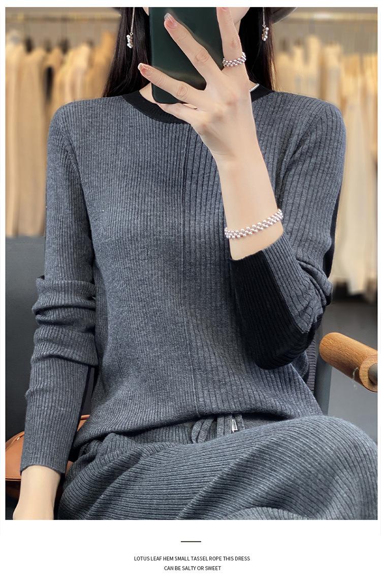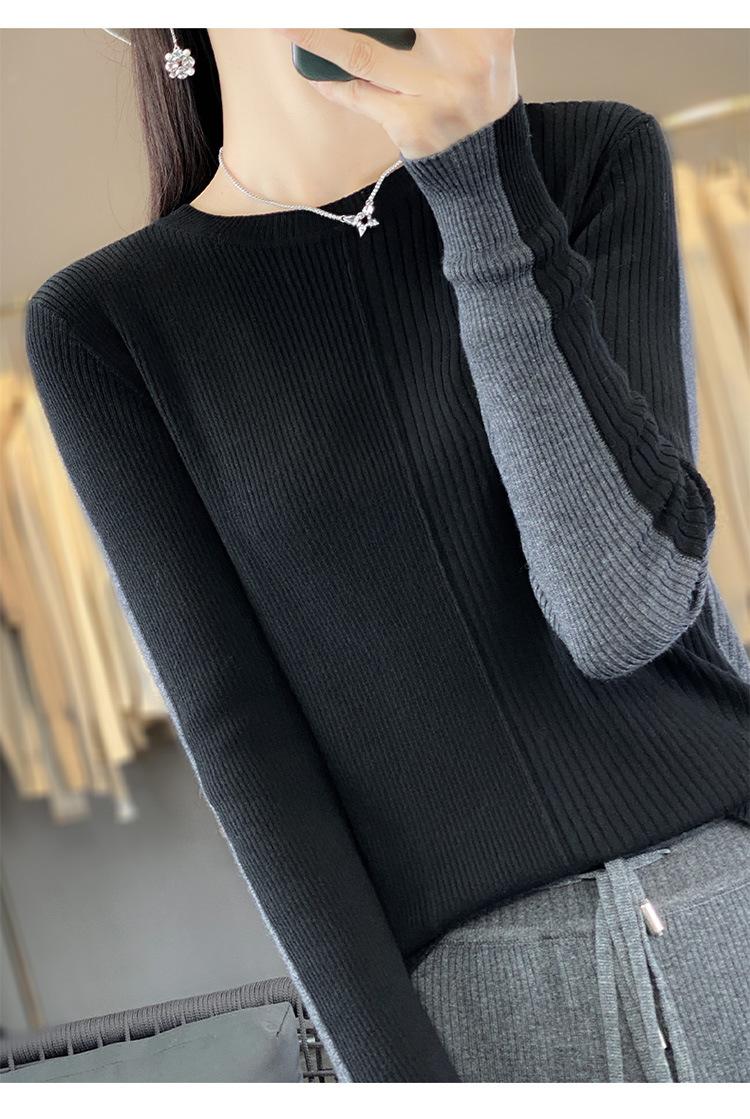 Suéter de lana con cuello redondo y diseño de contraste de color para mujer, nuevo suéter adelgazante versátil de primavera, camiseta de manga larga con parte inferior.