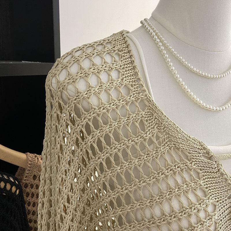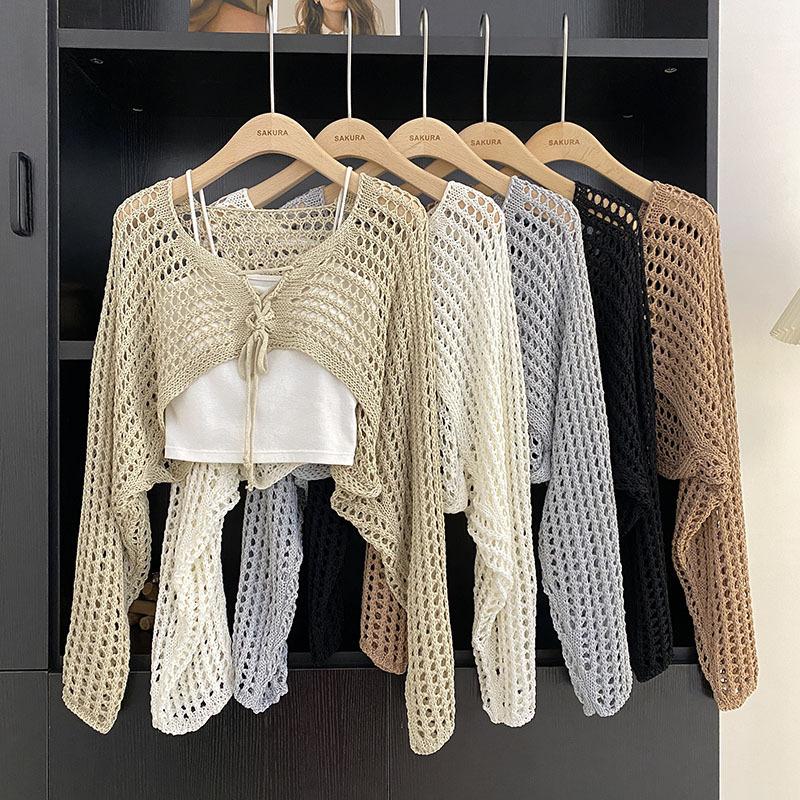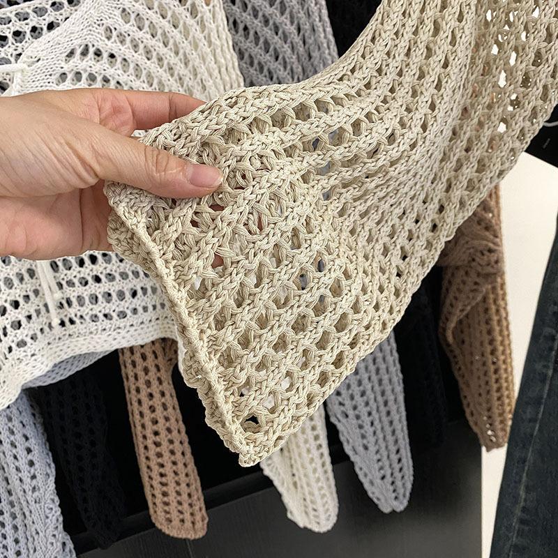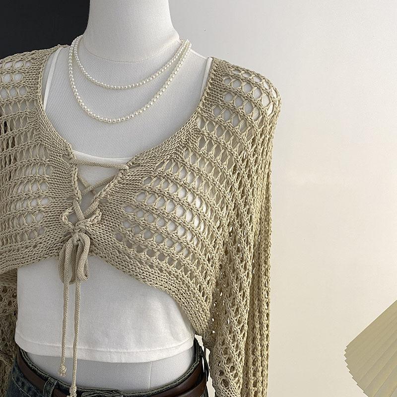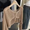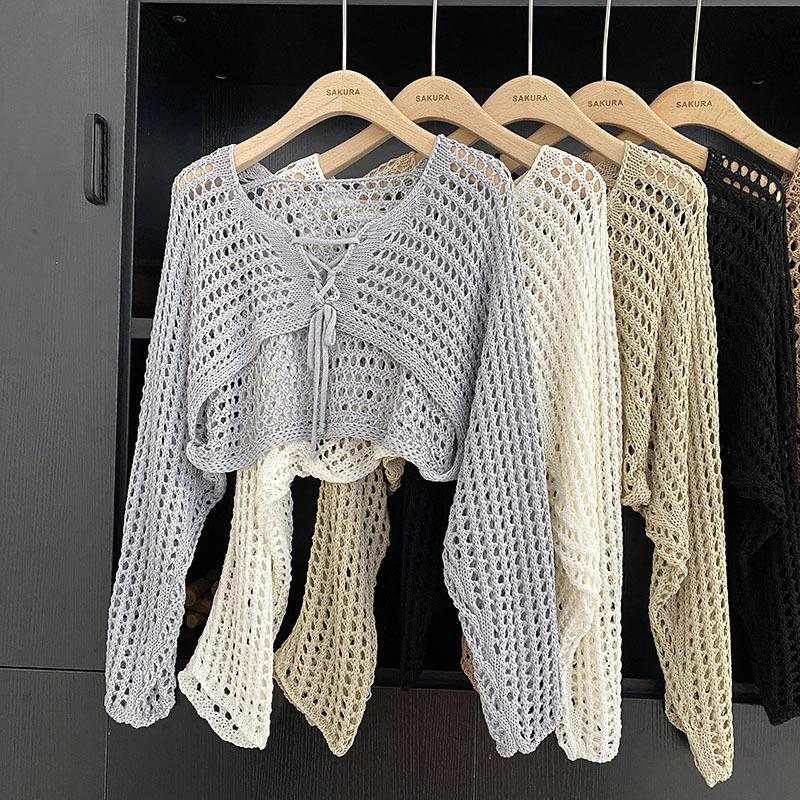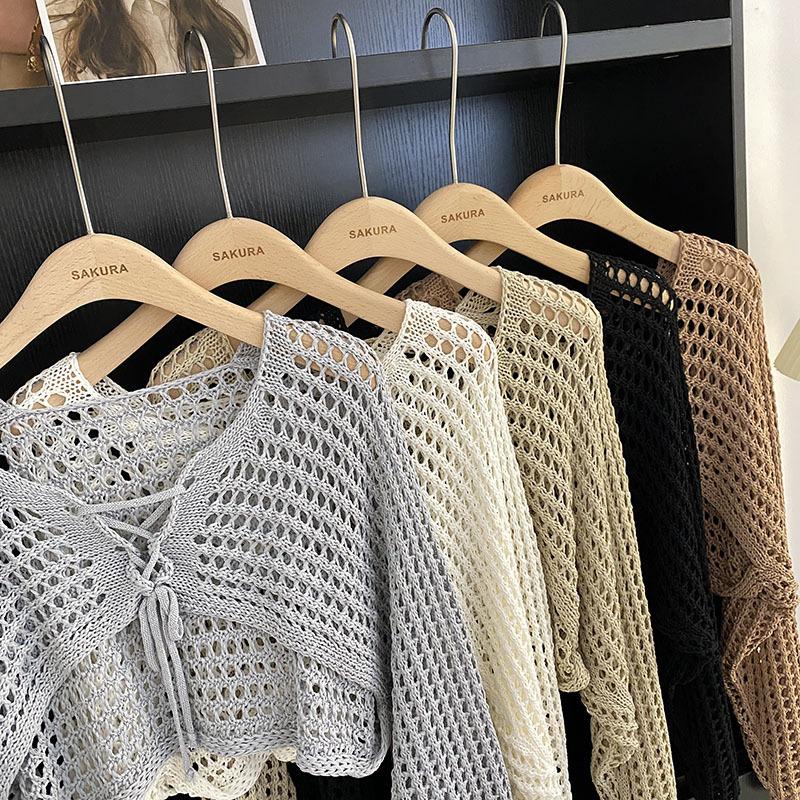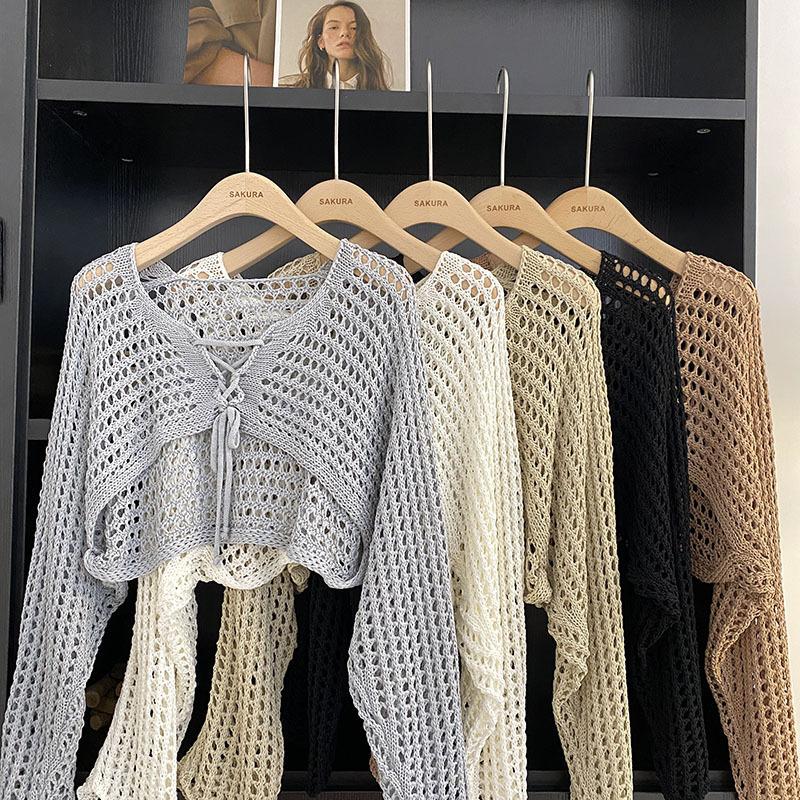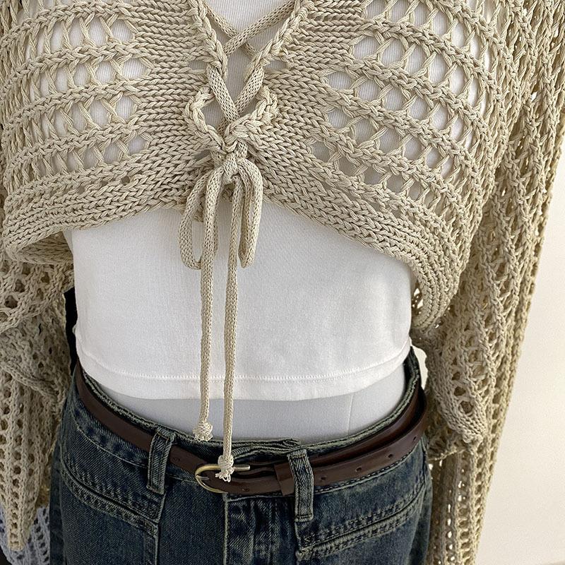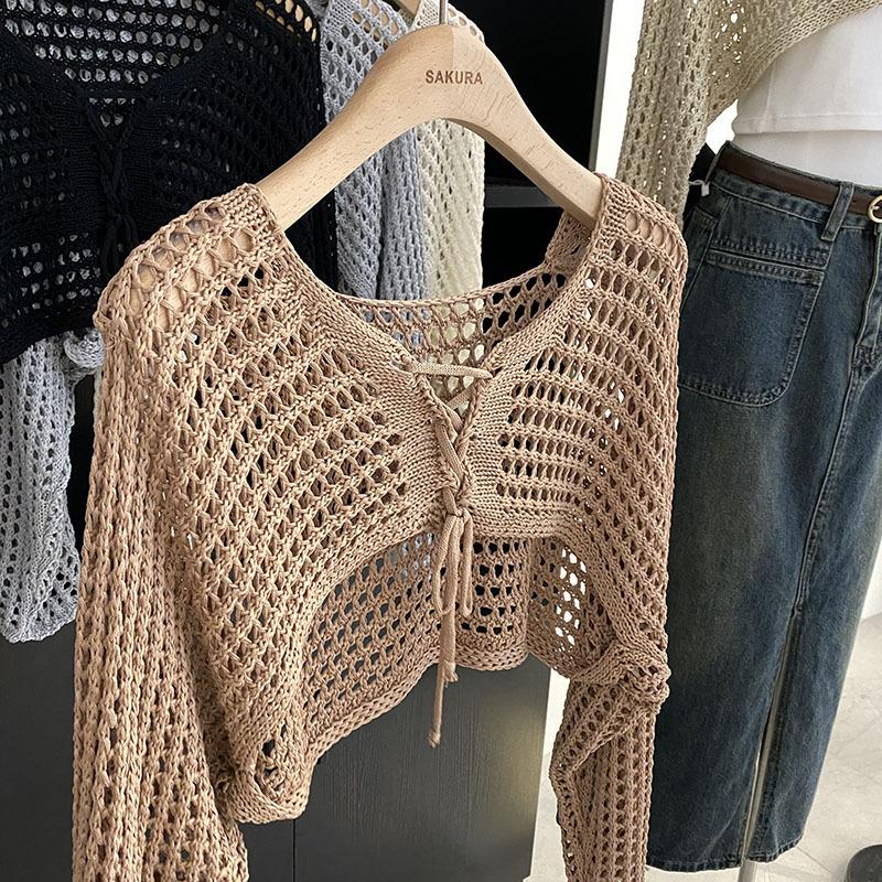 Suéter Pulóver Calado con Cordones Corto Ajustado para Mujer Verano 2024 Nuevo Estilo Coreano Combinable Top Ajustado