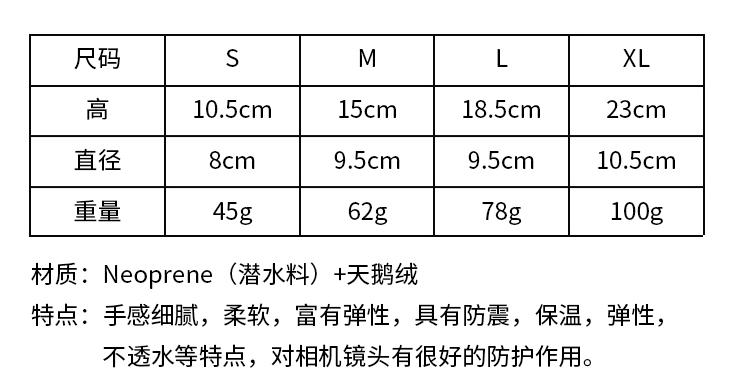 Características: Delicado, suave, elástico, a prueba de golpes, aislante del calor, elástico, impermeable, etc., y tiene buena protección para lentes de cámara.