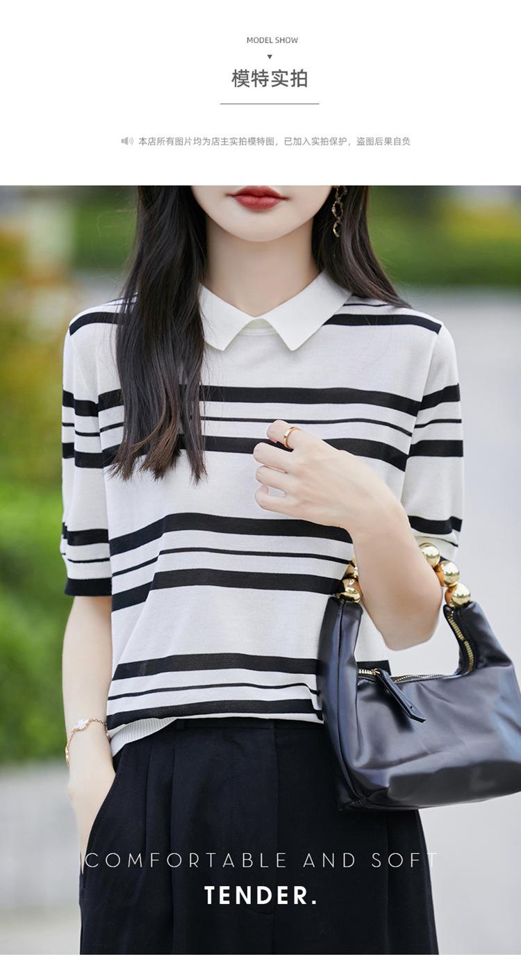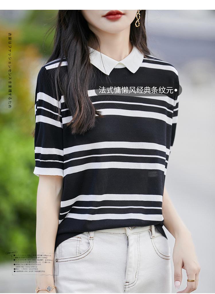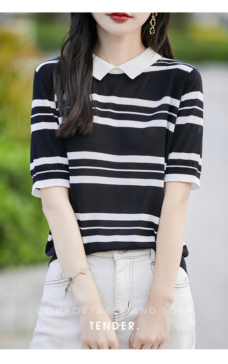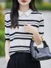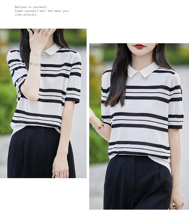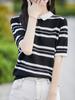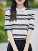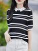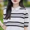 Playera de punto de manga corta para mujer 2024 verano nueva con solapa tipo polo a rayas Lyocell Tencel moda coreana