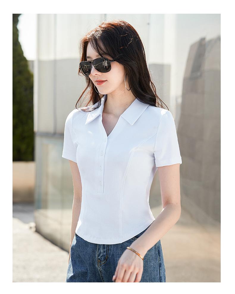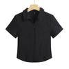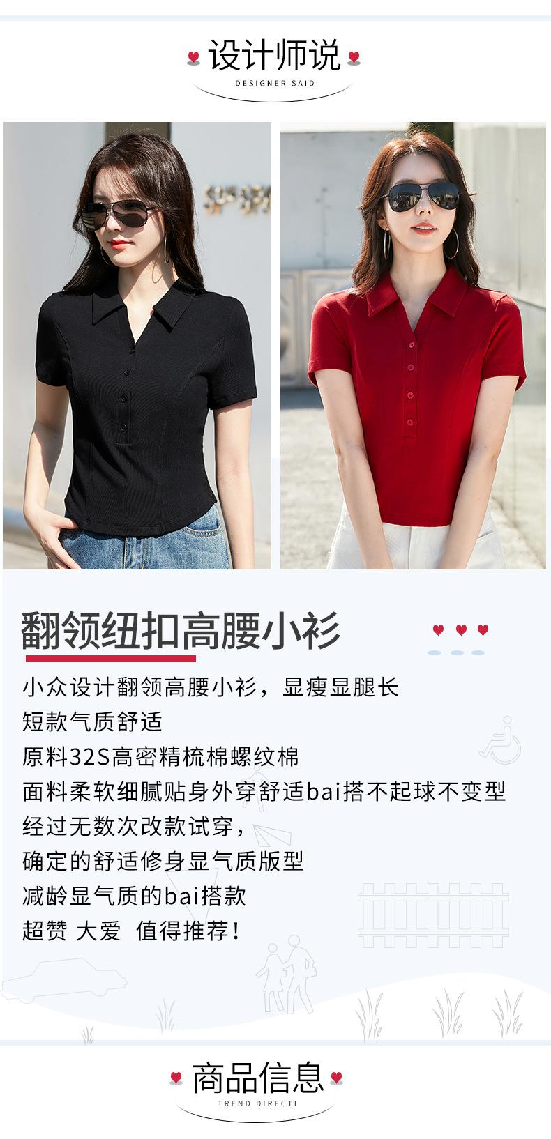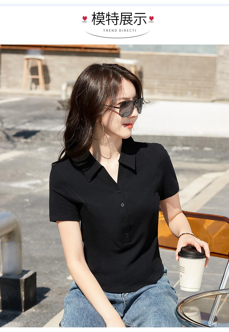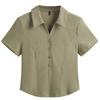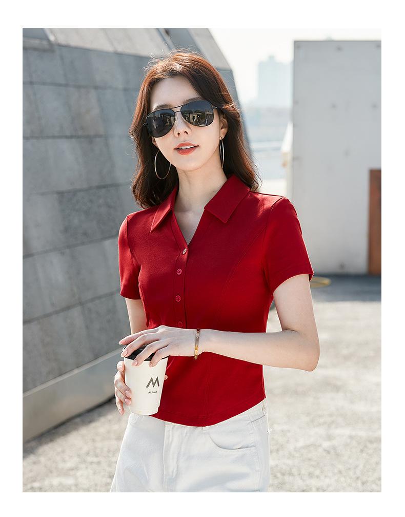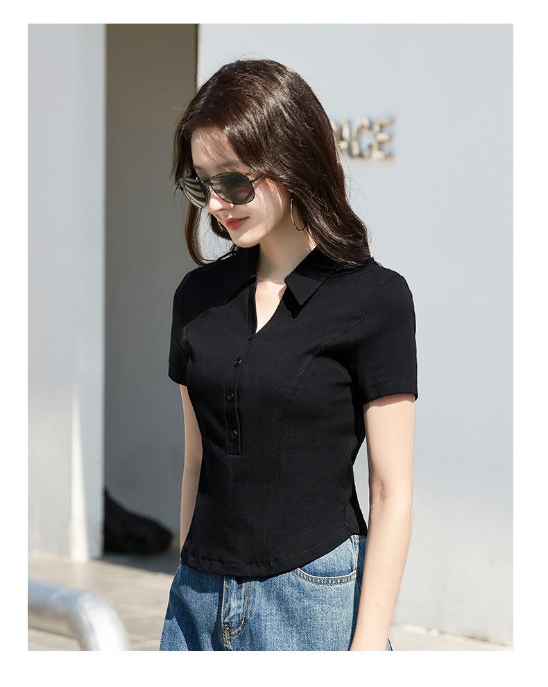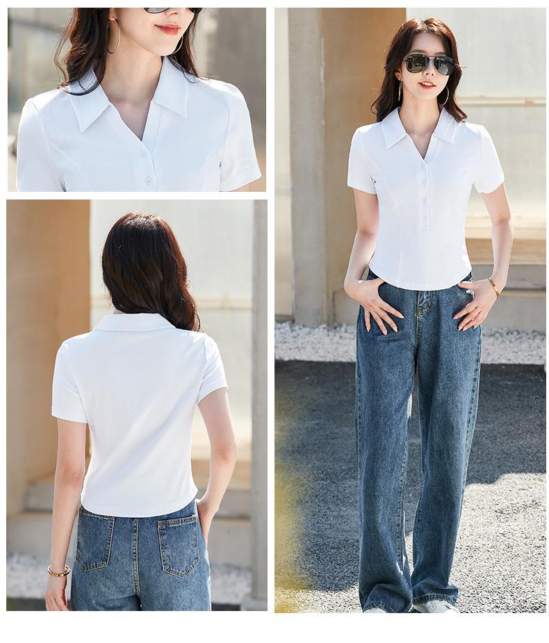 Camiseta de manga corta con solapa y botones, estilo coreano, elegante, sencilla, corta, de cintura alta y aspecto ajustado, para verano
