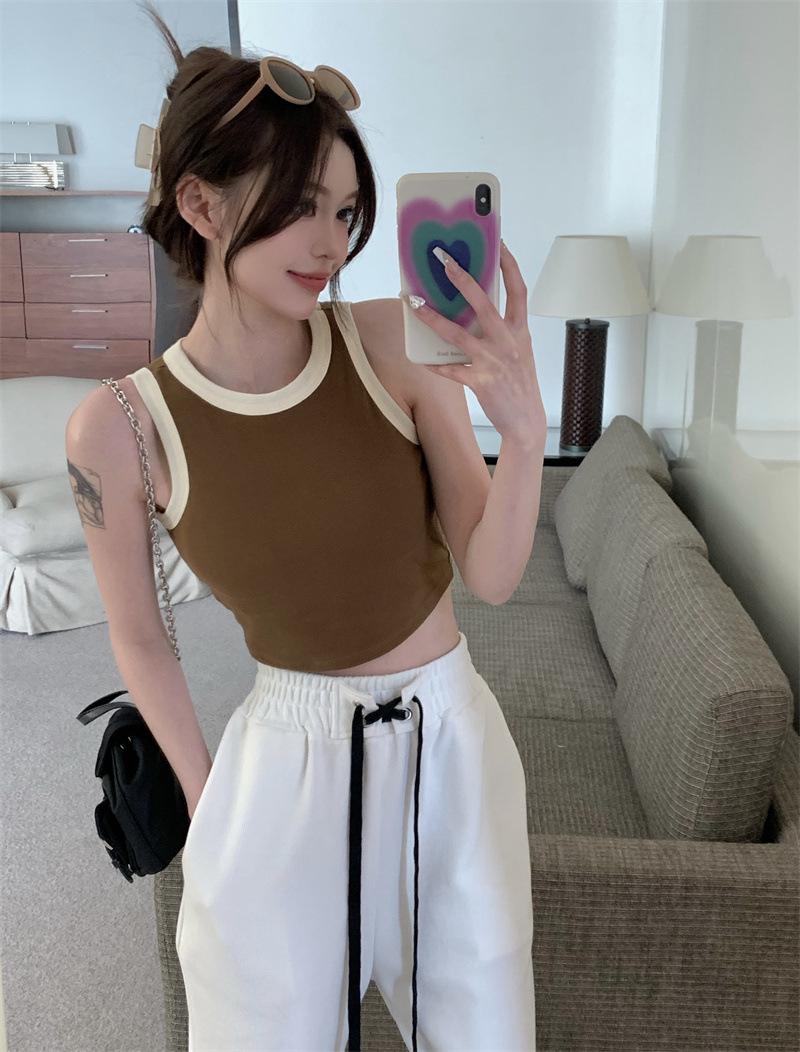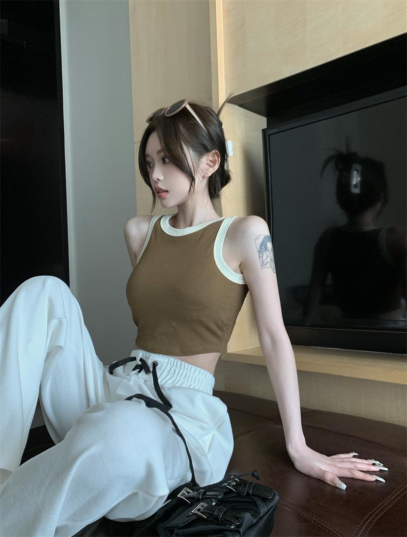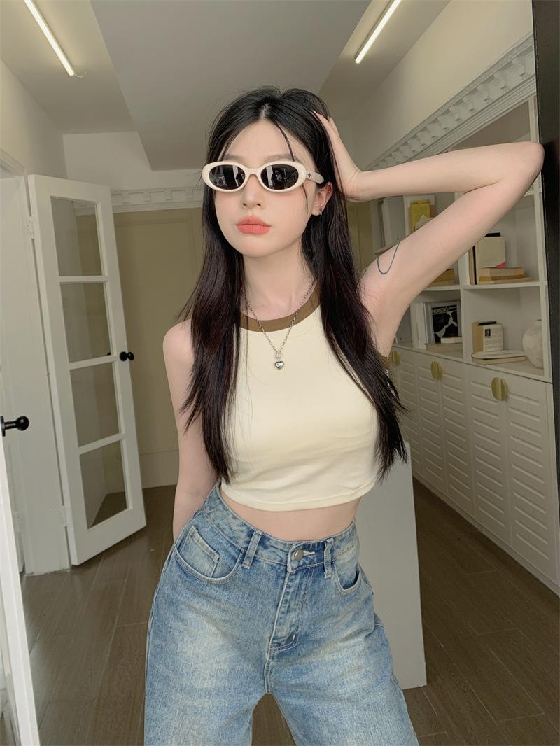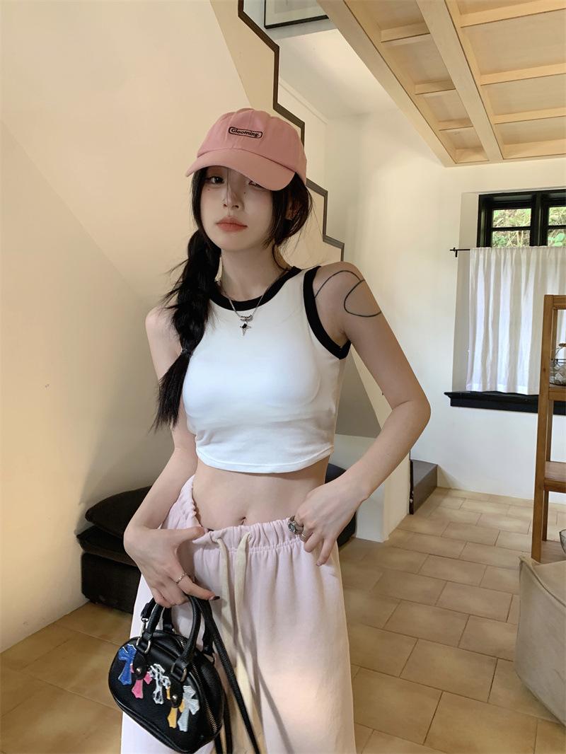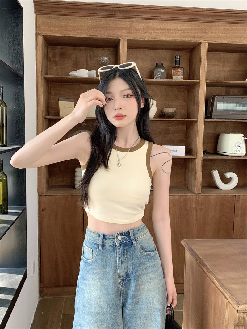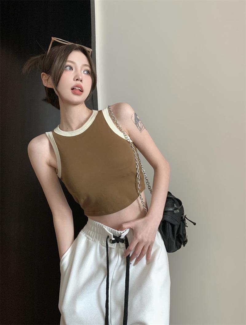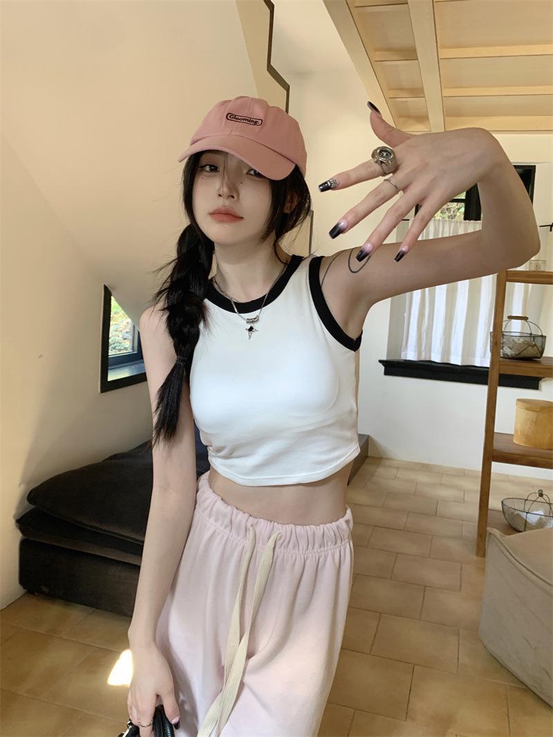 Camisola pequeña sin mangas con base de color en contraste dulce para mujer, de verano, con espalda hermosa, ajustada, interior corta, con ombligo al descubierto, sexy.