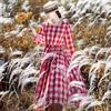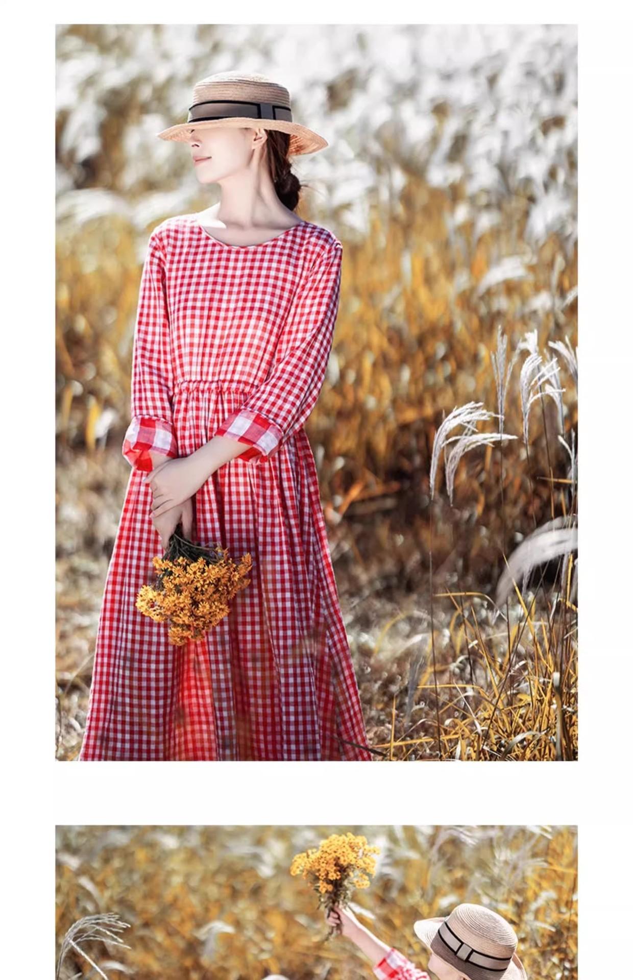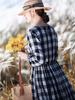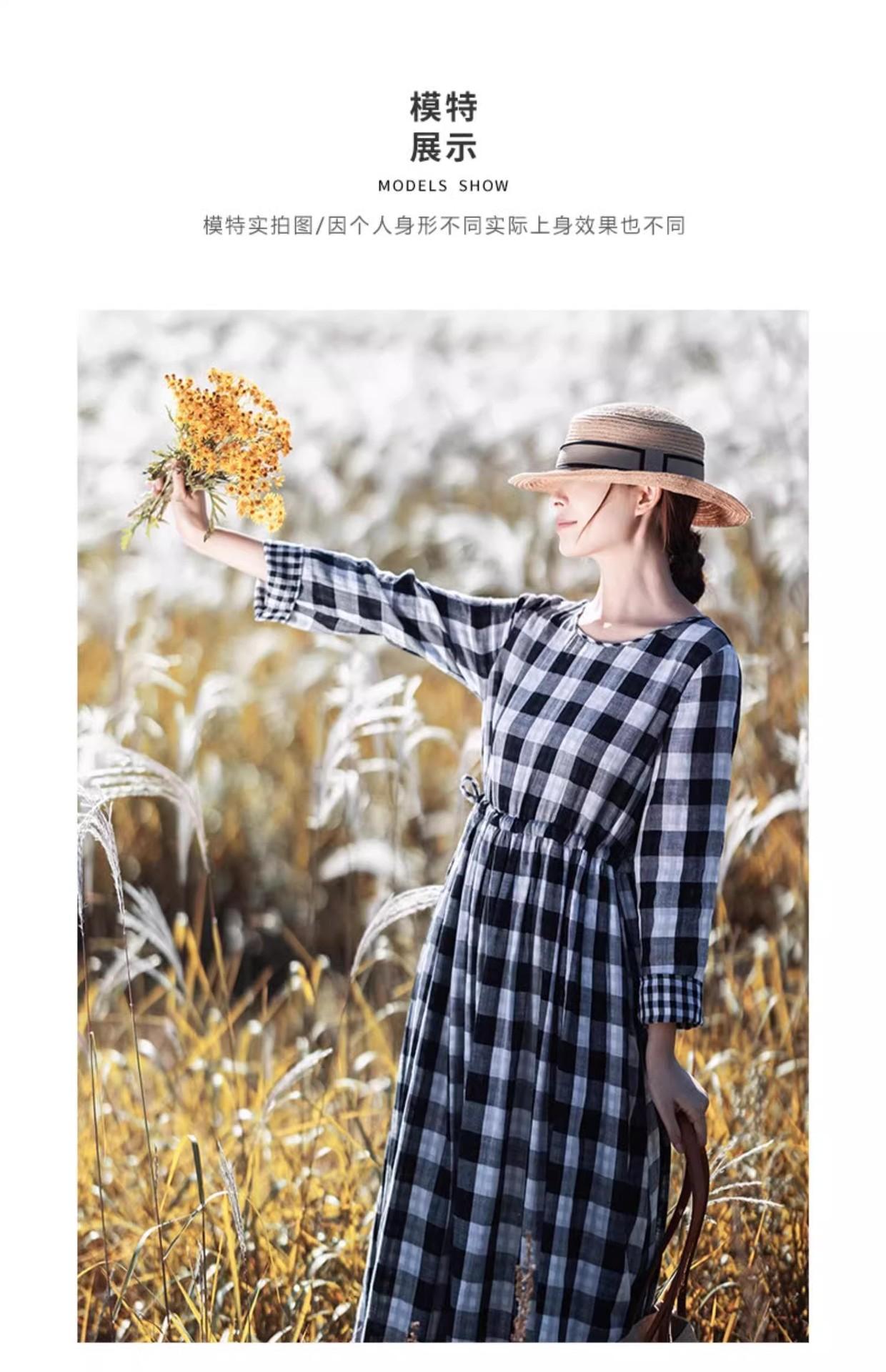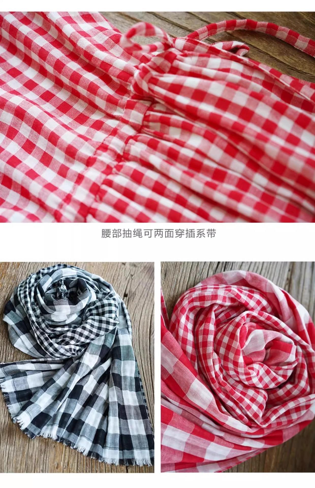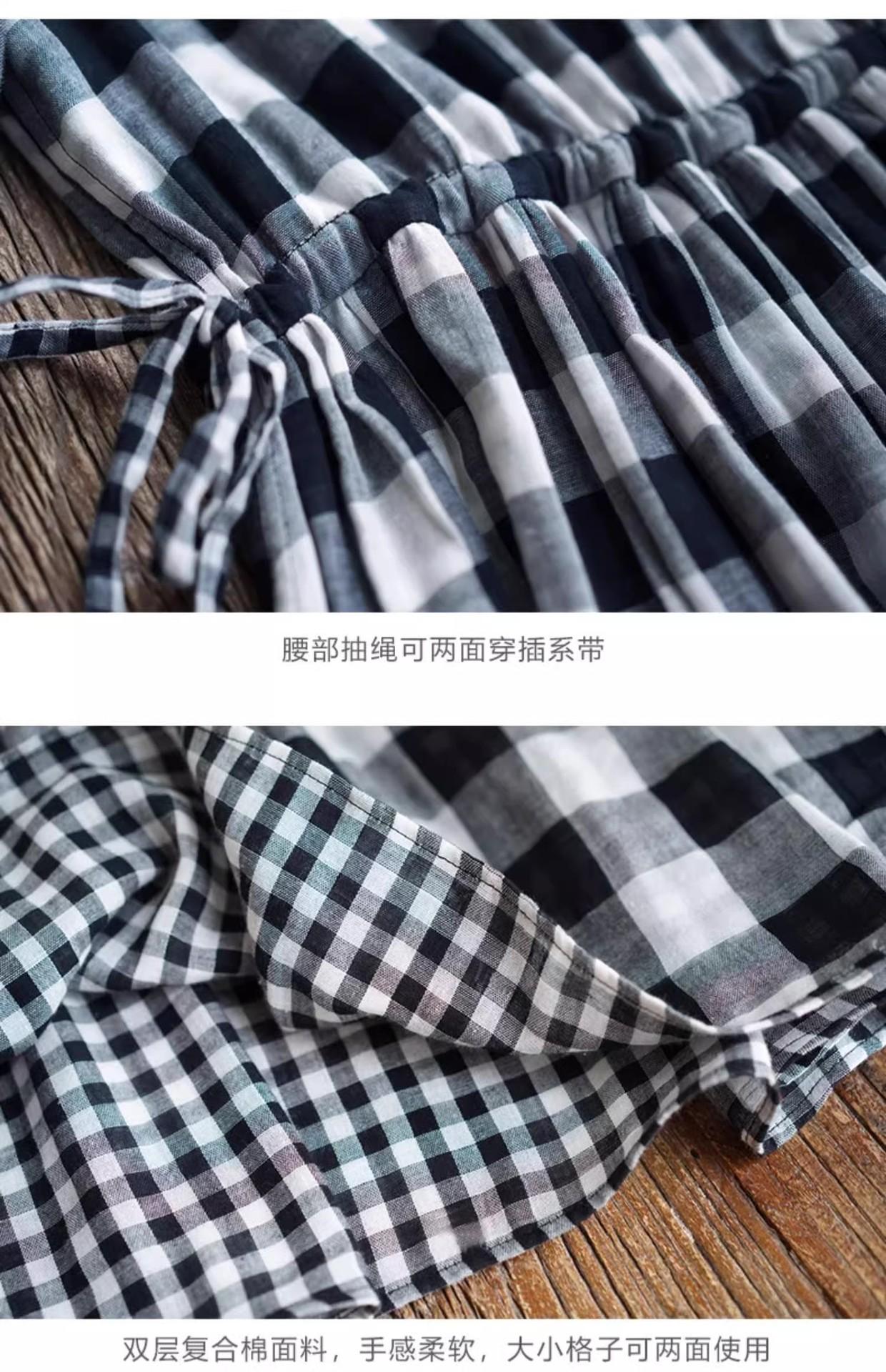 Vestido de Cuadros de Algodón Compuesto de Doble Capa Primavera 2024 Nuevo Suelto Literario Cintura con Cordones Falda Larga de Bajo Amplio para Mujer