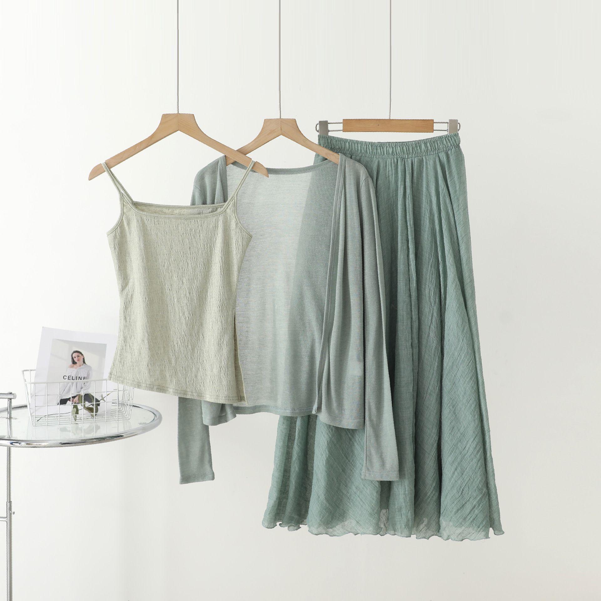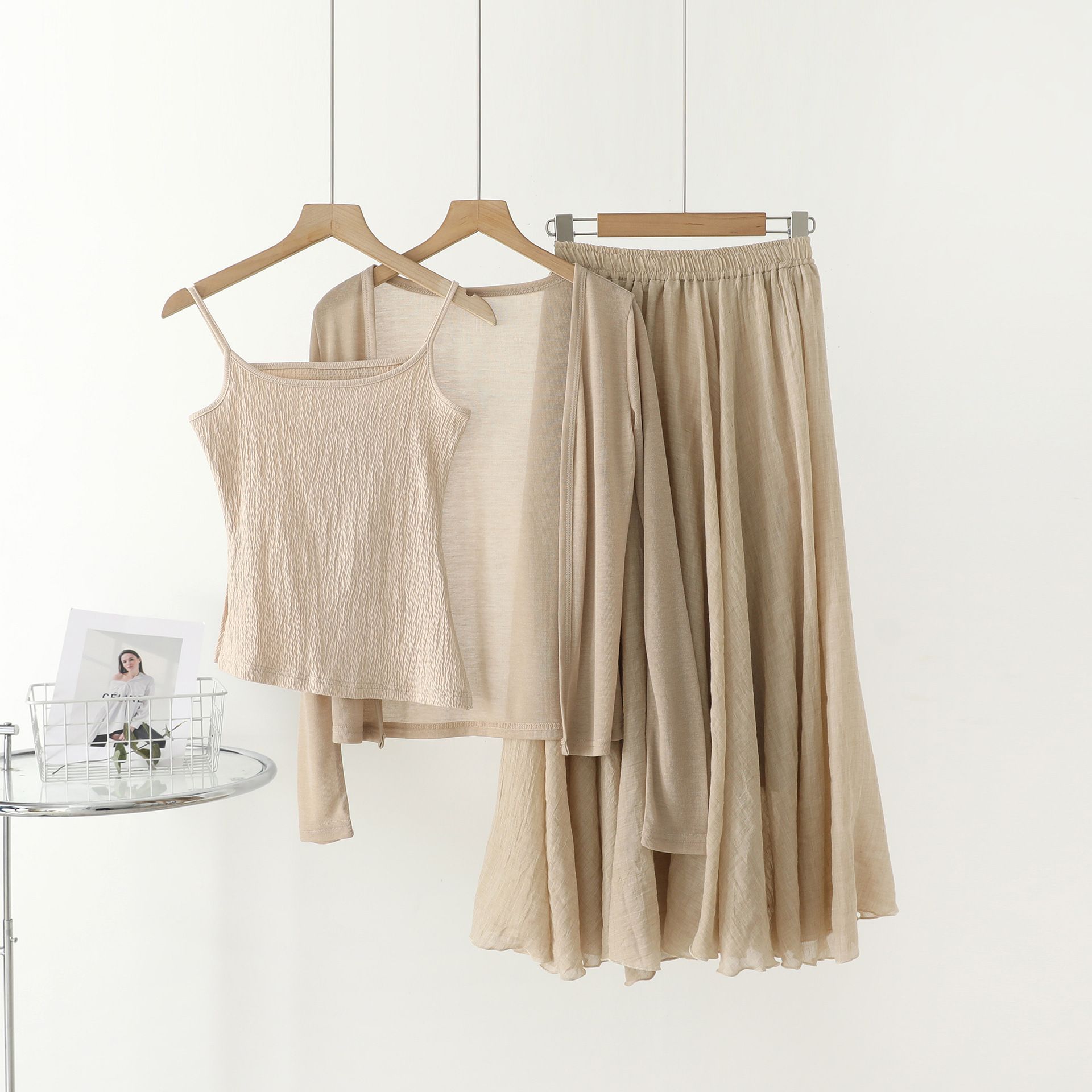 Primavera y Verano 2025 Nuevo Estilo Bosque Falda Larga con Tirantes Estilo Resort Conjunto de Tres Piezas Historia del Bosque Cárdigan Falda Sol Otoño