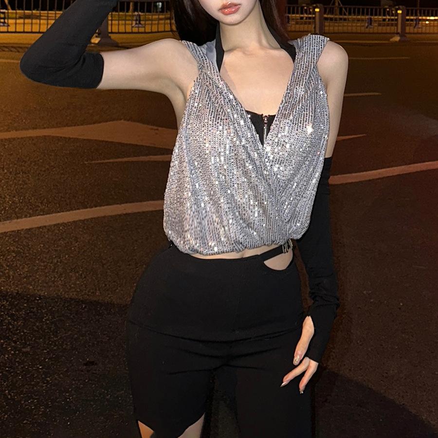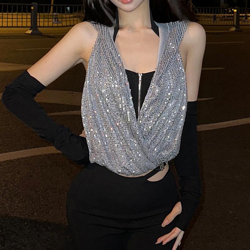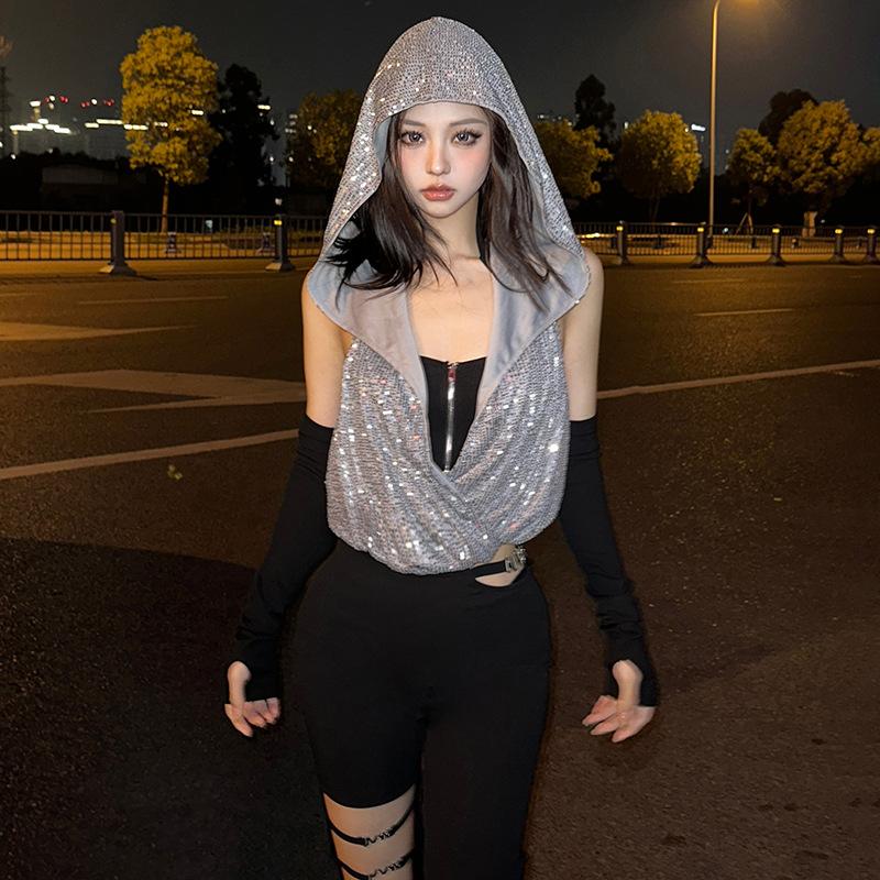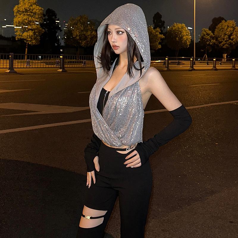 Estilo europeo y americano transfronterizo 2023WISH otoño e invierno Nuevo sexy chaleco halter con capucha blusa sin mangas conjunto de dos piezas para mujer