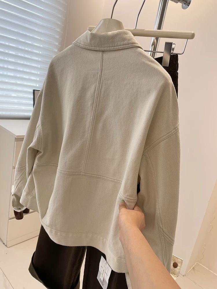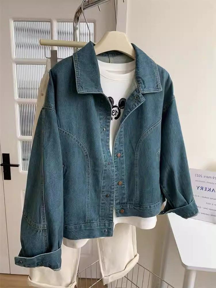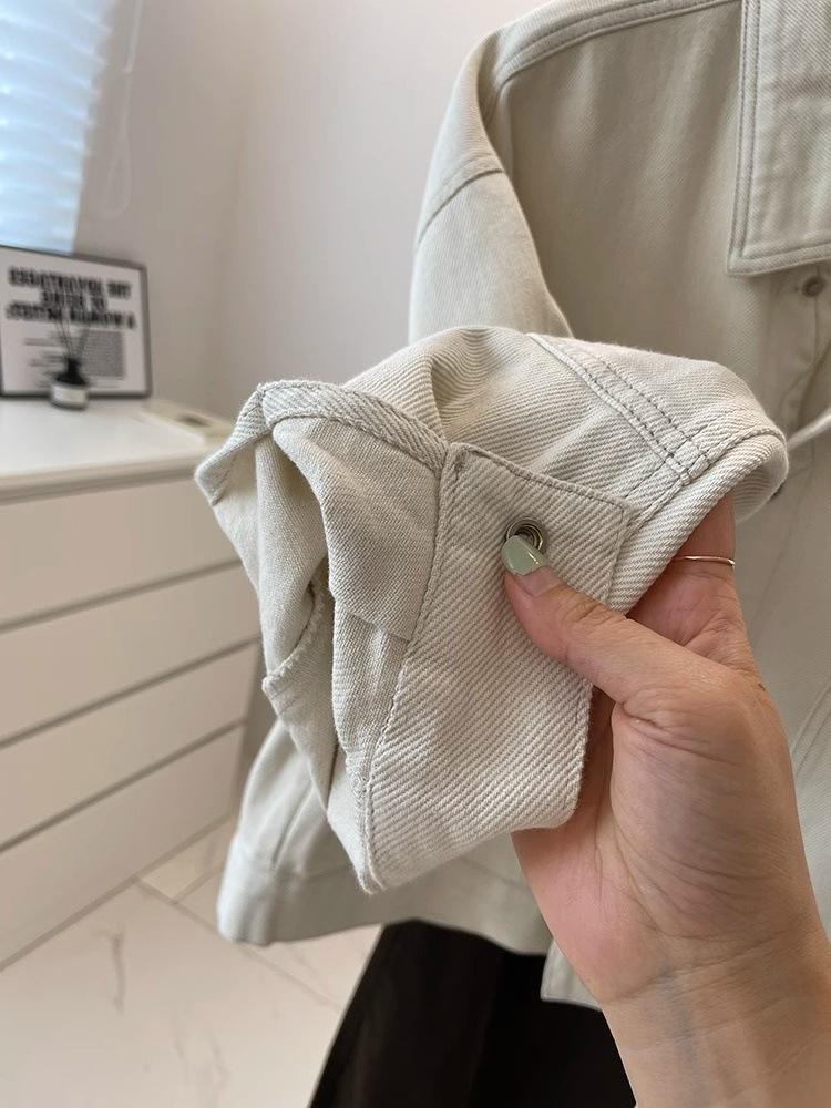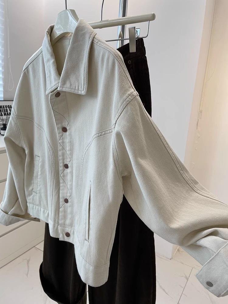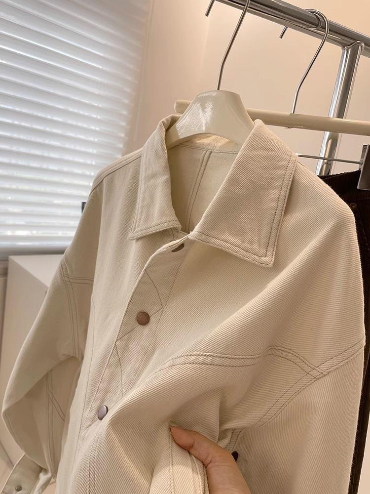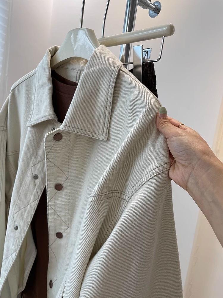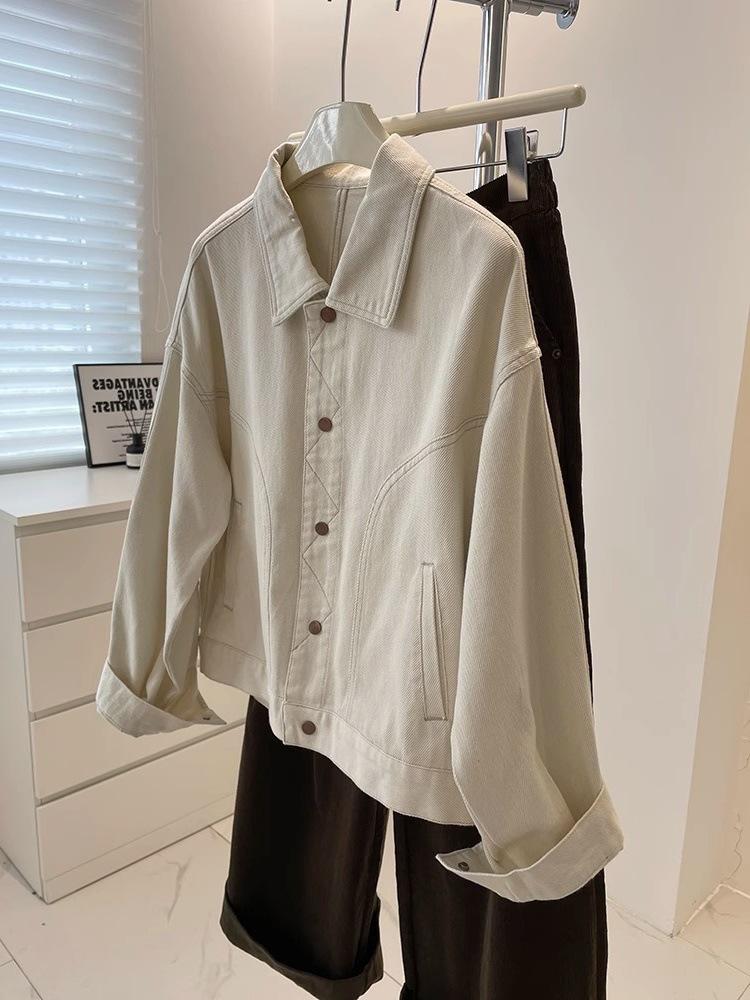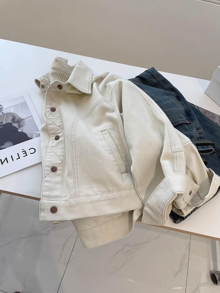 ¡Chamarra de mezclilla beige coreana! Diseño de pespuntes de primavera y otoño Versátil Chaqueta corta casual holgada Top para mujer