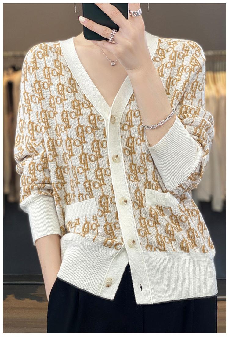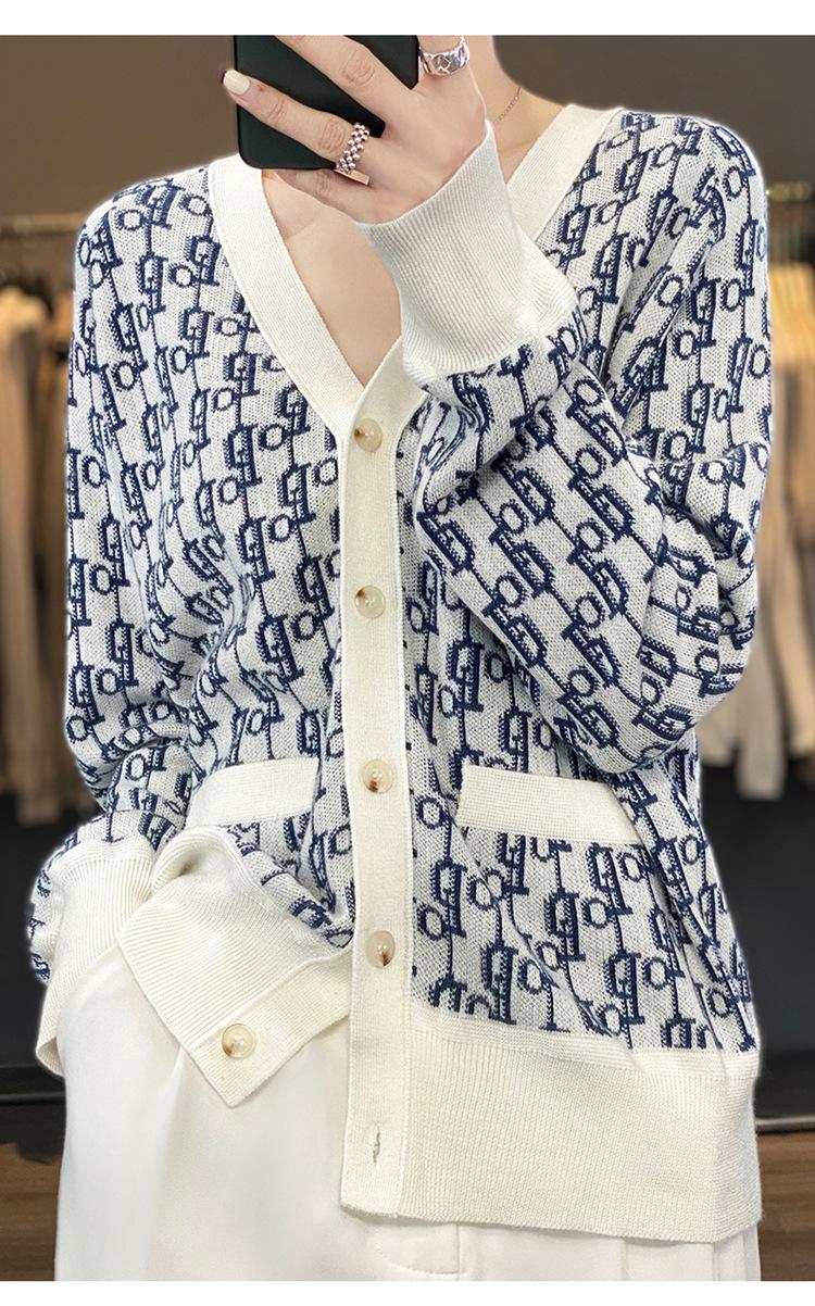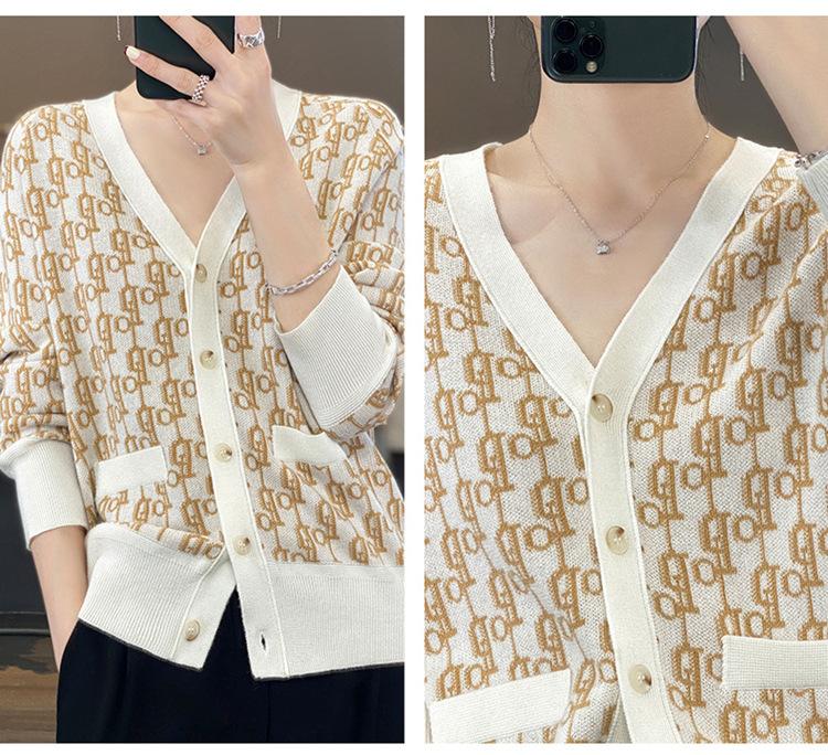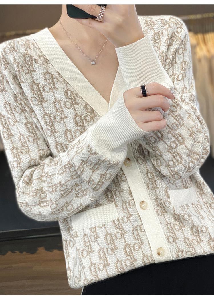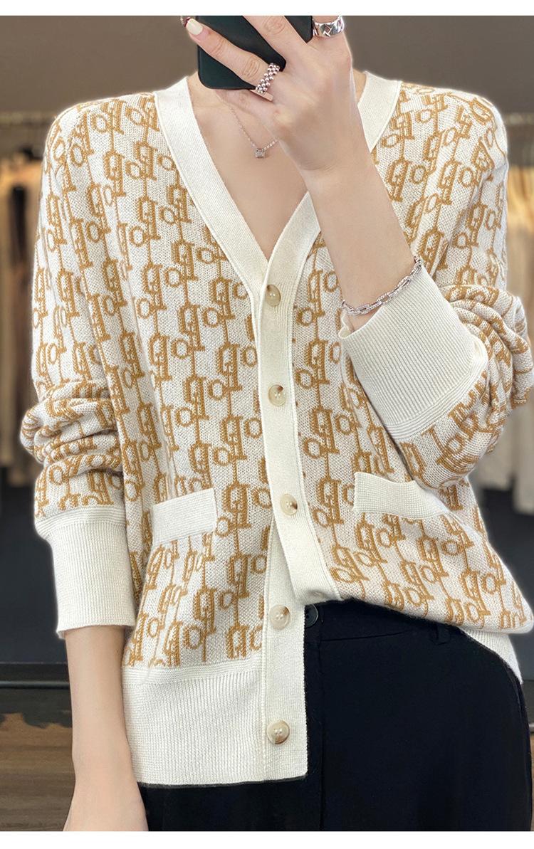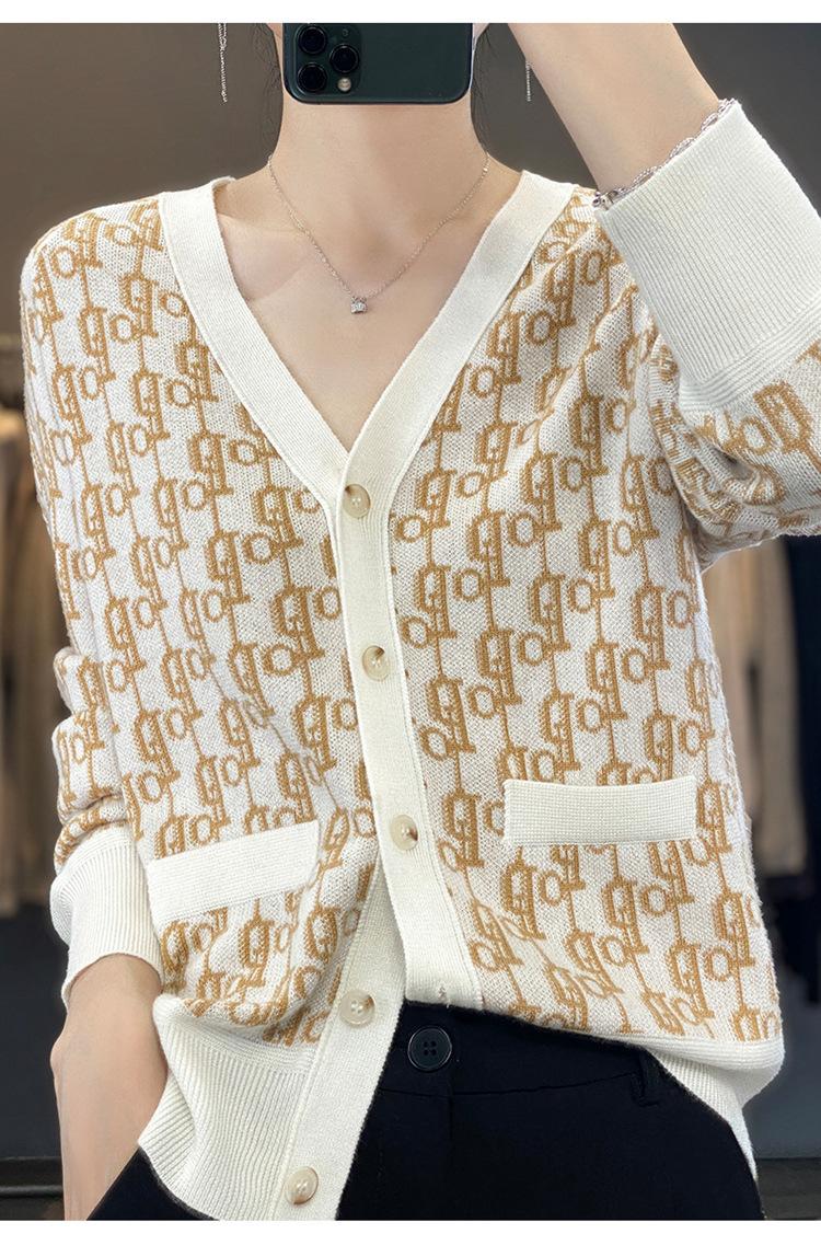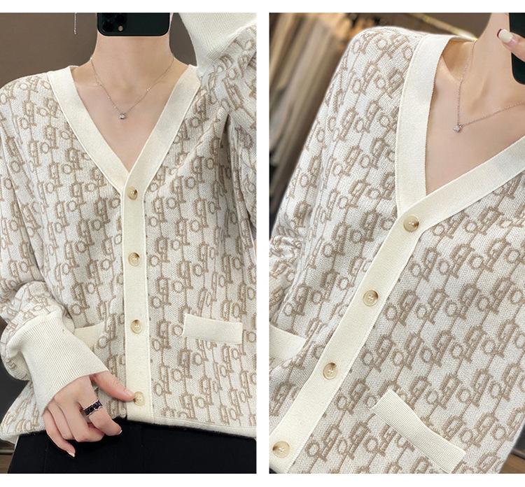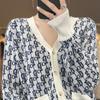 Cárdigan de lana estilo Chanel elegante de estilo francés para mujer, chaqueta de punto suelta con cuello en V y jacquard grueso, suéter exterior de aspecto entallado