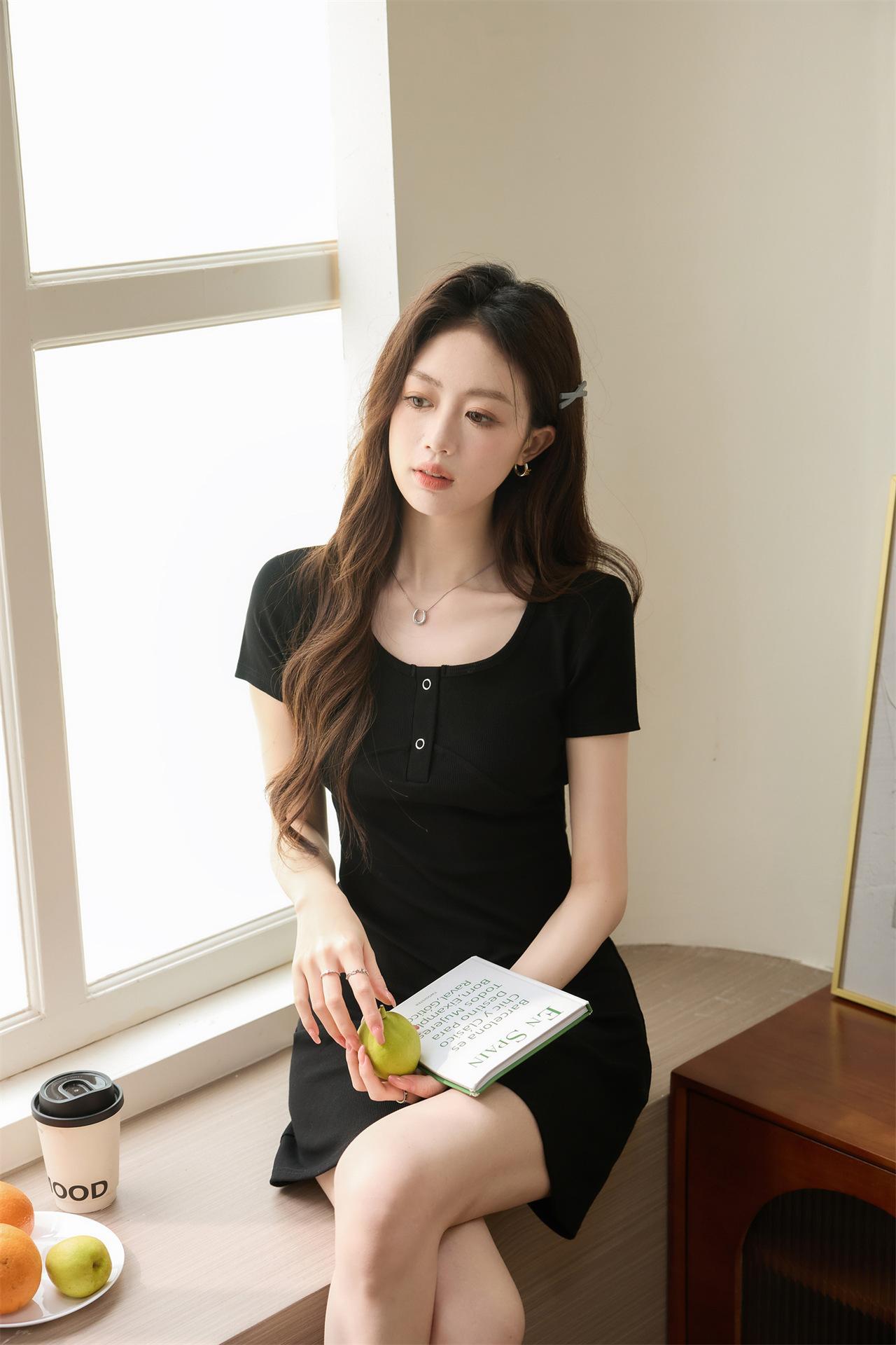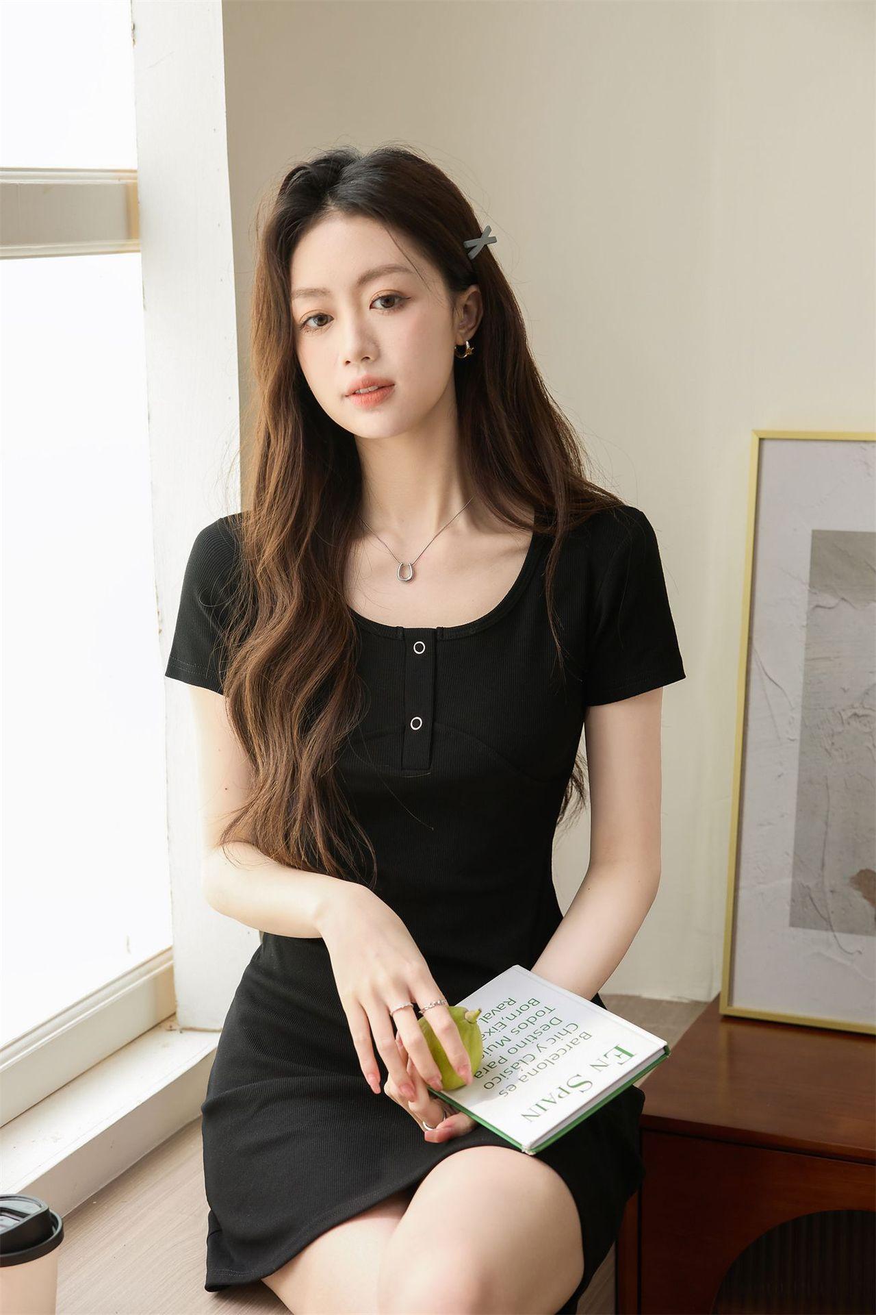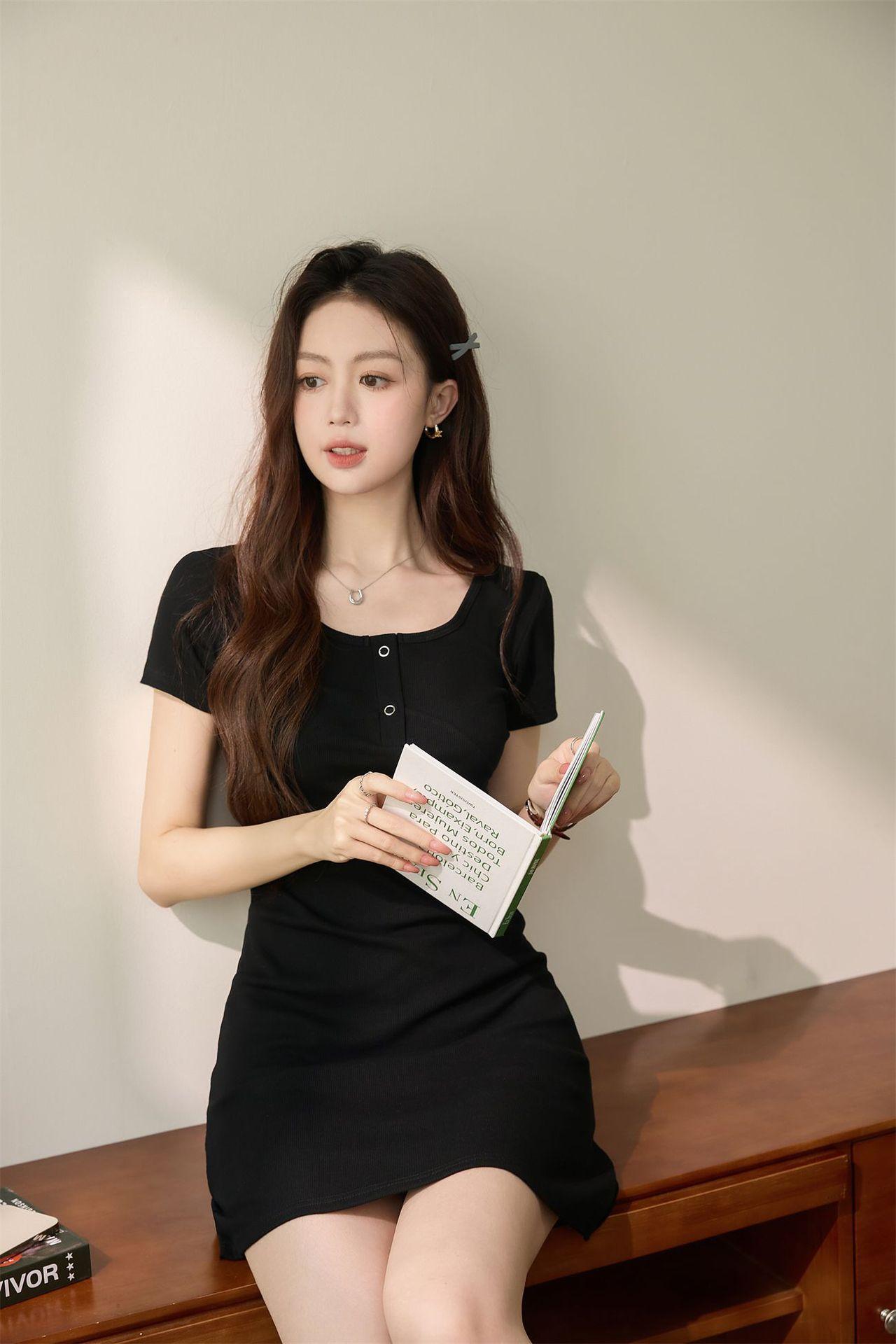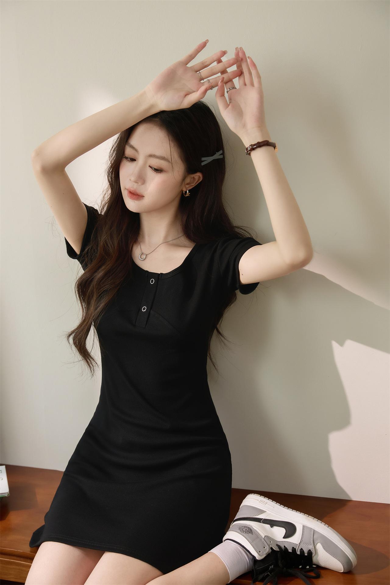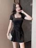 [Select You Cotton] Vestido Francés Negro Corto Línea A Cuello Cuadrado para Mujer Verano 2025 Nuevo Algodón Puro Sexy Falda Corta