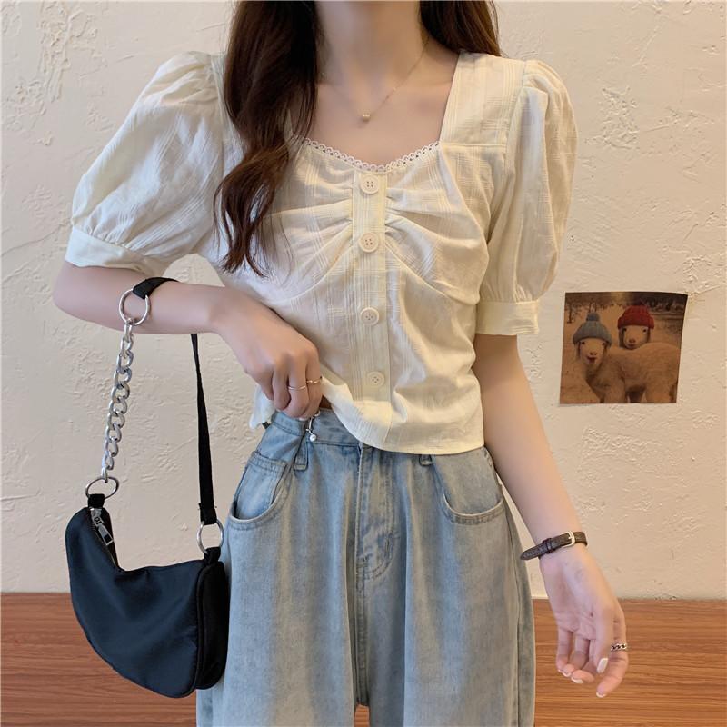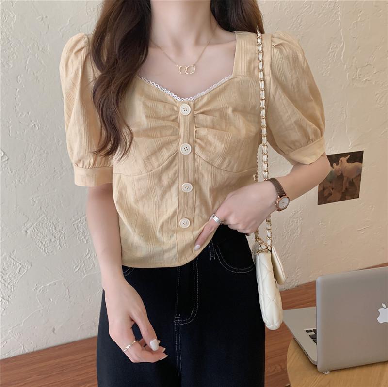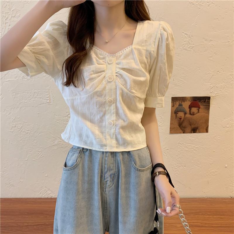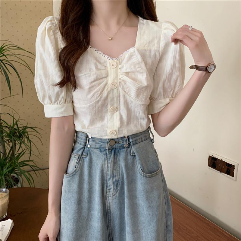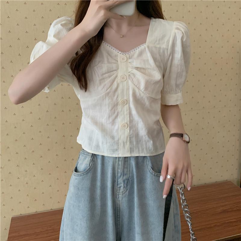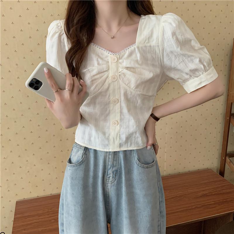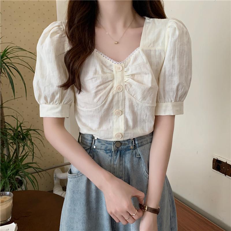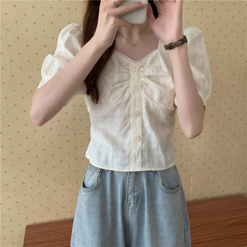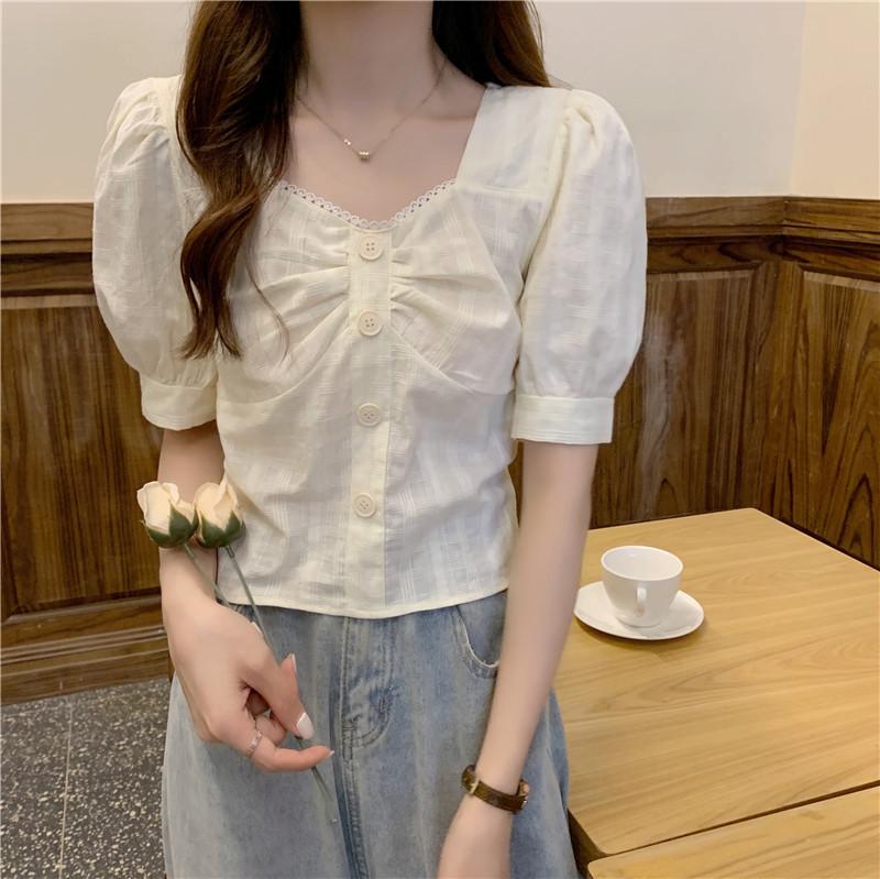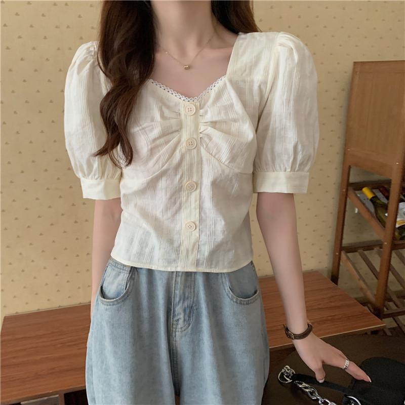 Camisa de diseño de nicho para mujer, fina, de verano 2024, estilo francés, elegante, ajustada, con mangas abullonadas, moderna.