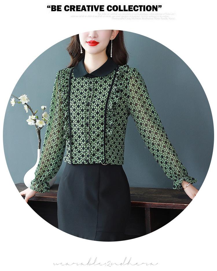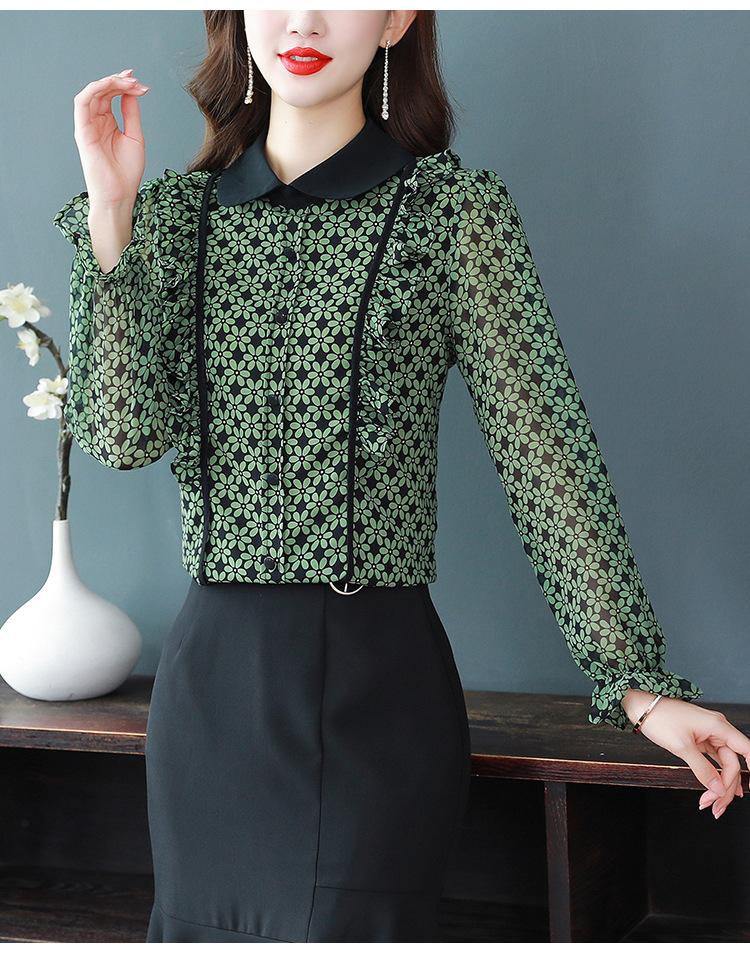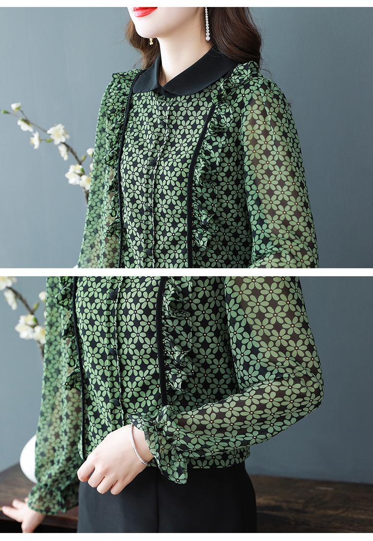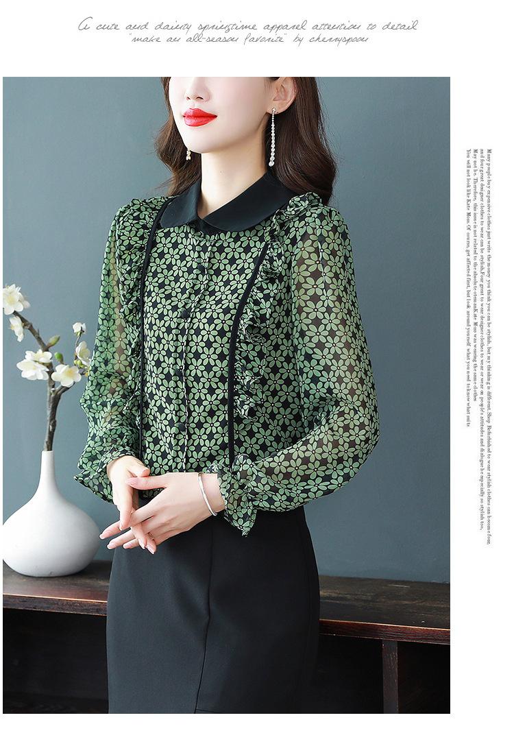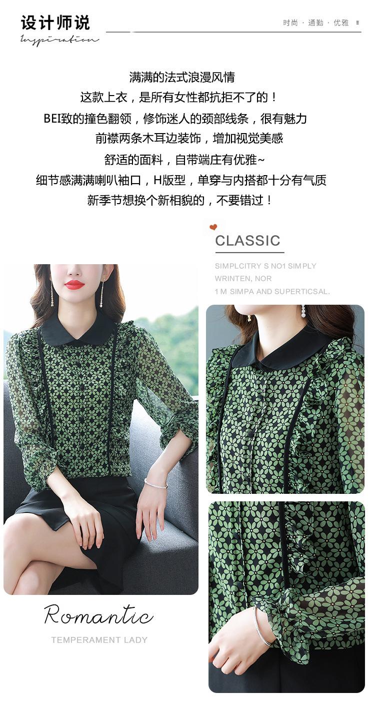 Primavera 2023 Nuevo Estilo Solapa de Color Contrastante Empalmado con Volantes Versátil Top Floral Elegante Camisa de Gasa Moderna