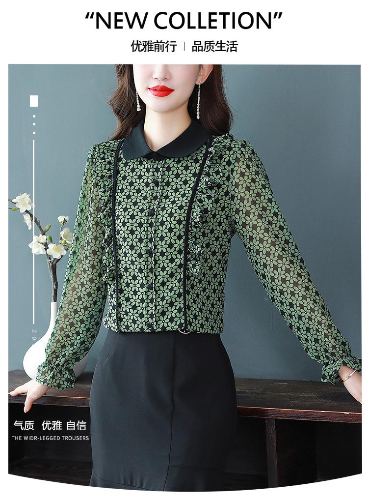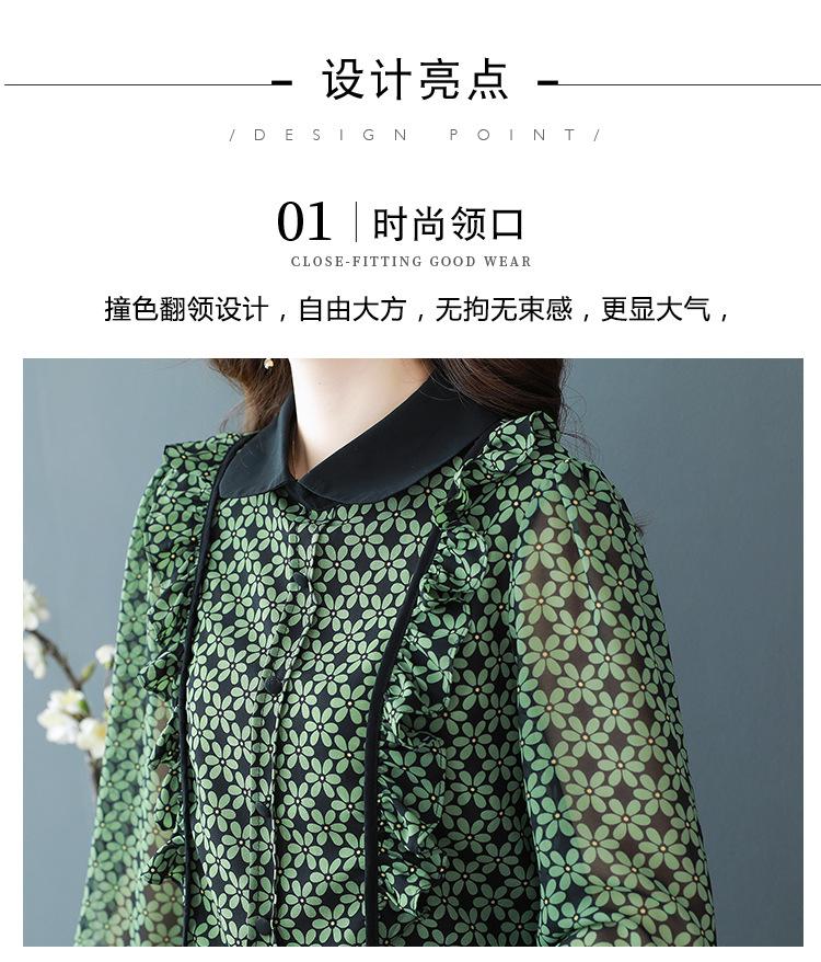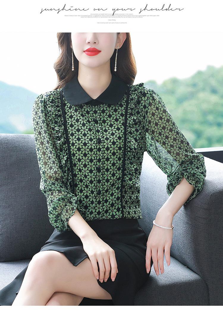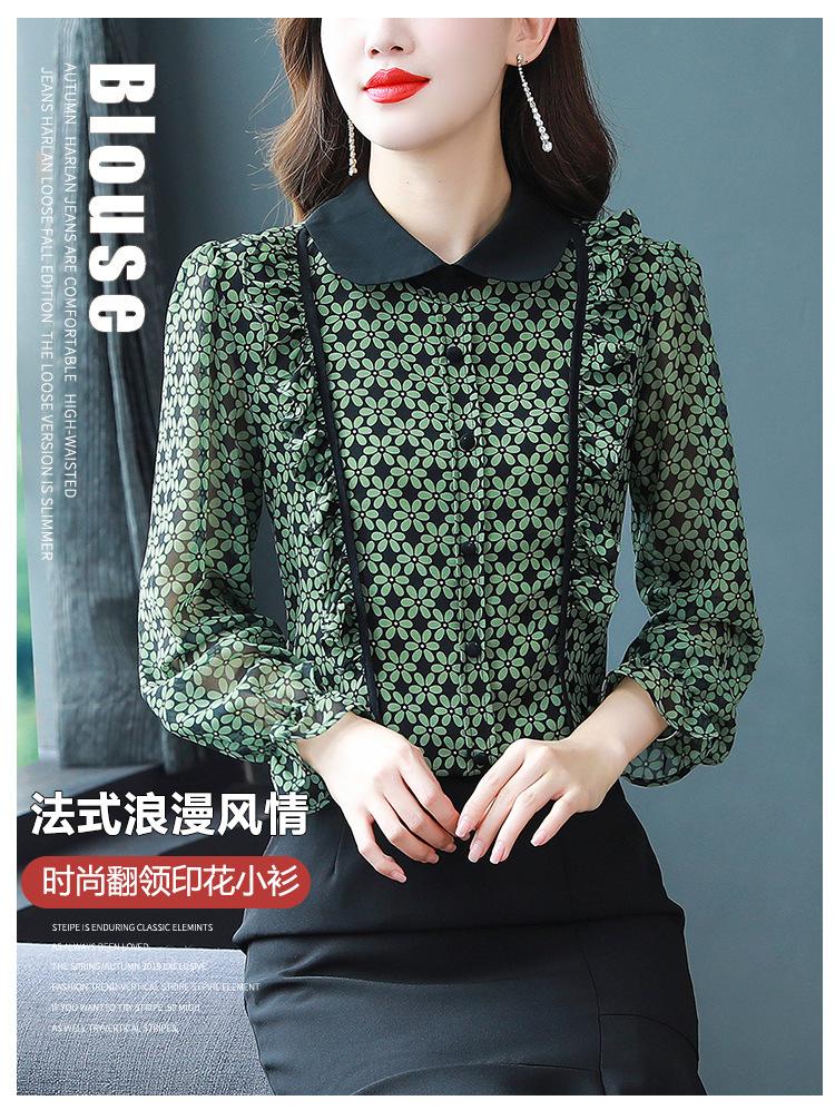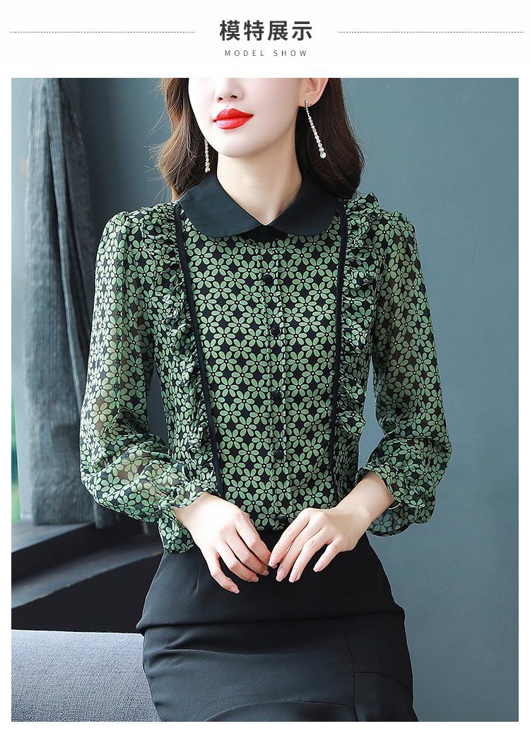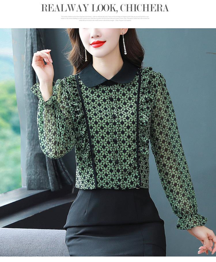 Primavera 2023 Nuevo Estilo Solapa de Color Contrastante Empalmado con Volantes Versátil Top Floral Elegante Camisa de Gasa Moderna