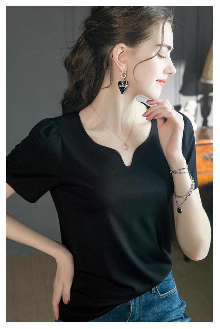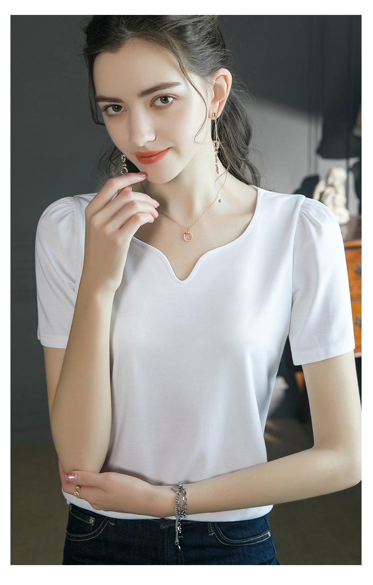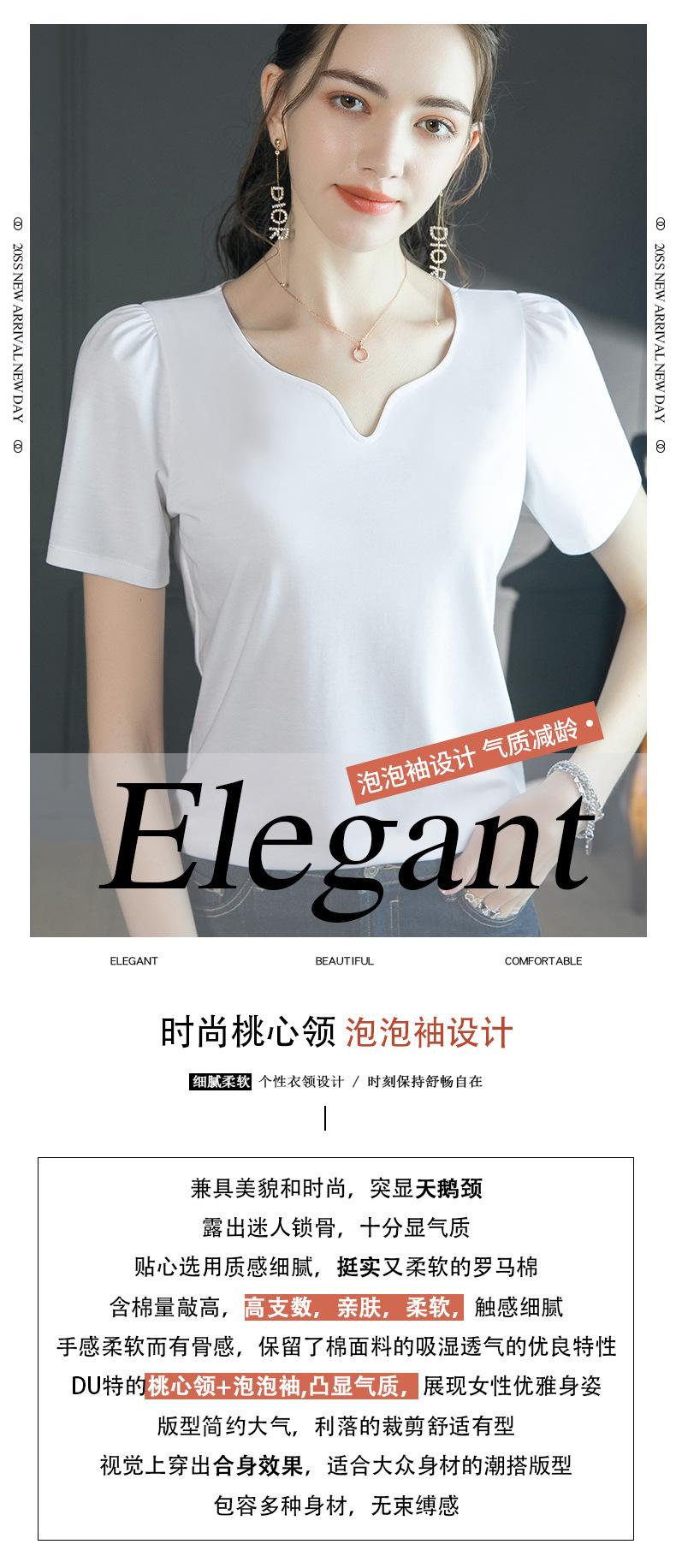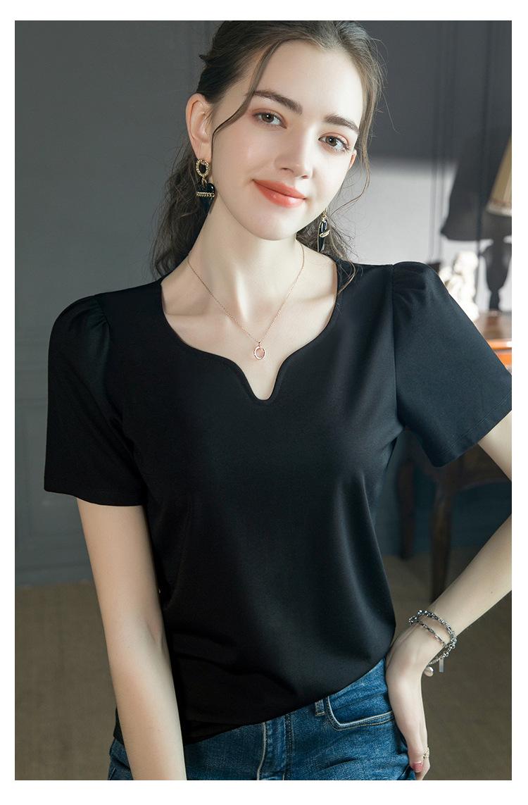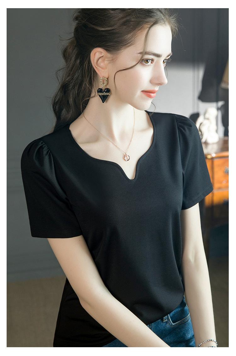 Camiseta de manga corta para mujer Verano para mujer Nueva camiseta de manga media de color sólido Diseño con sentido de manga abullonada Top Cuello U Camiseta básica