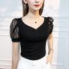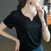 2025 nuevas camisetas de mujer con cuello medio alto, camisetas de mujer de manga corta con temperamento de otoño, hombros rectos, mangas voladoras, cintura ajustada