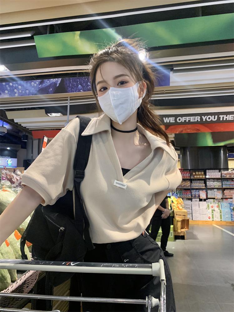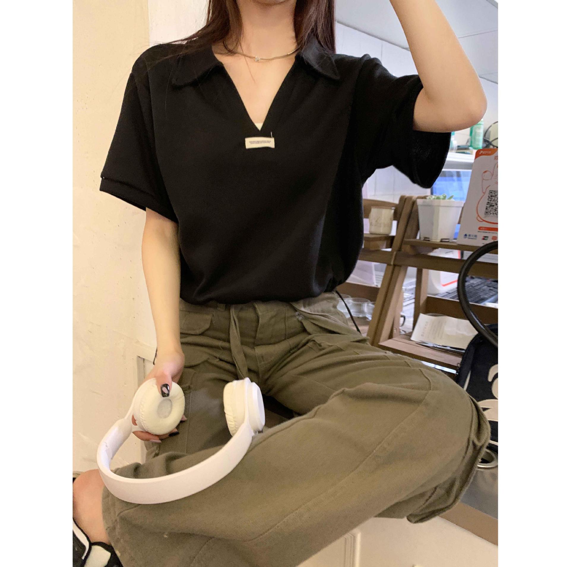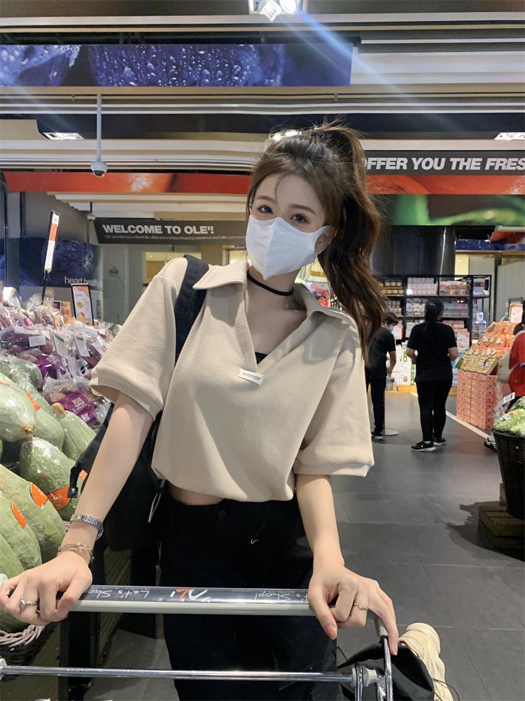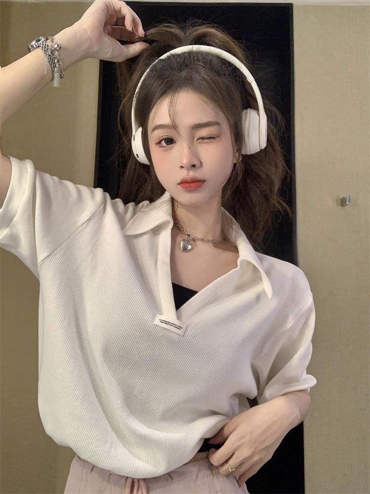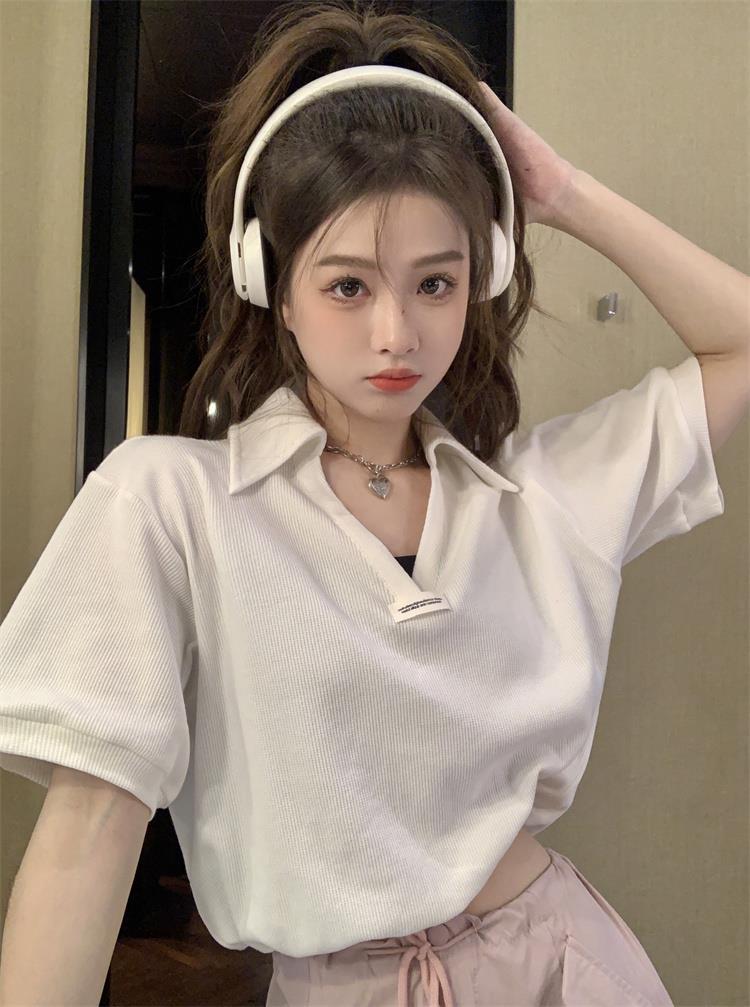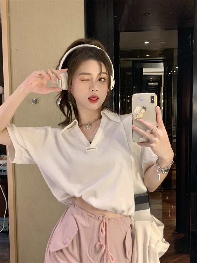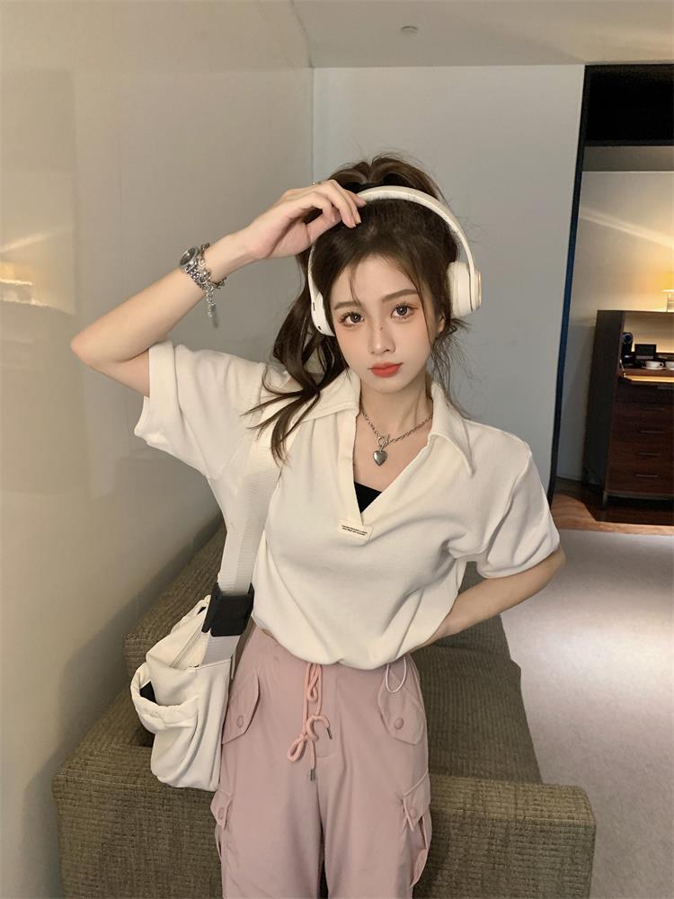 Cuello en V Solapa Manga Corta Mujer Coreano Verano Nuevo Diseño Estudiante Nicho Corto Cuello Polo Estación Europea Top