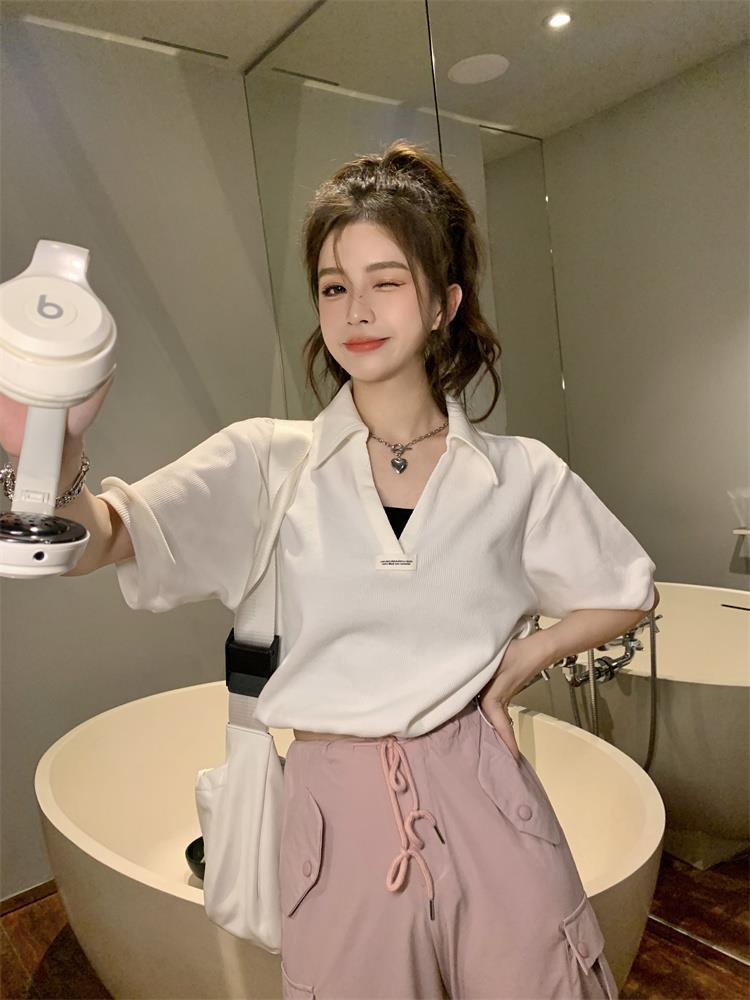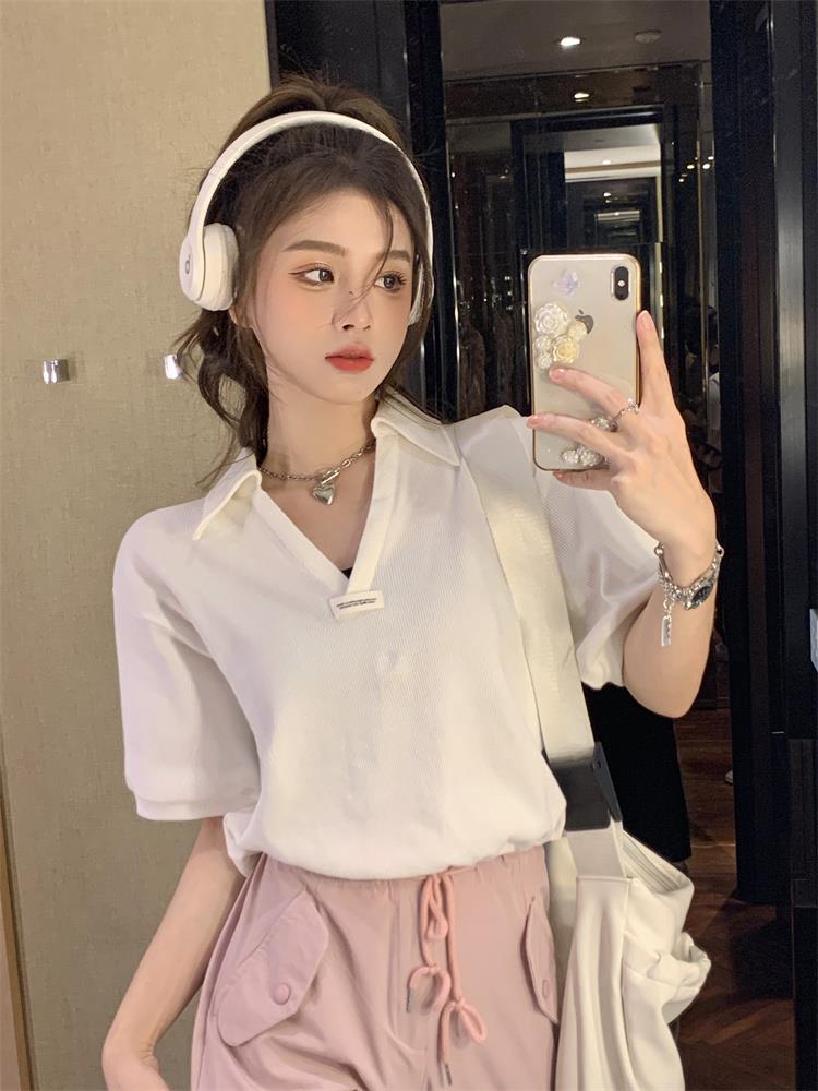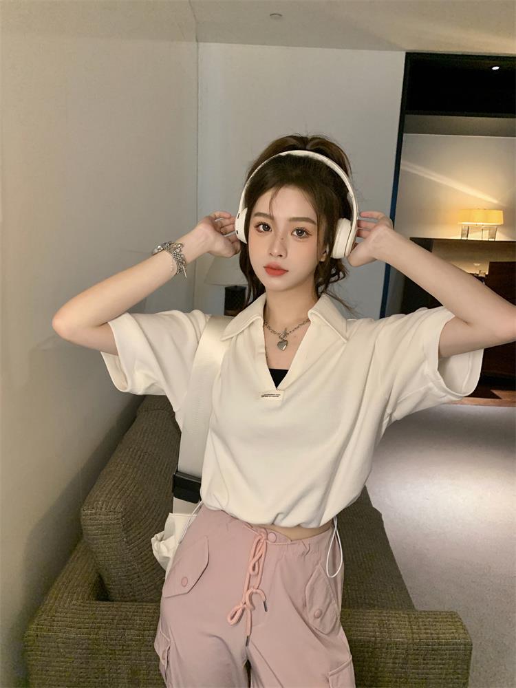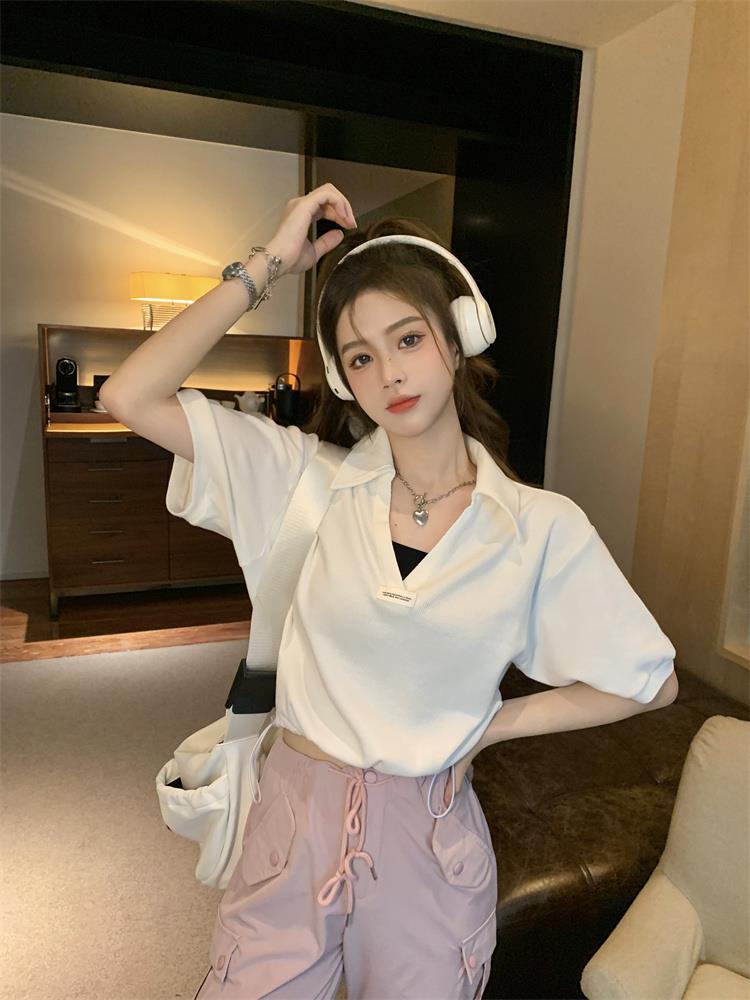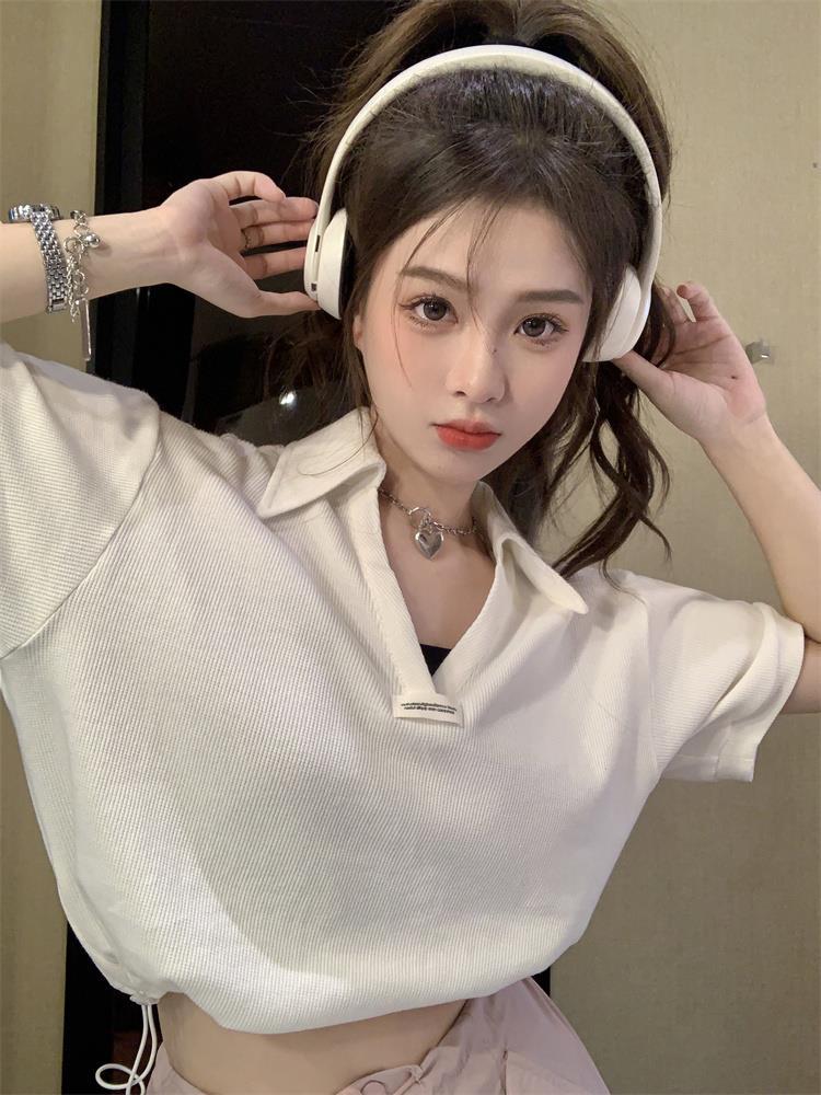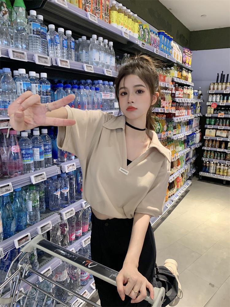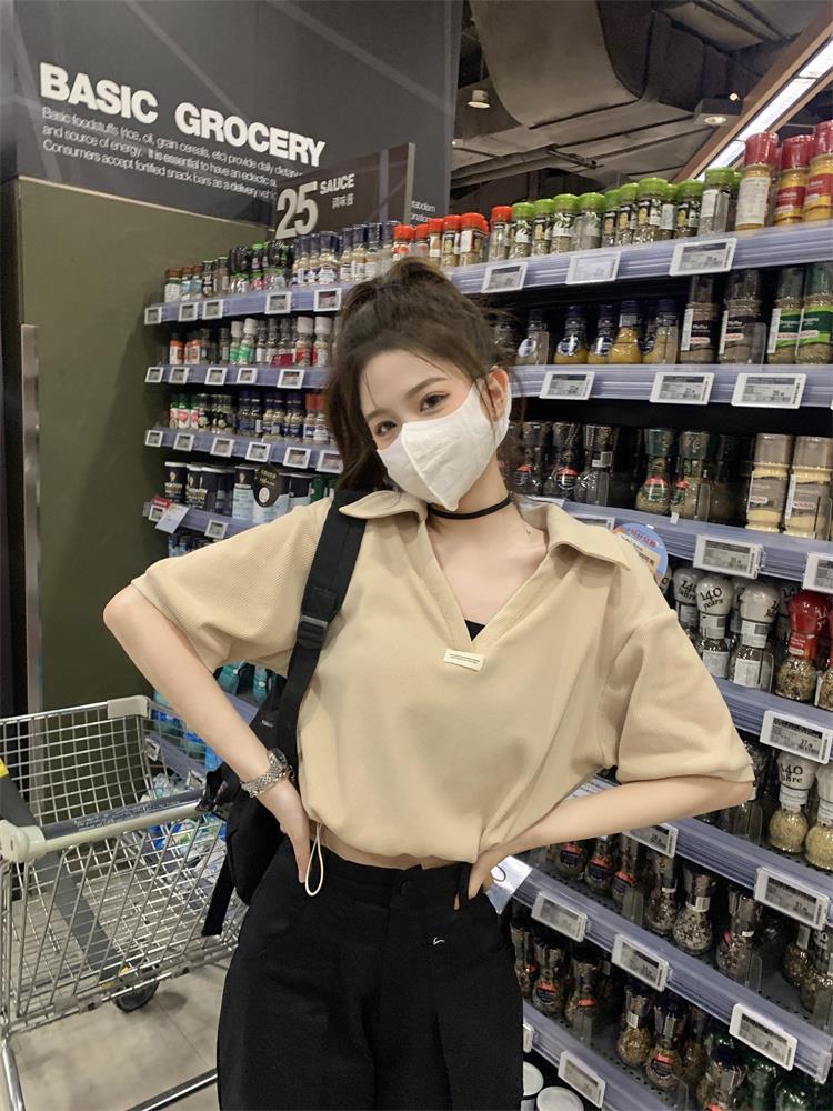 Cuello en V Solapa Manga Corta Mujer Coreano Verano Nuevo Diseño Estudiante Nicho Corto Cuello Polo Estación Europea Top