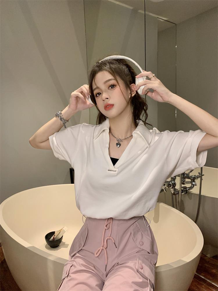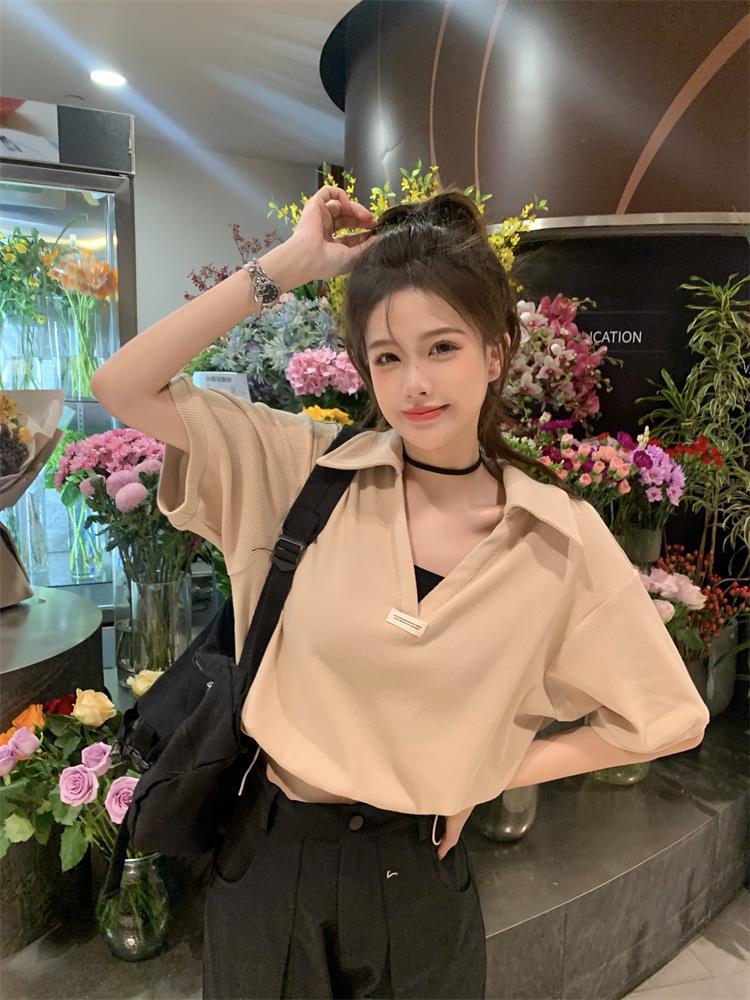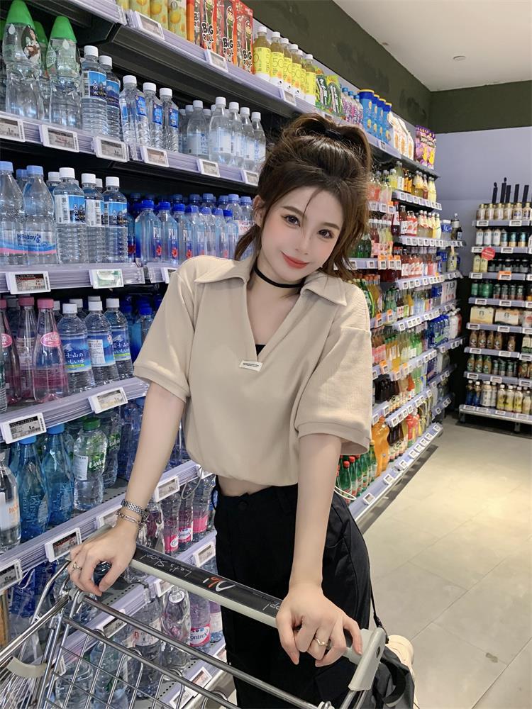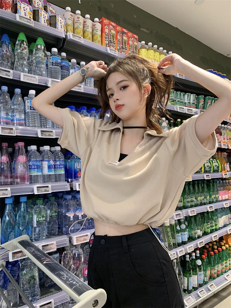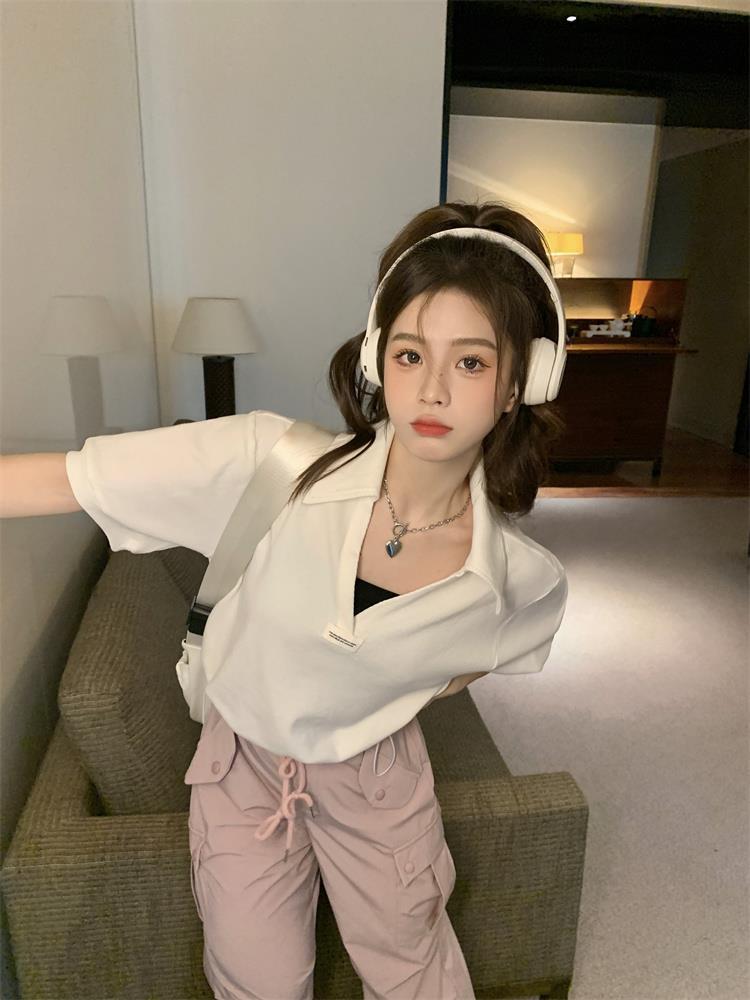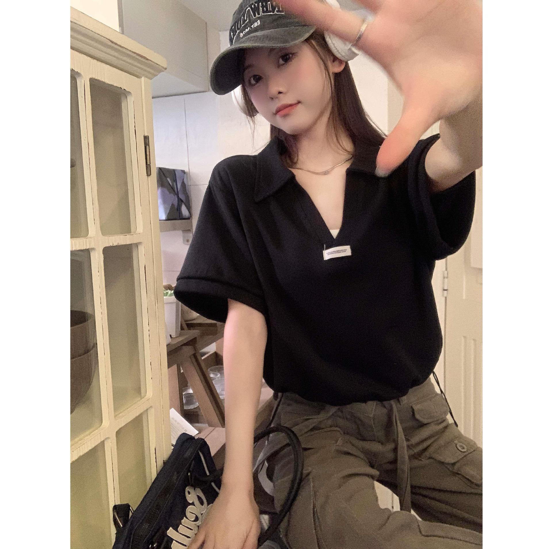 Cuello en V Solapa Manga Corta Mujer Coreano Verano Nuevo Diseño Estudiante Nicho Corto Cuello Polo Estación Europea Top