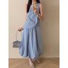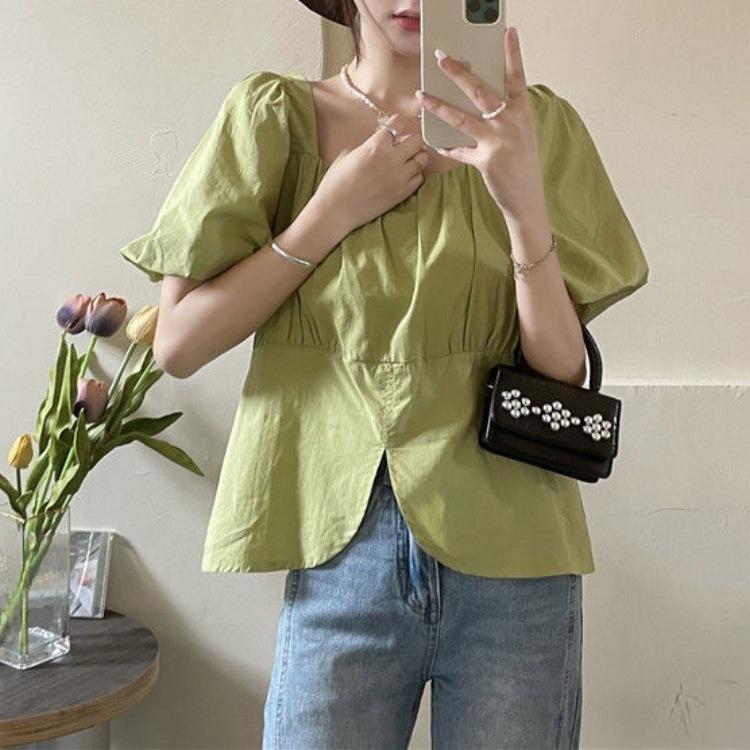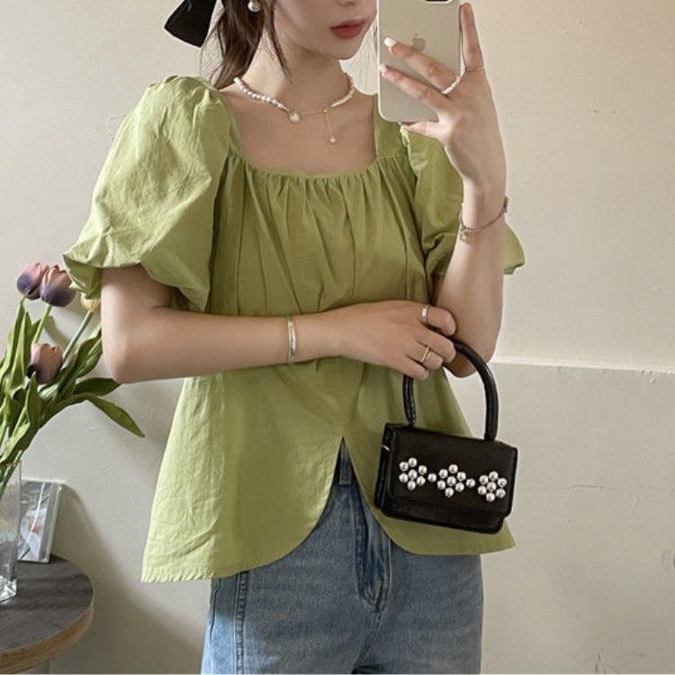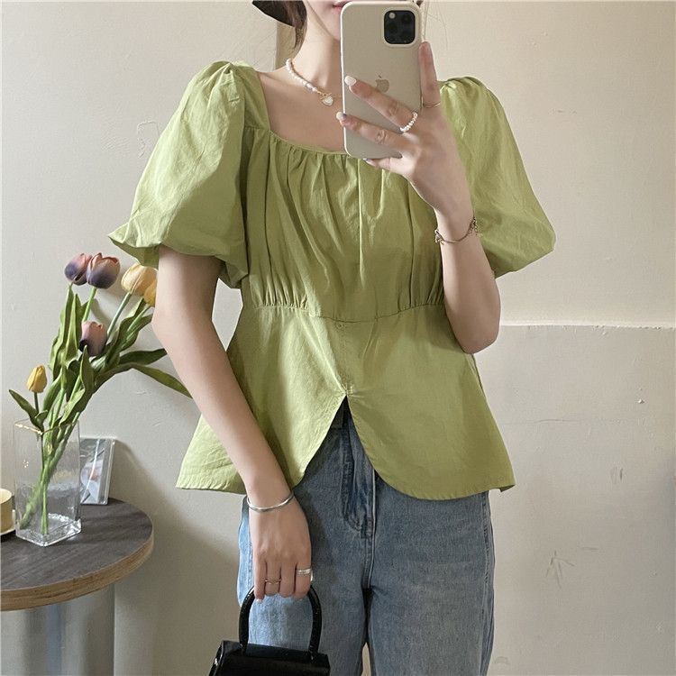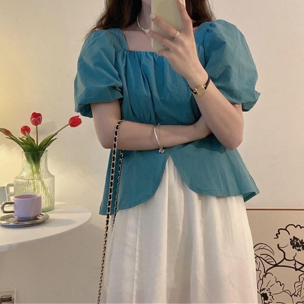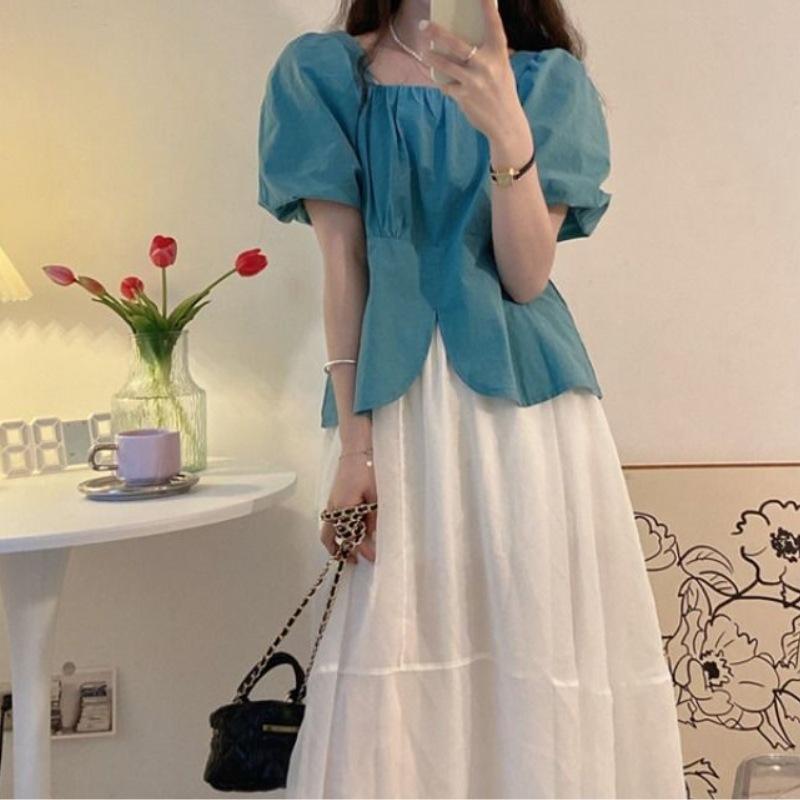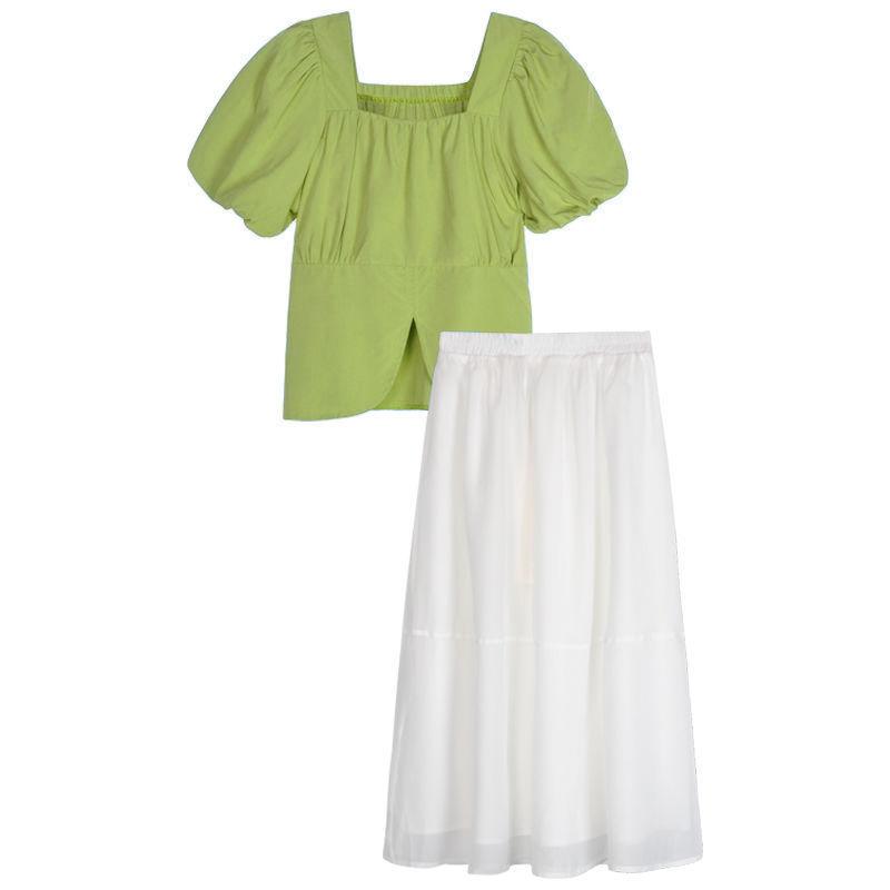 Traje de Verano para Mujer Nuevo Diseño Japonés y Coreano Nicho Camisa de Cuello Cuadrado Falda Elástica de Cintura Alta Conjunto de Dos Piezas