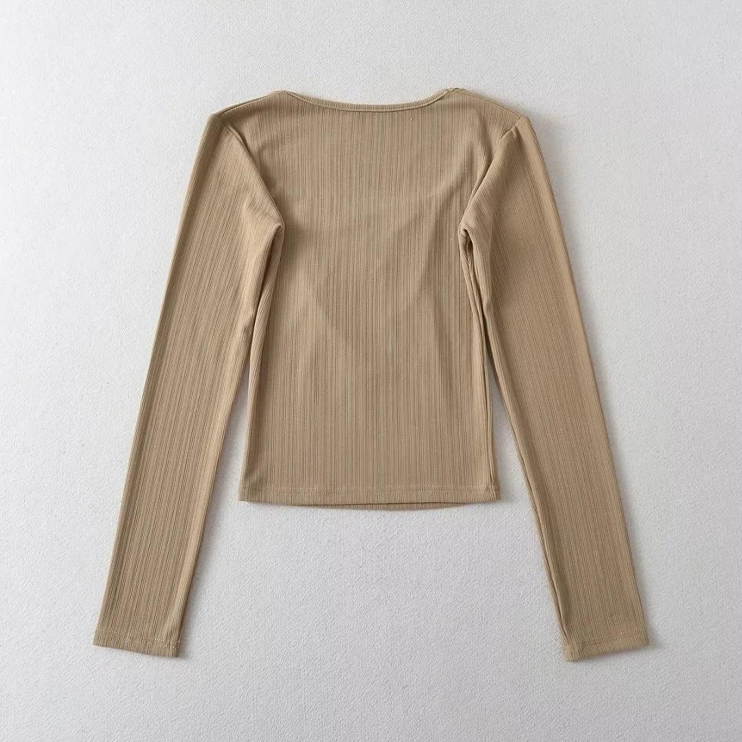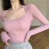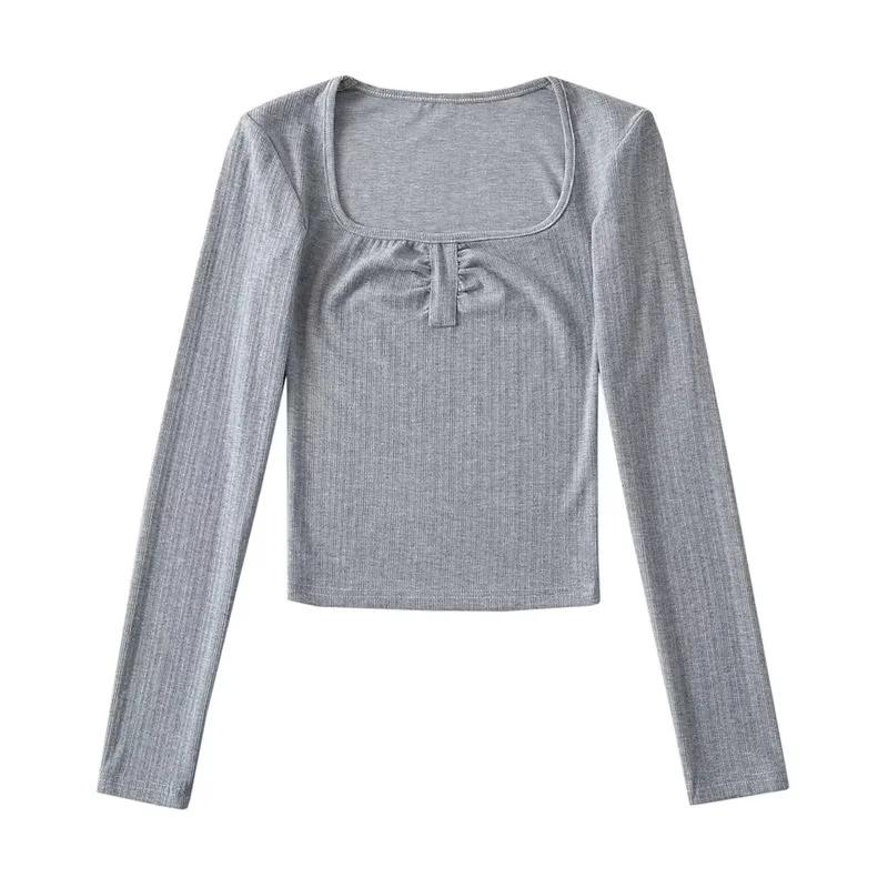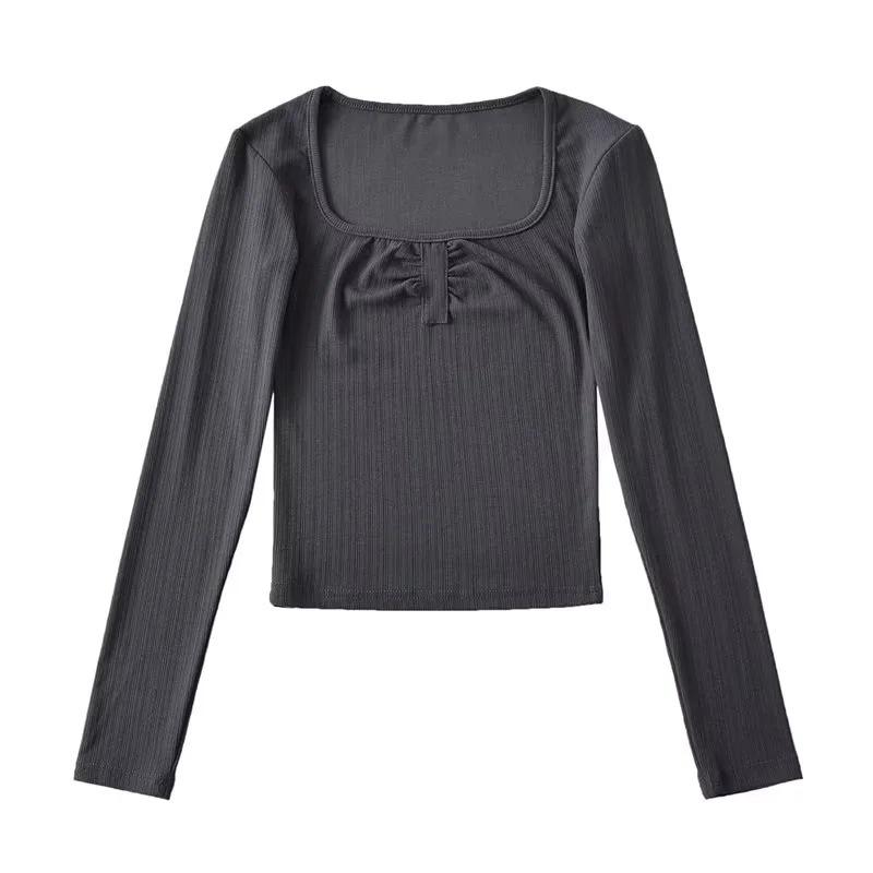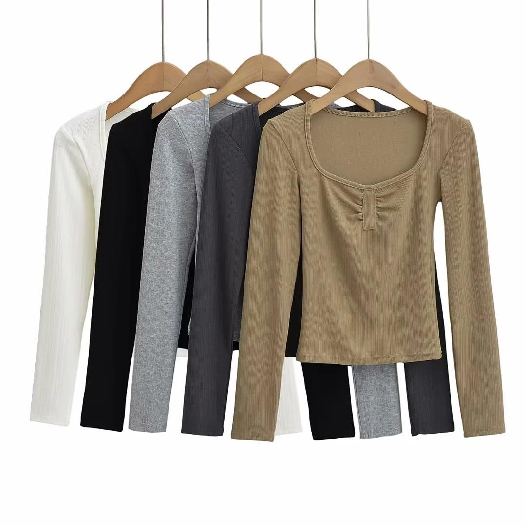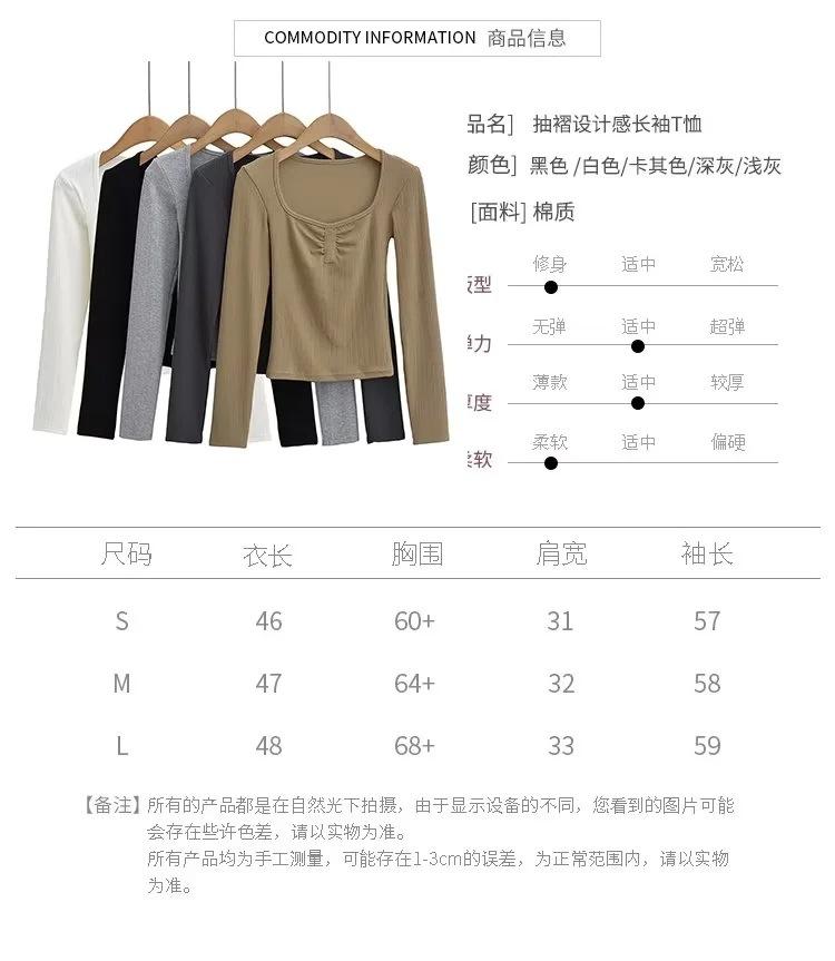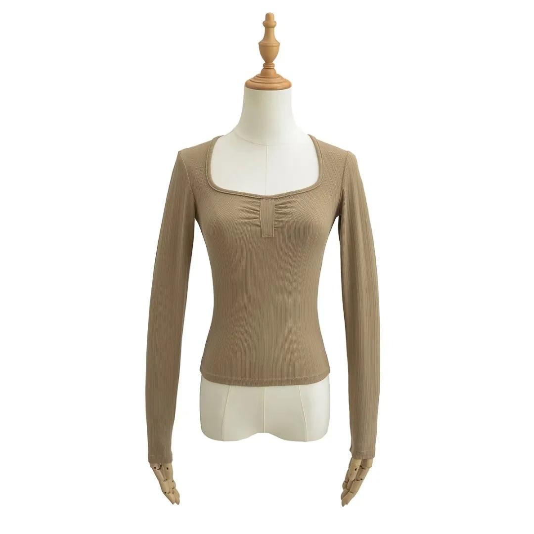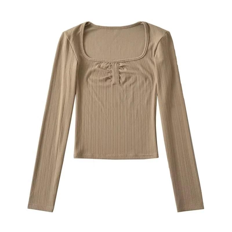Camiseta básica sexy plisada de color sólido estilo europeo y americano para mujer, top de hilo elástico de otoño, camiseta ajustada de manga larga estilo europeo y americano