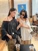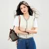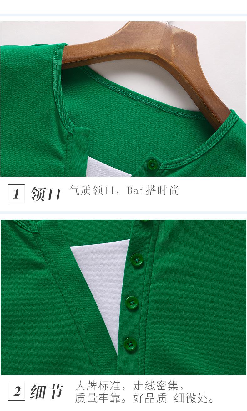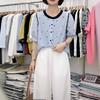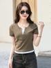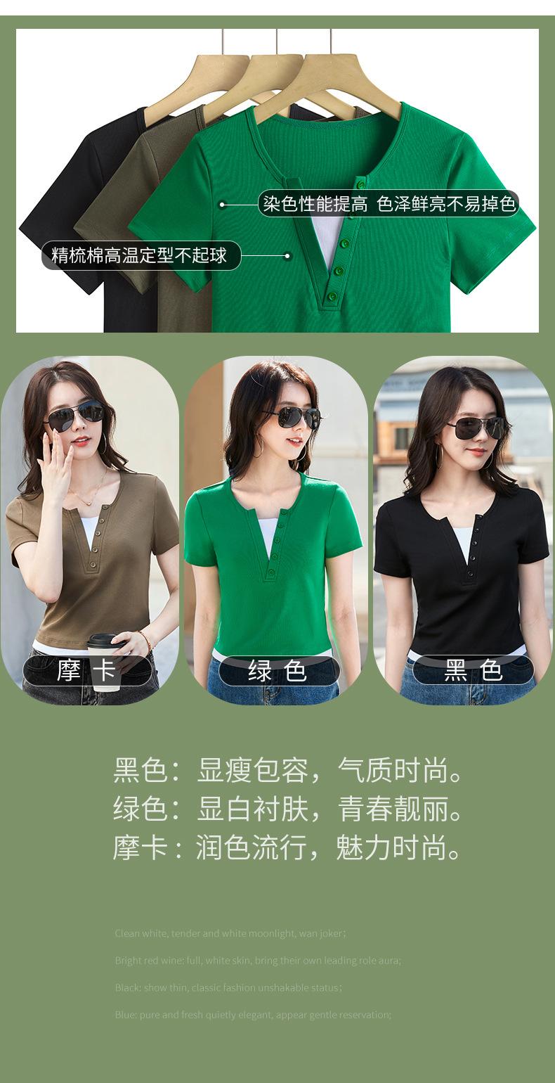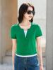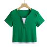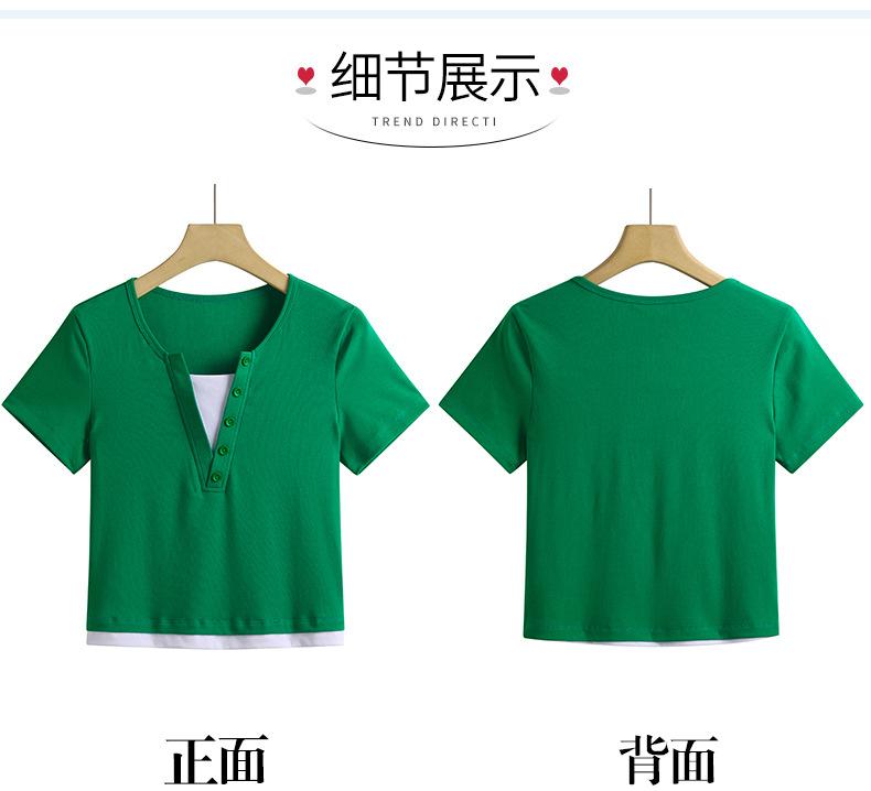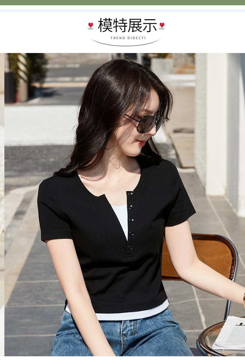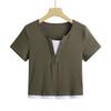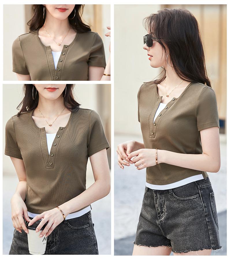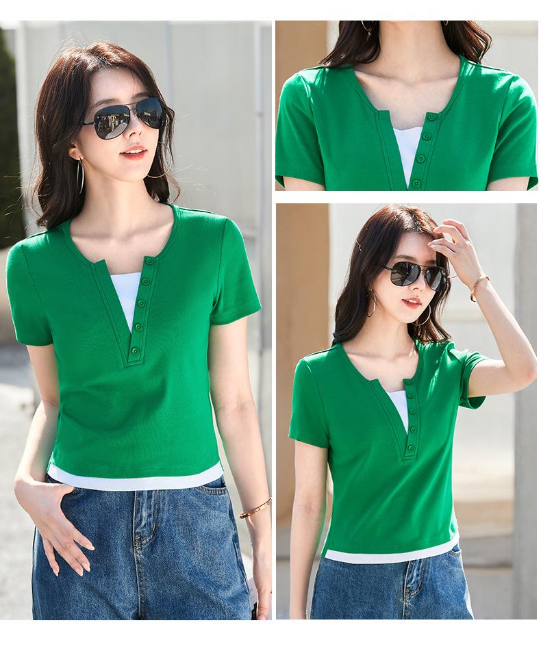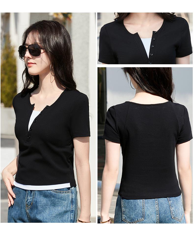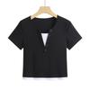 Verano 2025 Nuevo Conjunto de Dos Piezas Falso de Color en Contraste Estilo Coreano Ajustado Combinable Camiseta de Mujer de Manga Corta con Cuello en V con Botones Falsos Moda