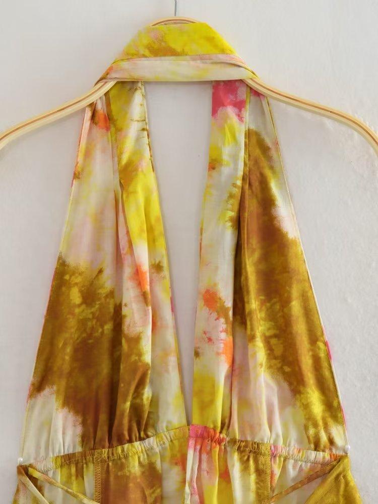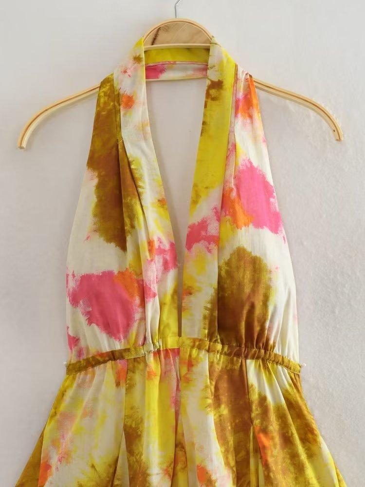 Estilo europeo y americano para mujer, comercio exterior transfronterizo, nuevo vestido corto sin mangas con cuello halter, sexy, sin espalda, con cordones y estampado