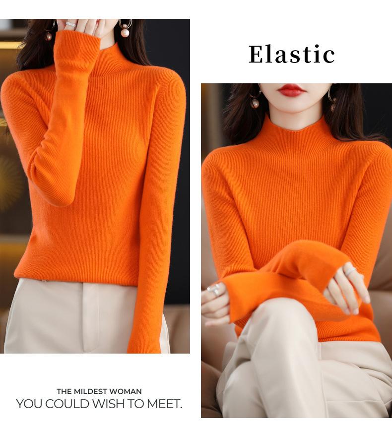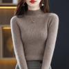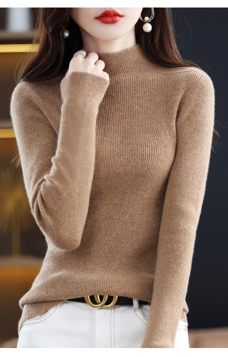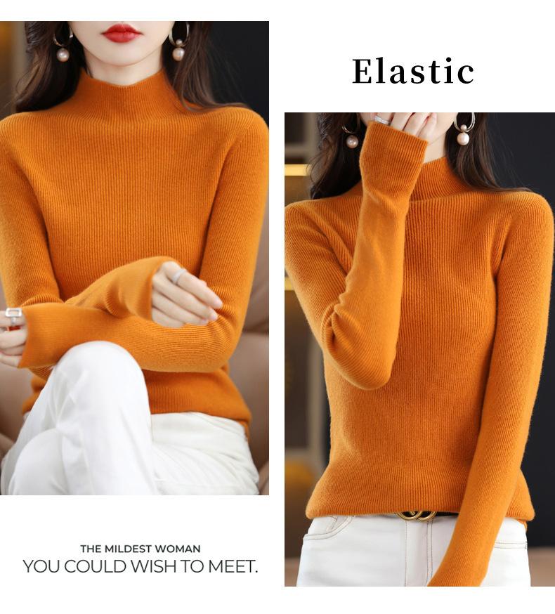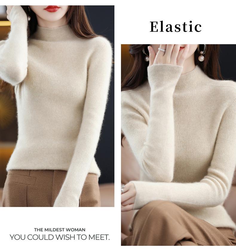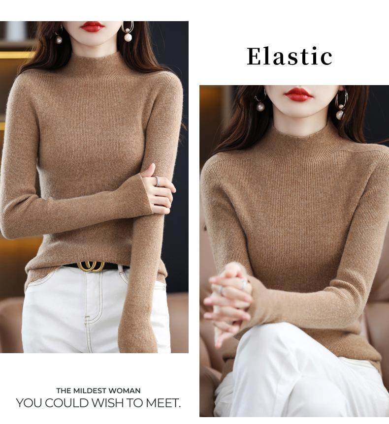 Suéter básico de una pieza, sin costuras, de 100% lana pura, ajustado, adelgazante, con cuello alto medio para mujer