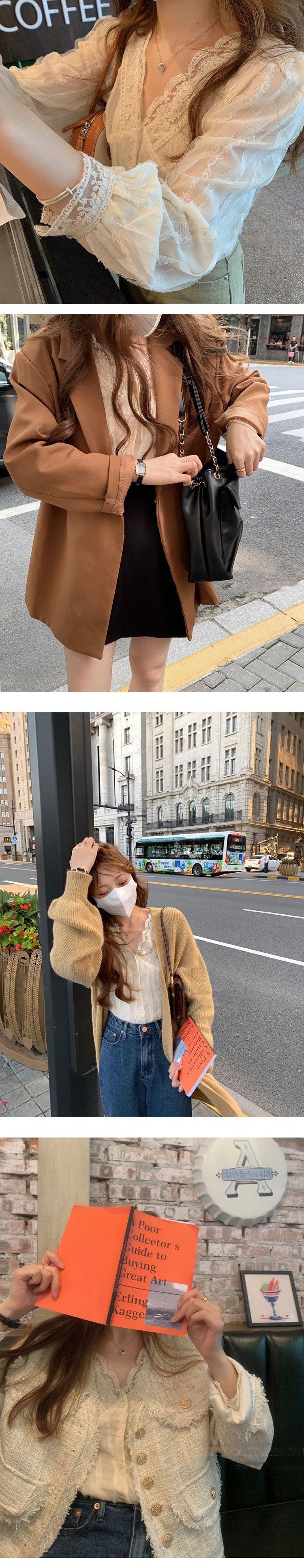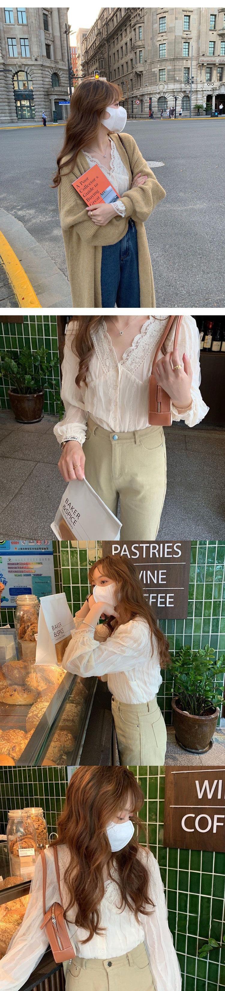 Blusa Elegante de Encaje con Cuello en V para Mujer 2024 Primavera Nueva Suave Versátil Chifón Dulce y Única