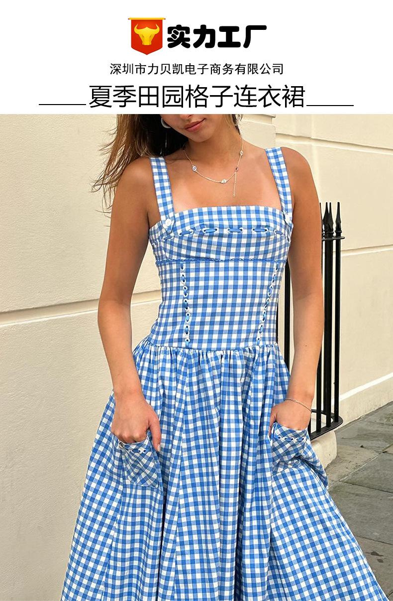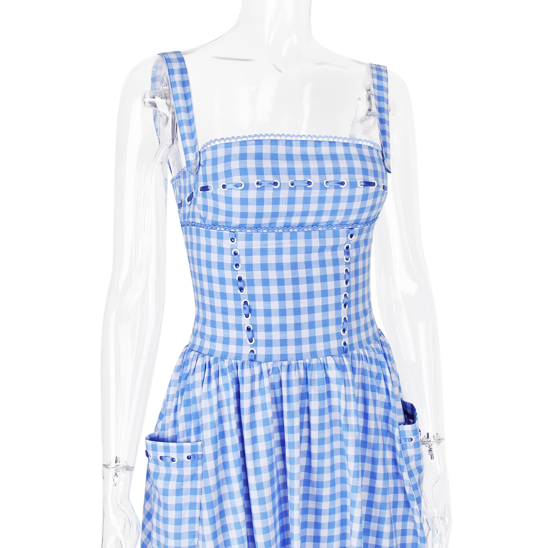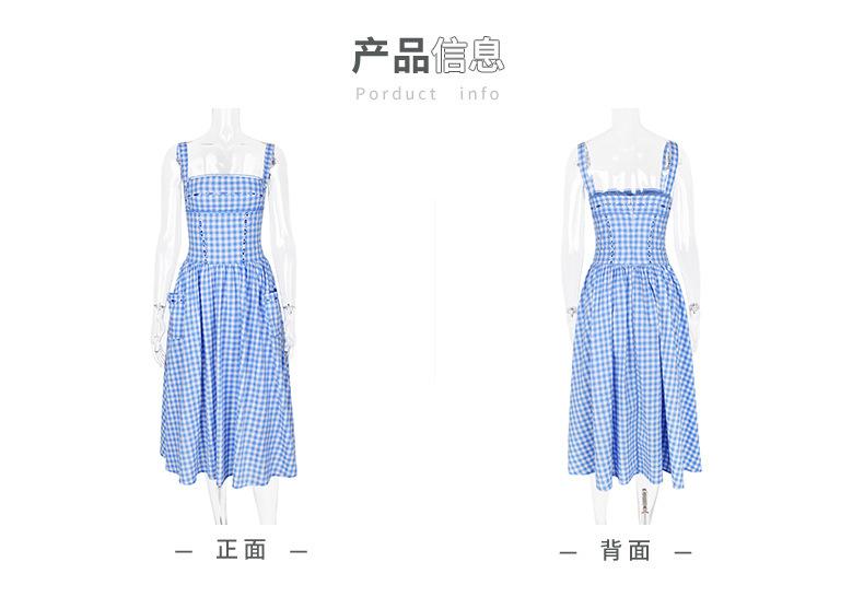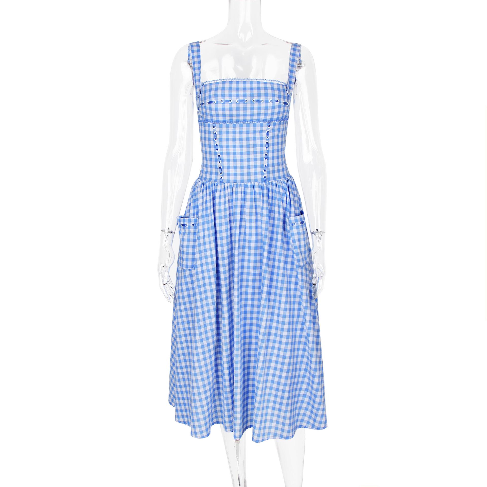 Vestido de verano de alta gama para mujer, estilo pastoral, con falda de longitud media y cuadros azules.