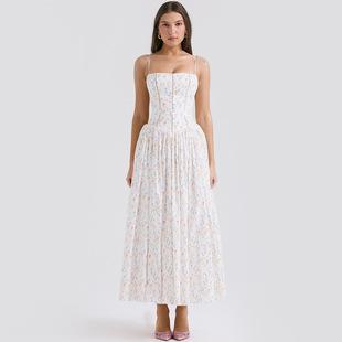 Ropa de mujer de comercio exterior sexy delgada blanca floral viento de deseo puro falda larga vestido de tirantes para chica hot verano mujeres alta gama