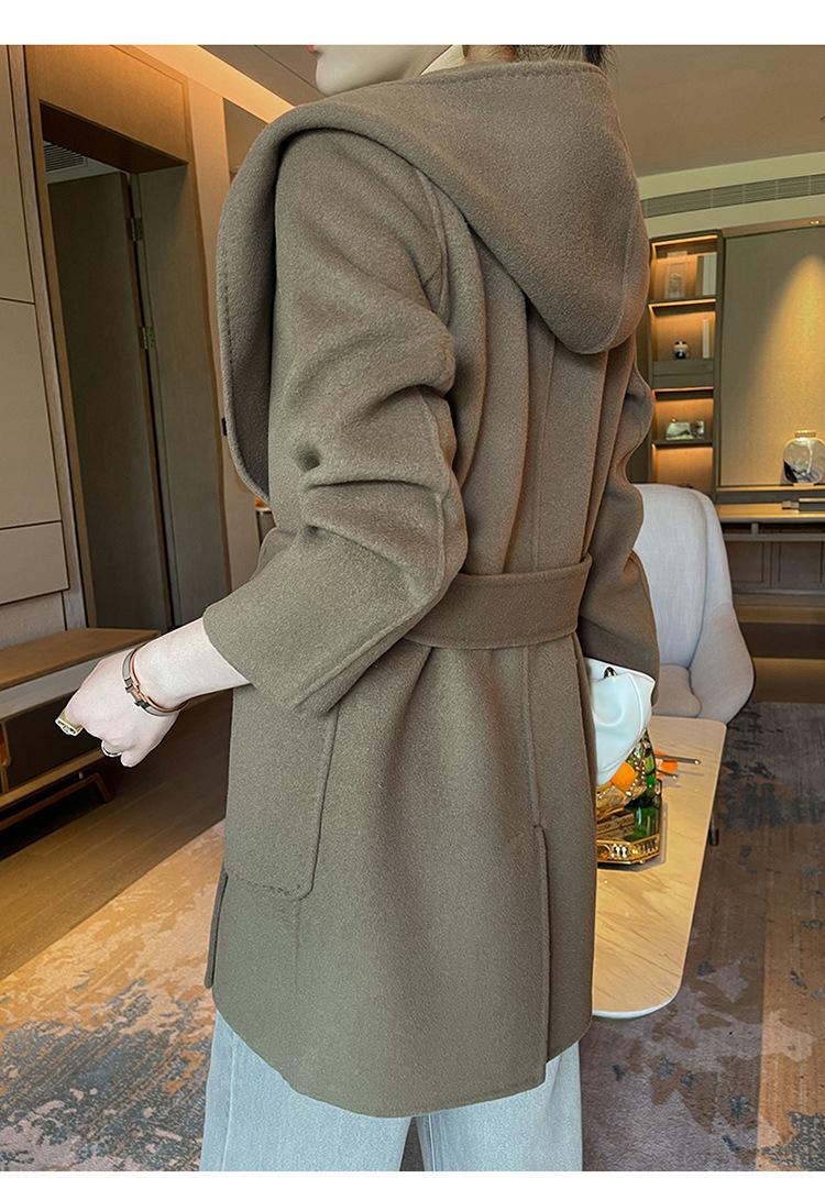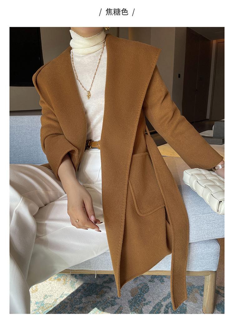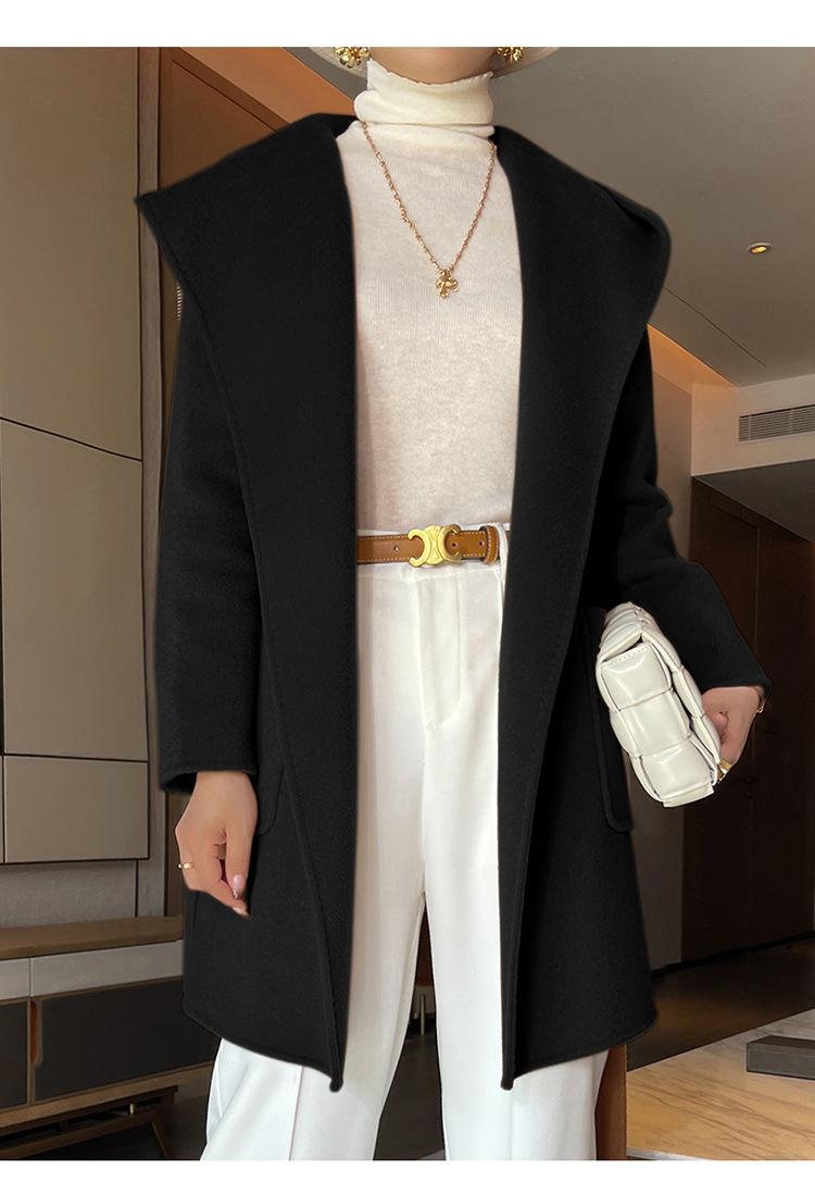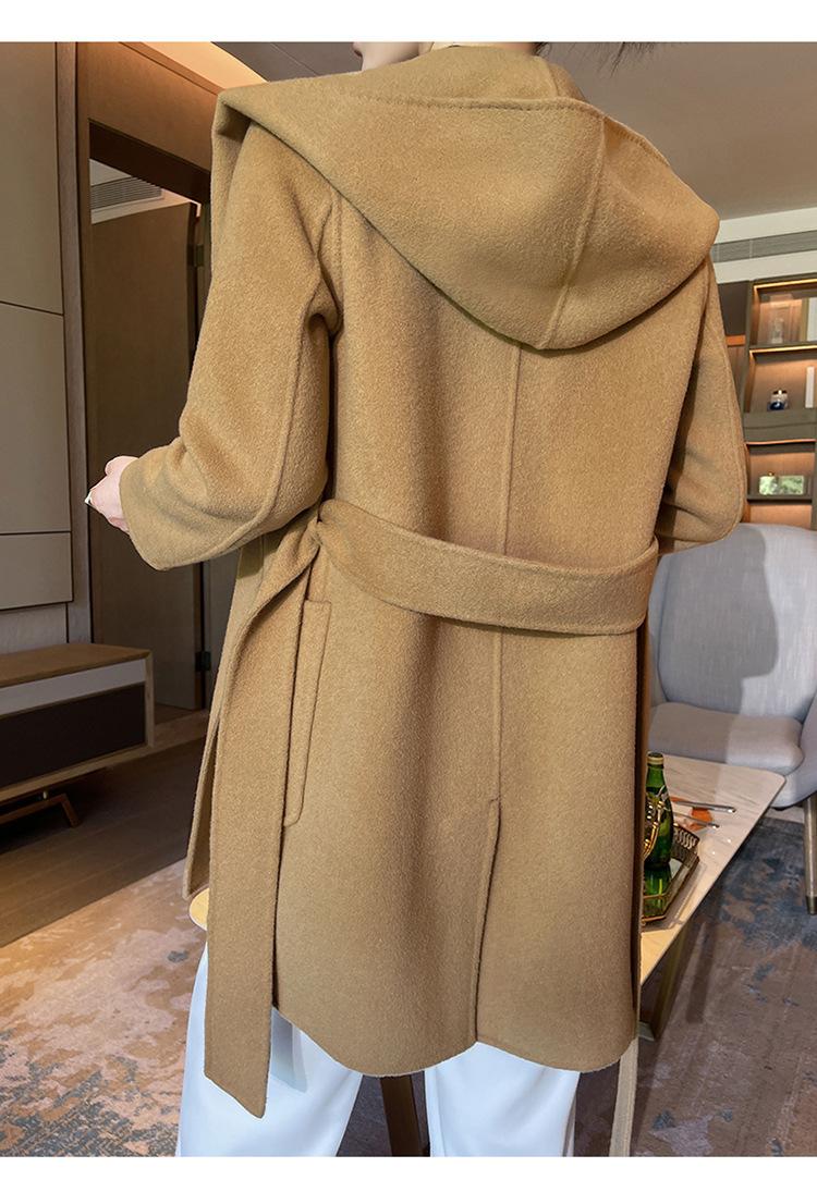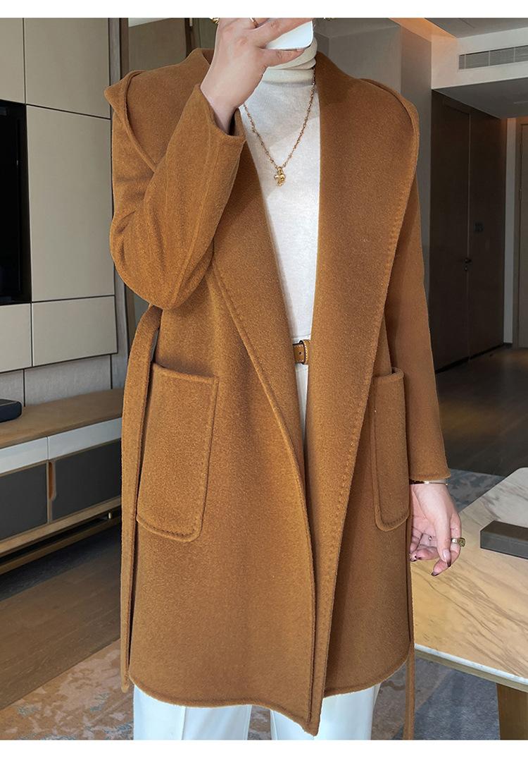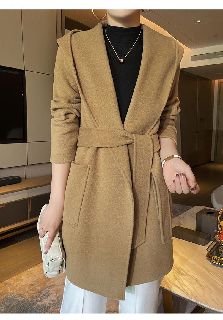 Chaqueta de tweed de doble cara de lana gruesa con capucha y cinturón de color sólido de estilo coreano para otoño e invierno, nueva y holgada.