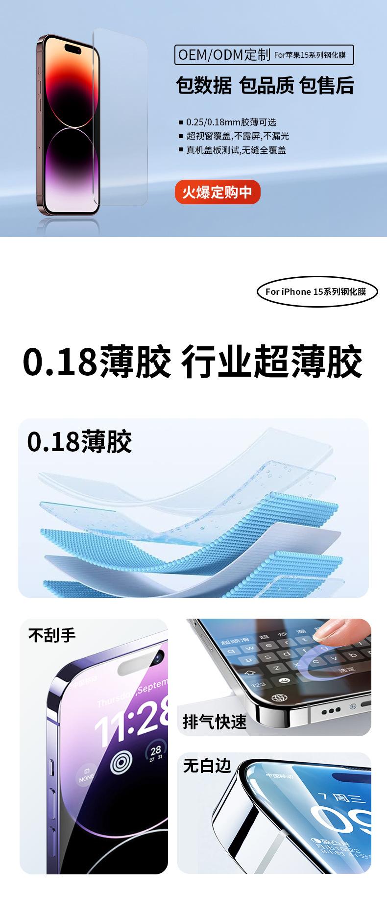 Parámetros para la película de vidrio templado transparente para iPhone 15:(Película HD/película anti-luz azul/película templada de serigrafía/película esmerilada/película de TPU/película de luz verde/película para lente/artefacto para pegar película se puede personalizar)
