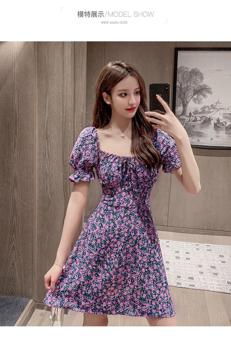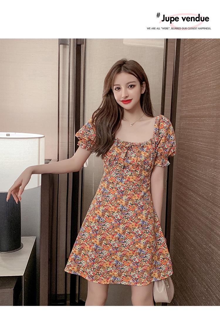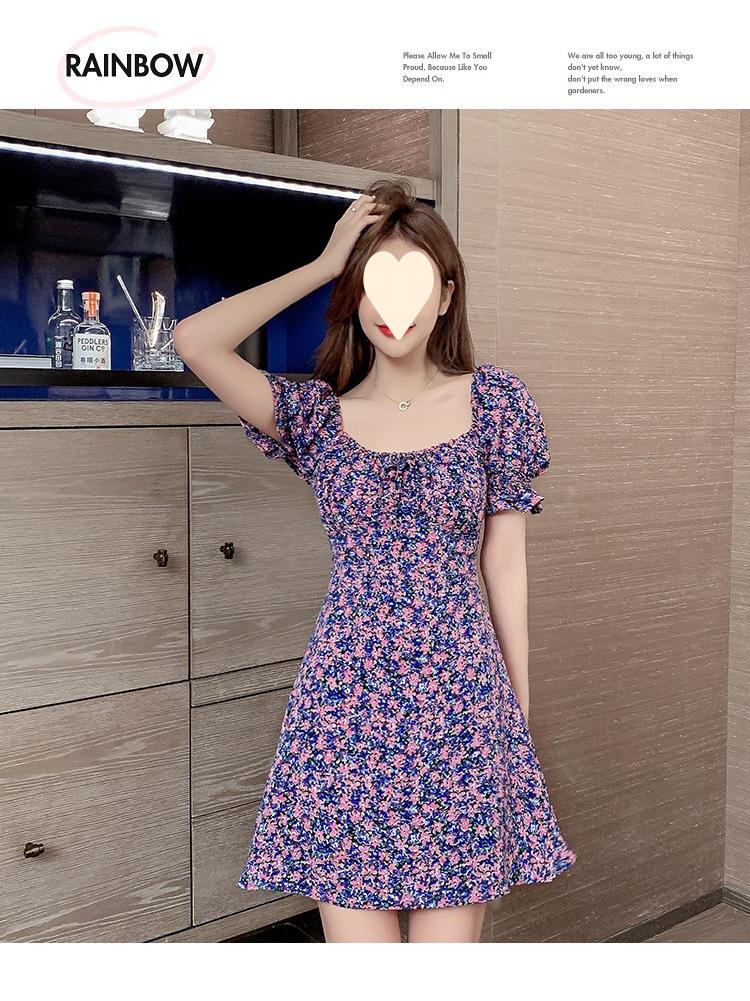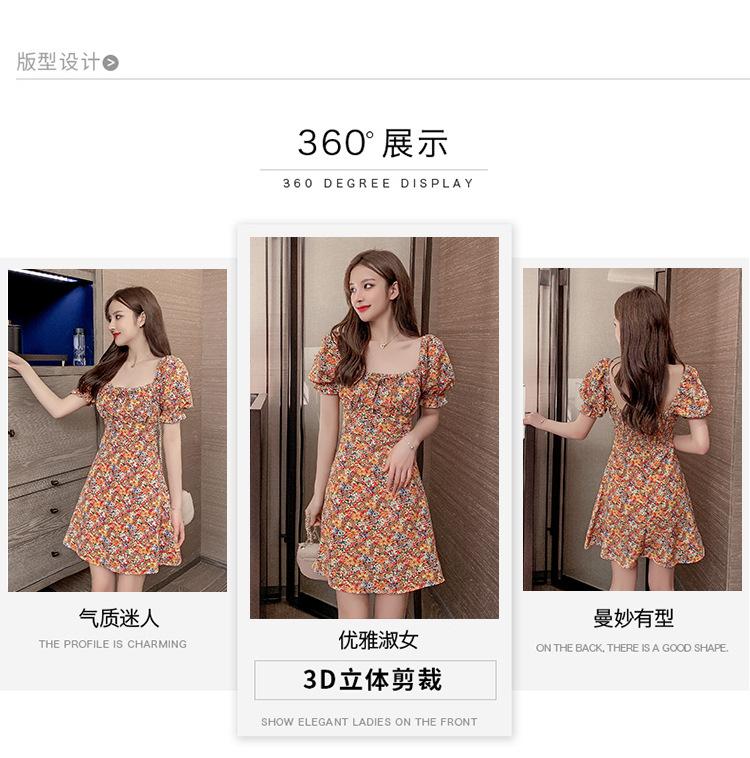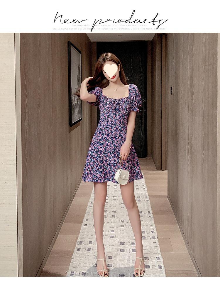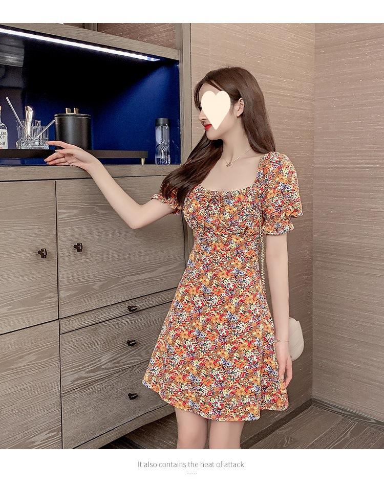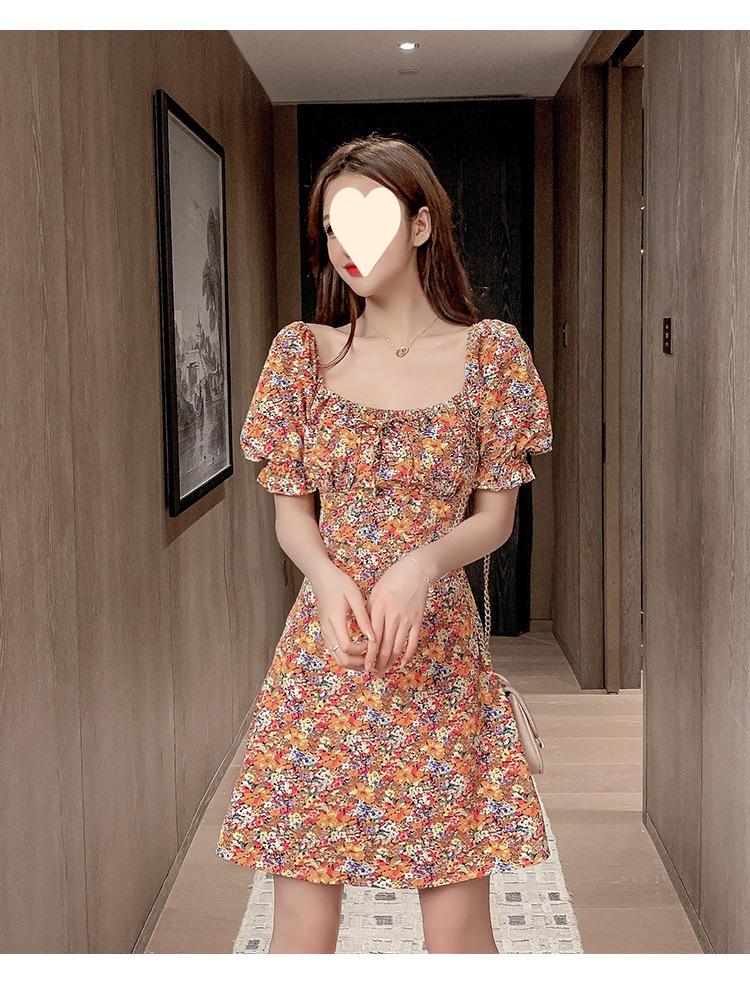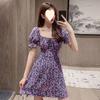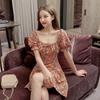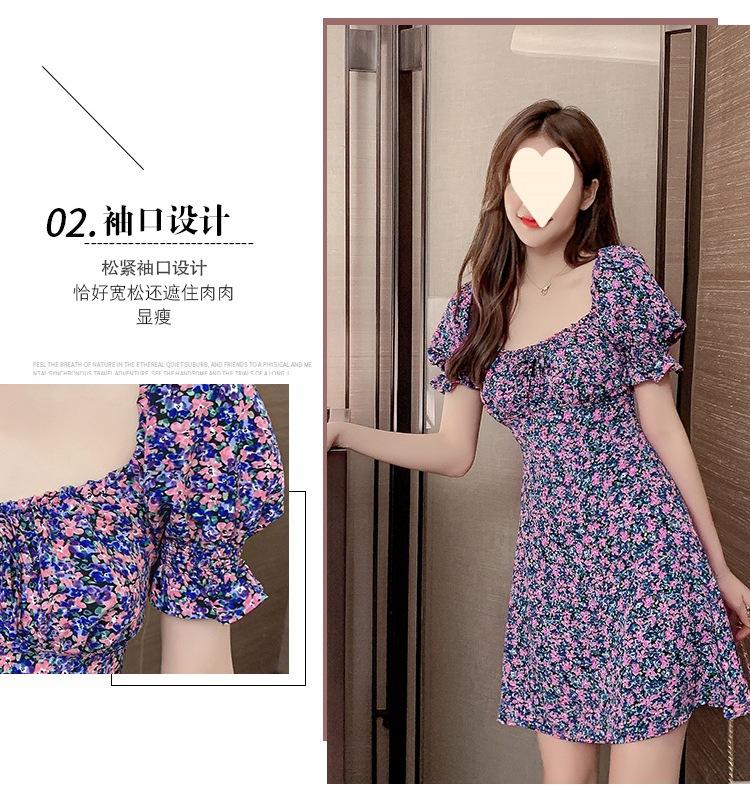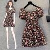 Vestido de Moda Talla Grande para Mujer Verano Nuevo Estilo Retro Francés Cuello Cuadrado Cubre Vientre Adelgazante Manga Corta Abullonada Falda Floral