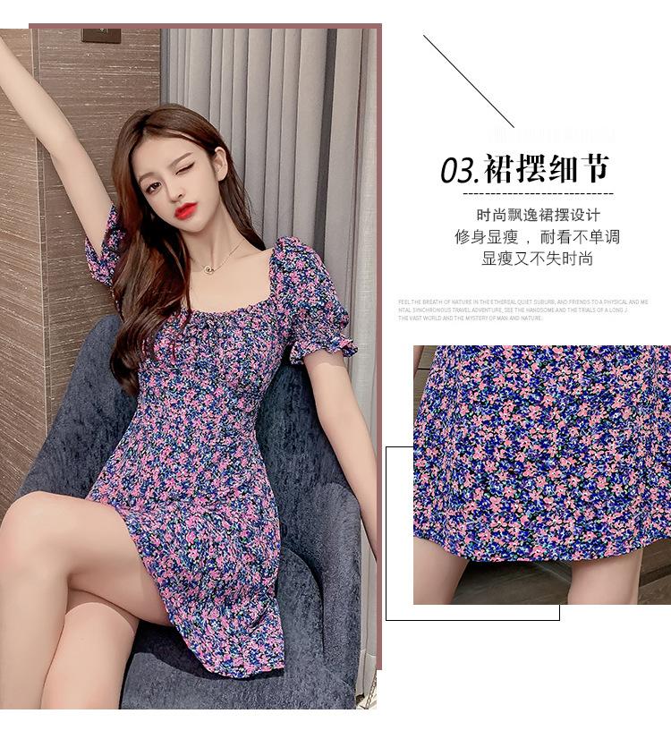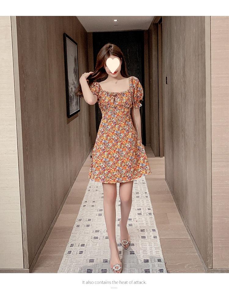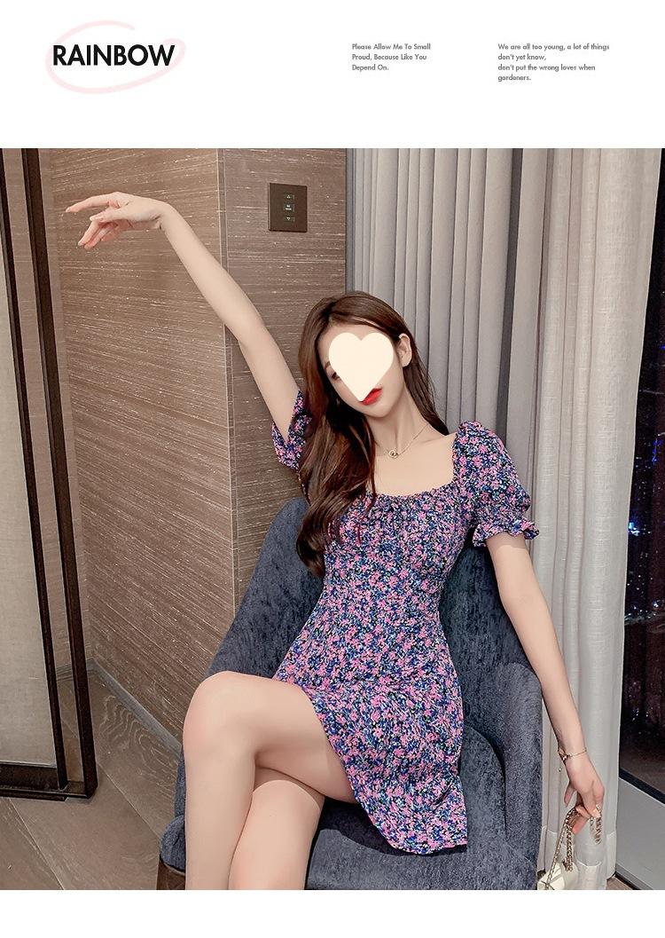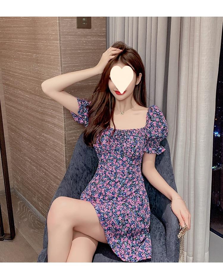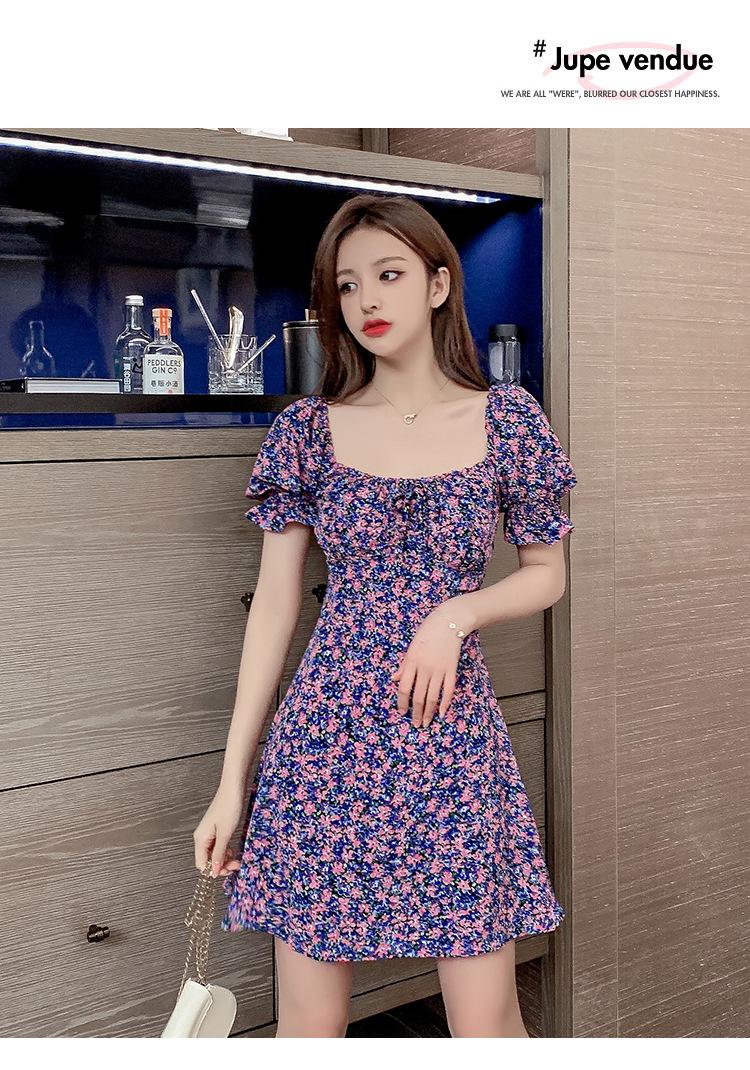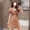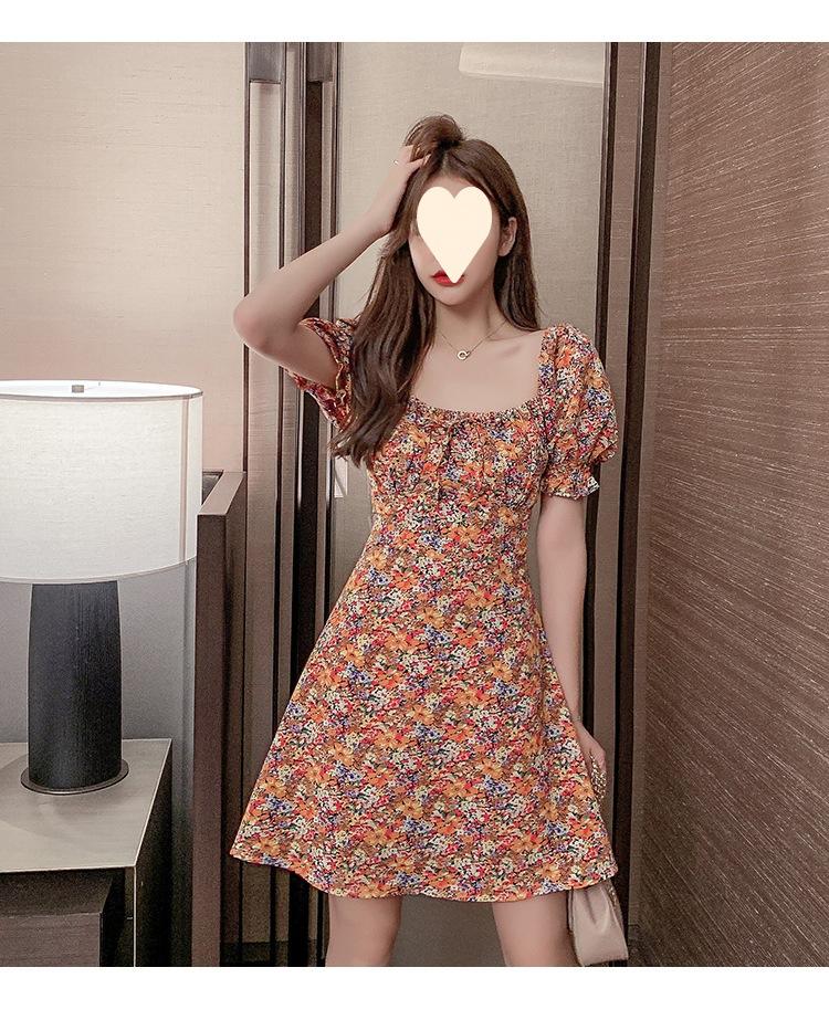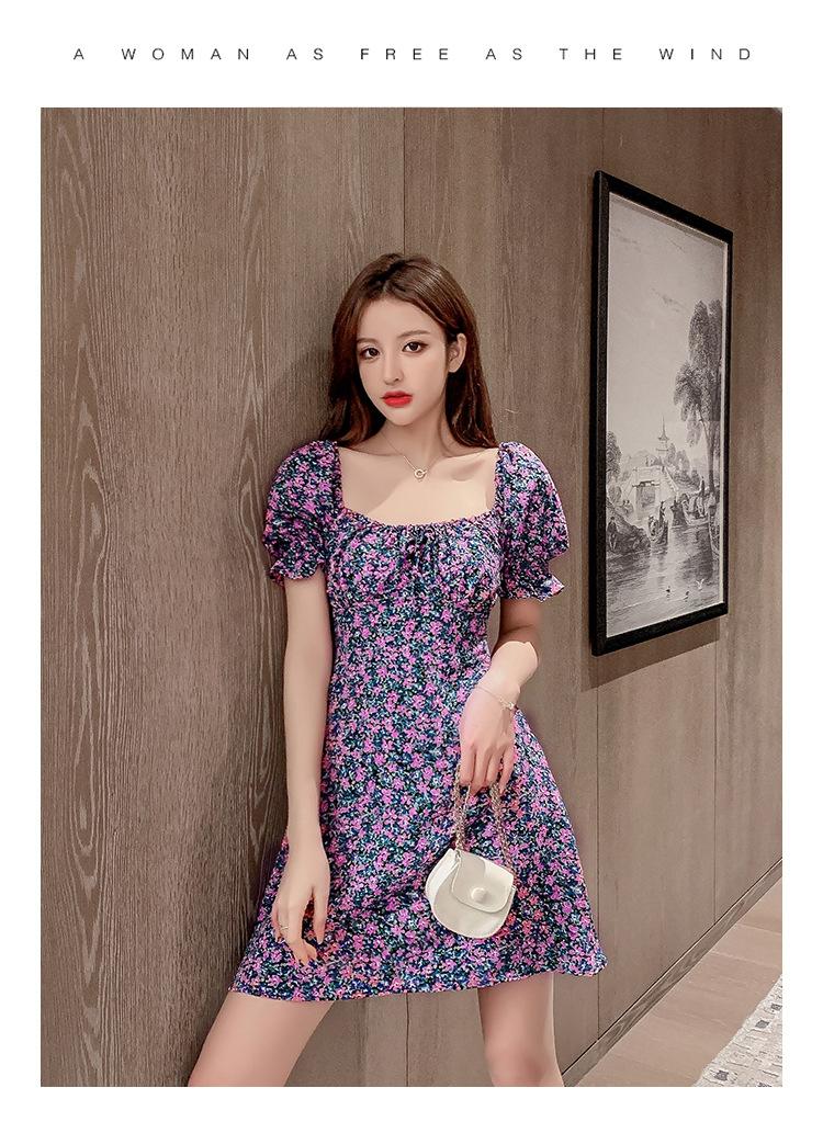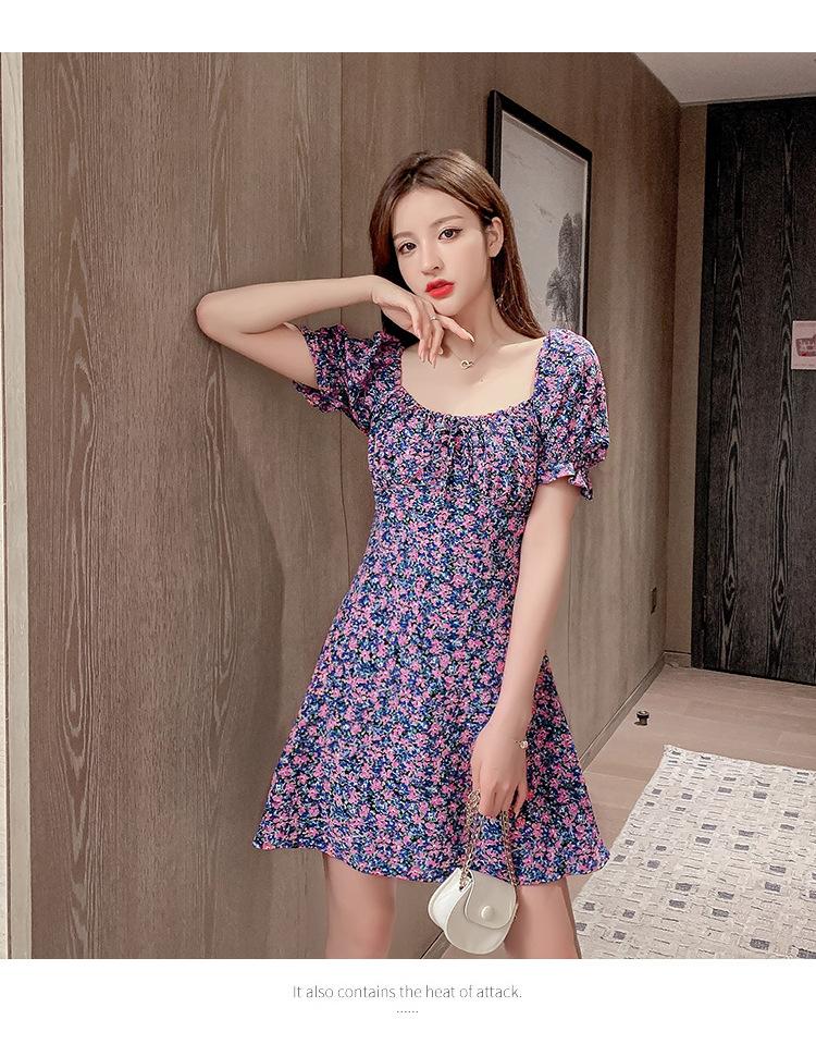 Vestido de Moda Talla Grande para Mujer Verano Nuevo Estilo Retro Francés Cuello Cuadrado Cubre Vientre Adelgazante Manga Corta Abullonada Falda Floral