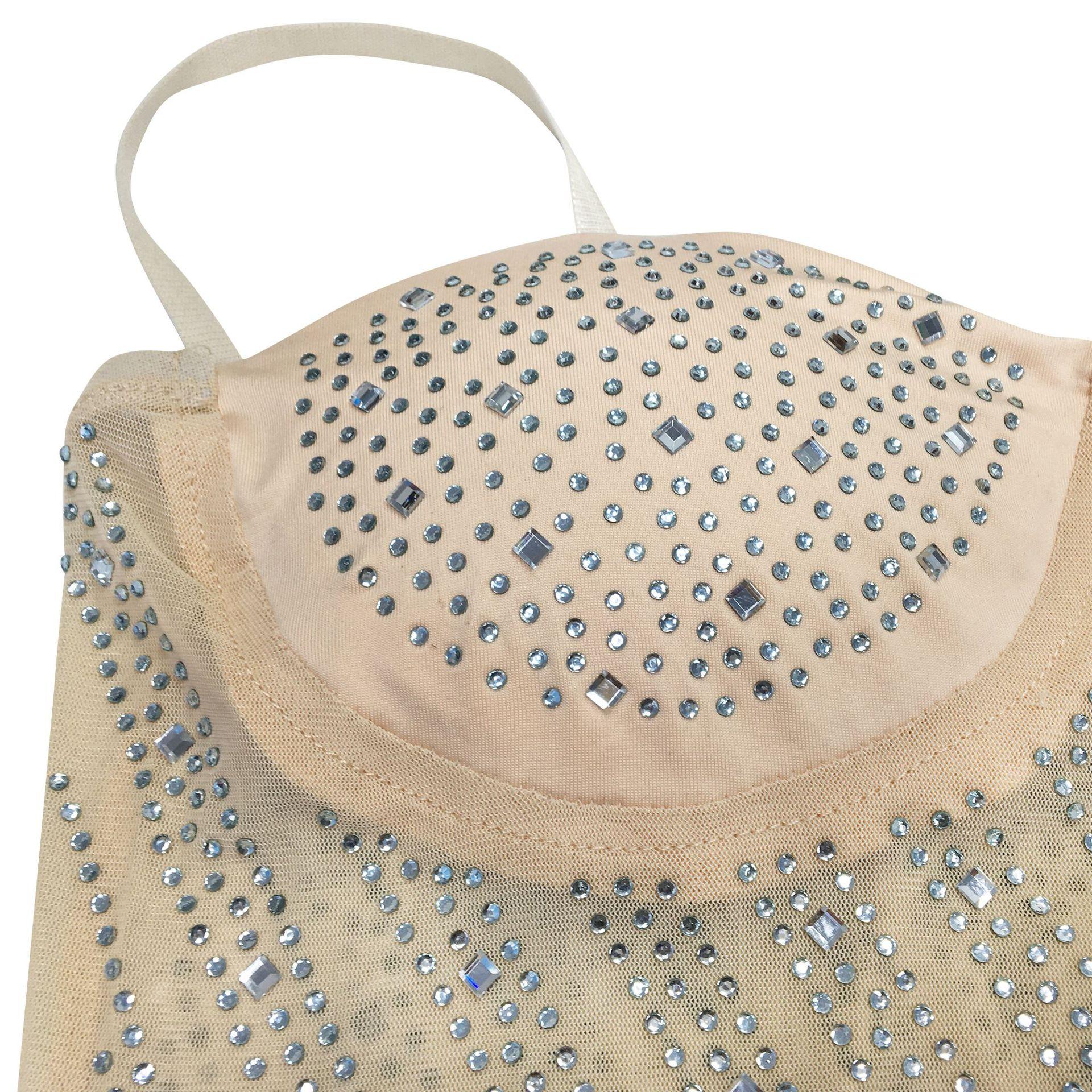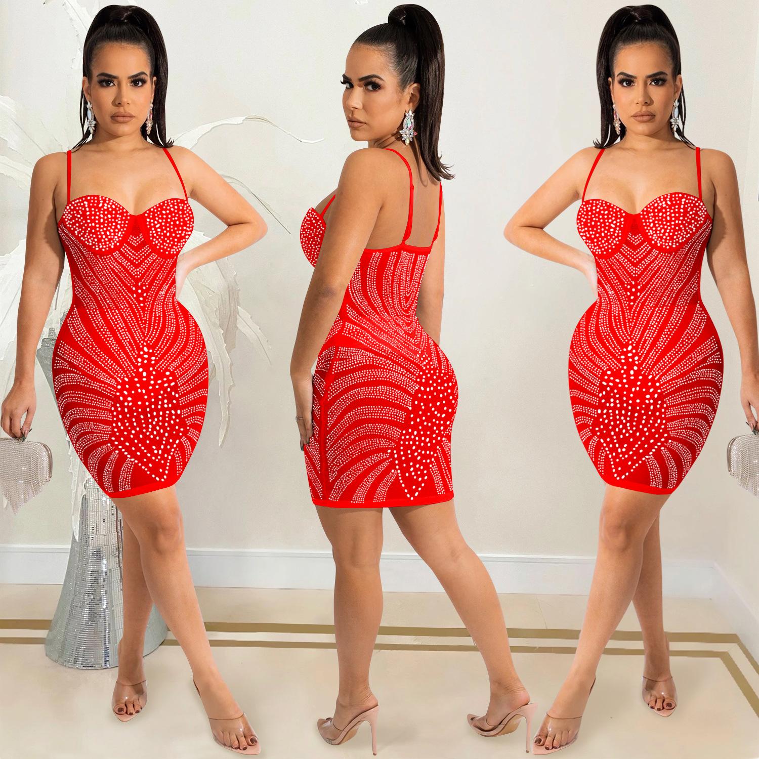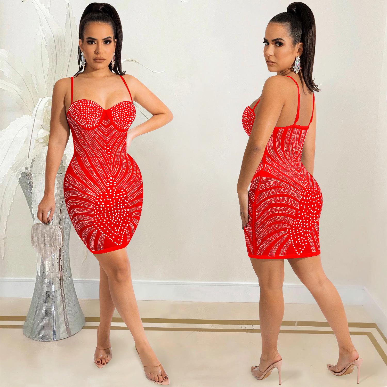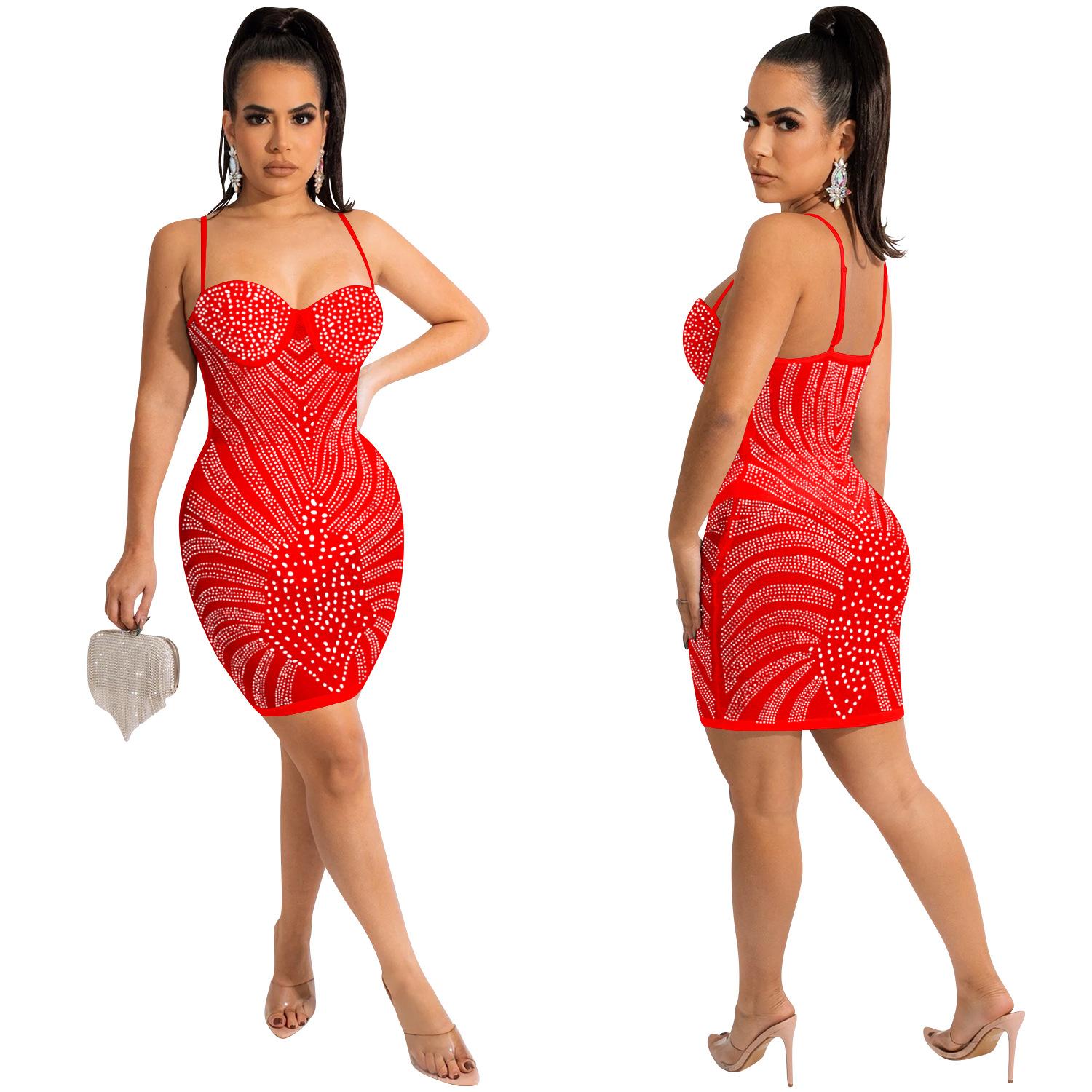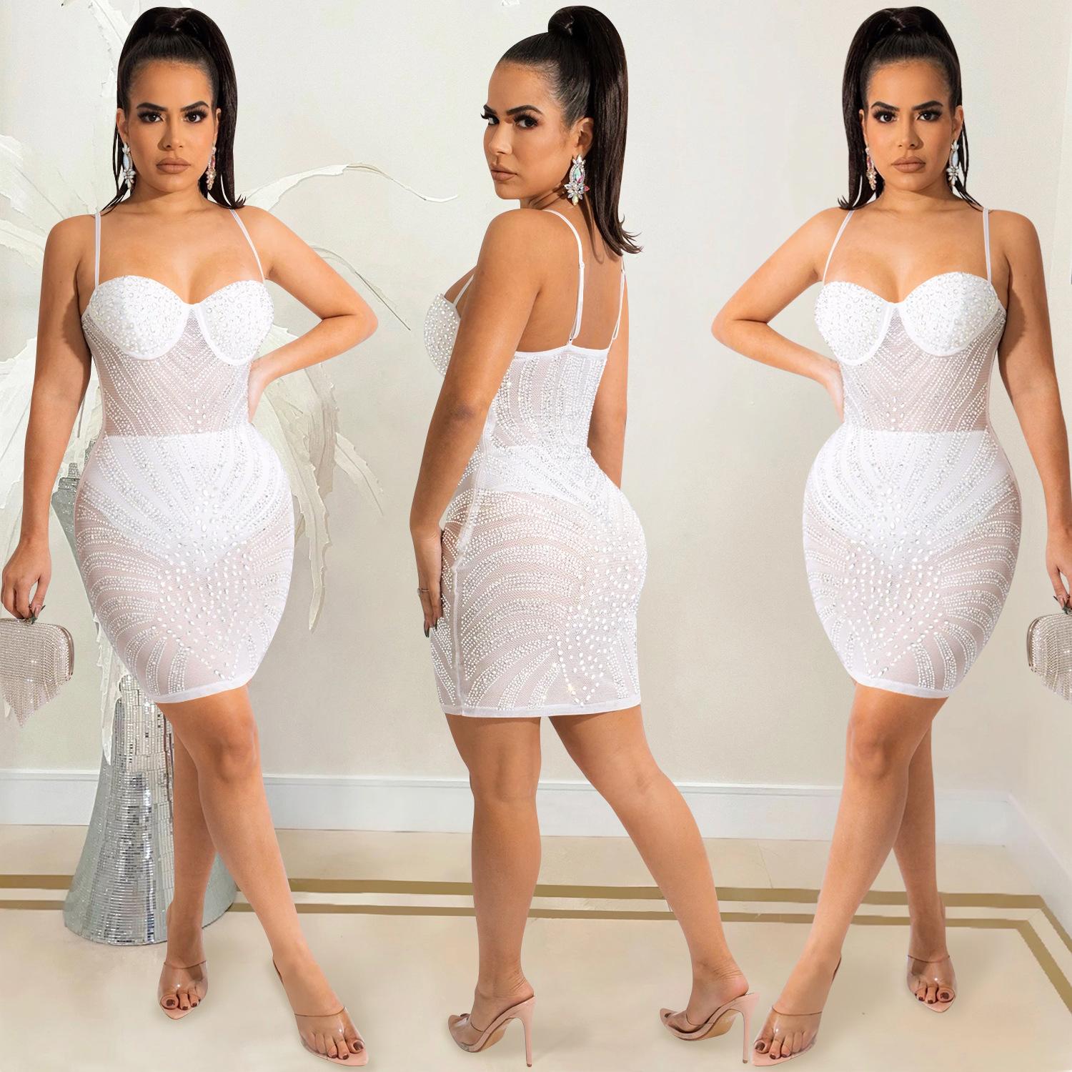 X5650 Vestido midi sin mangas con tirantes finos, transparente, sexy, de malla con diamantes de imitación, para mujer.