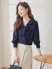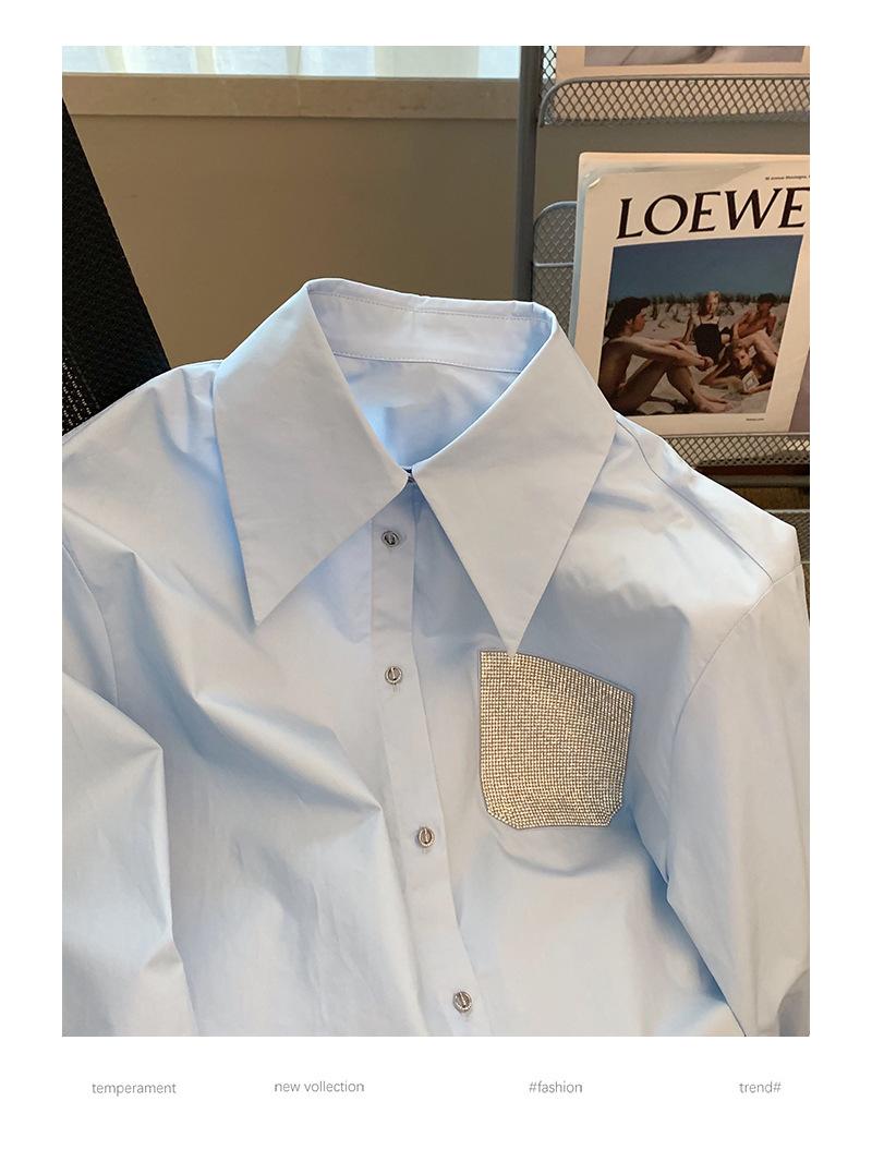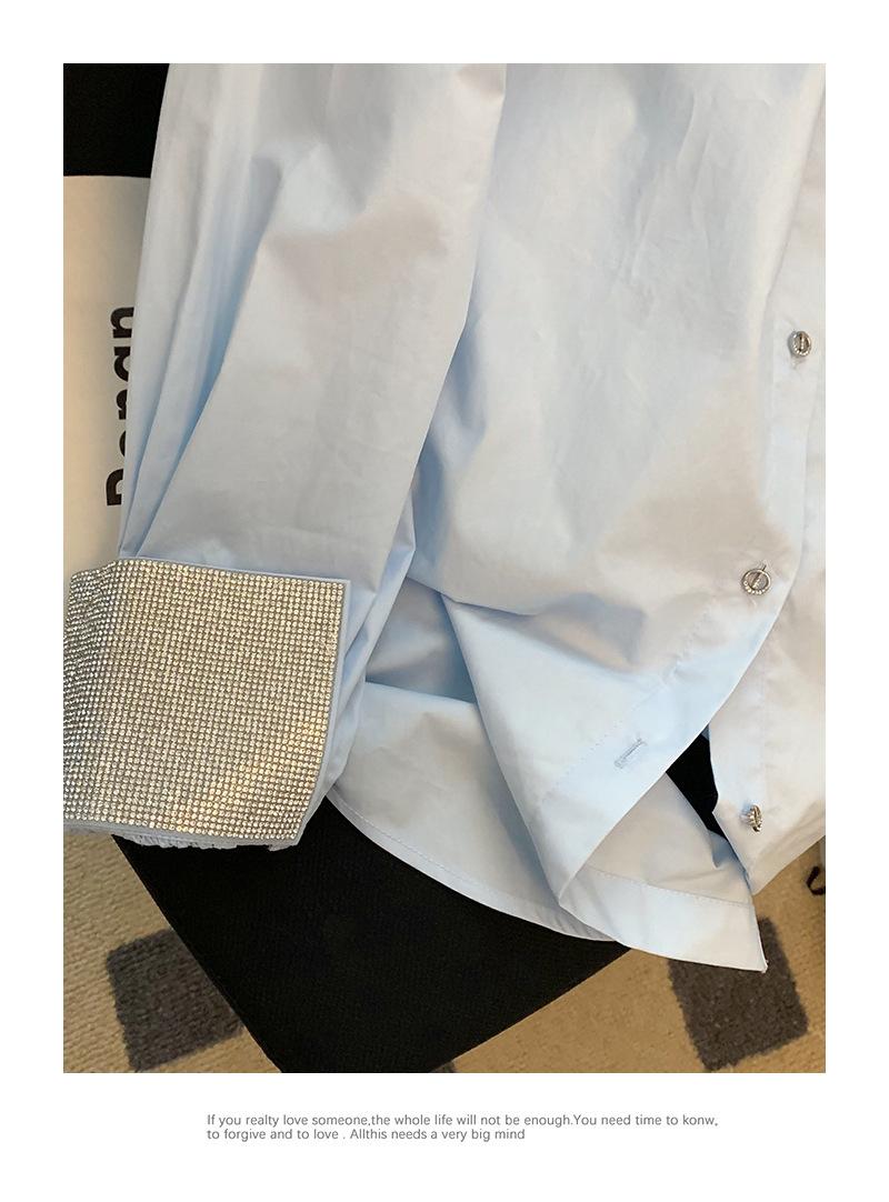 Camisa azul de empalme con diamantes de imitación de manga larga para mujer, primavera 2023, nueva moda, temperamento de alta gama, camisa mediana y larga, tendencia