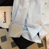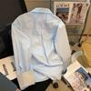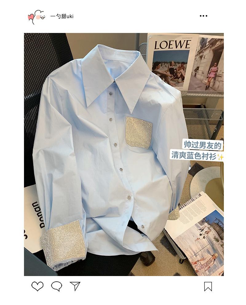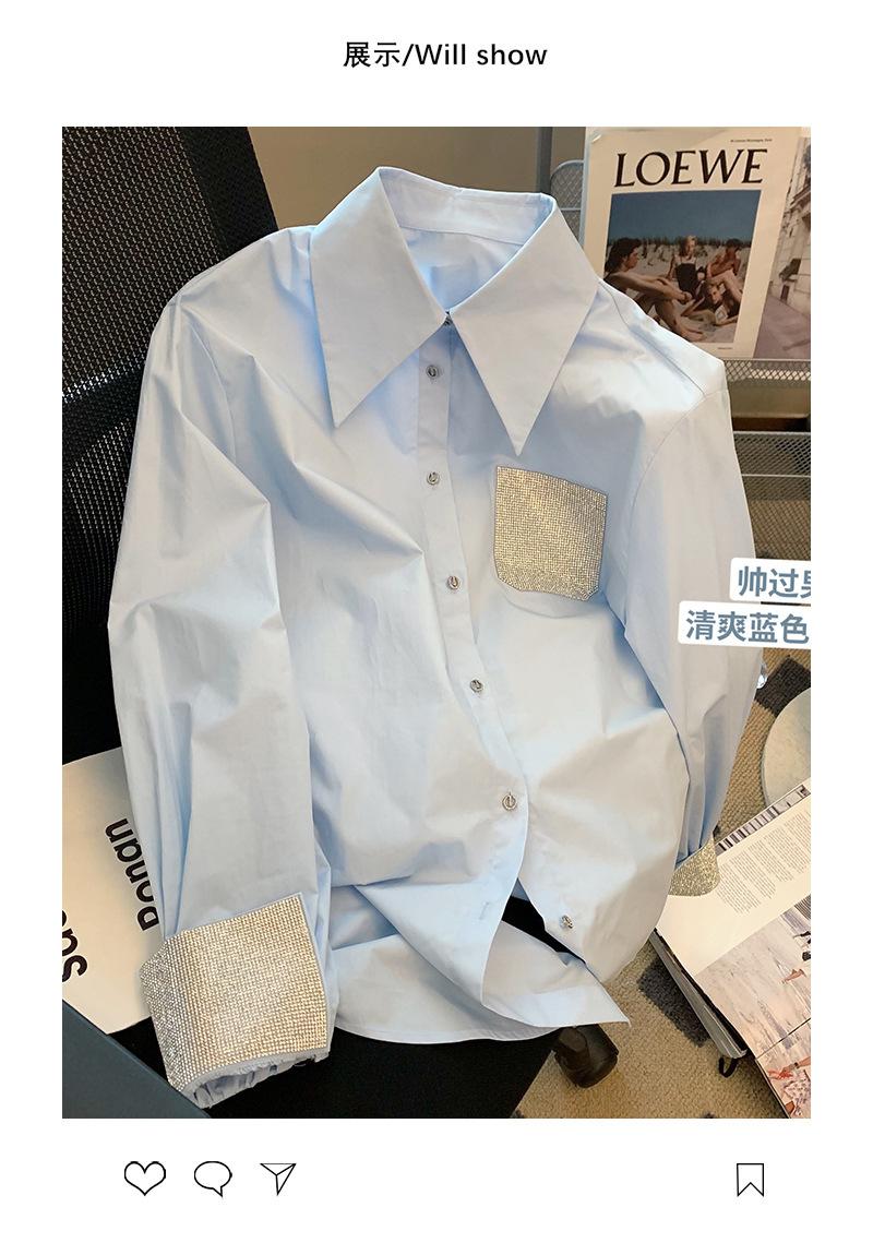 Camisa Azul Empalmada con Diamantes Calientes de Manga Larga para Mujer Primavera 2025 Nueva Moda Camisa Elegante de Gama Alta de Largo Medio Tendencia