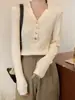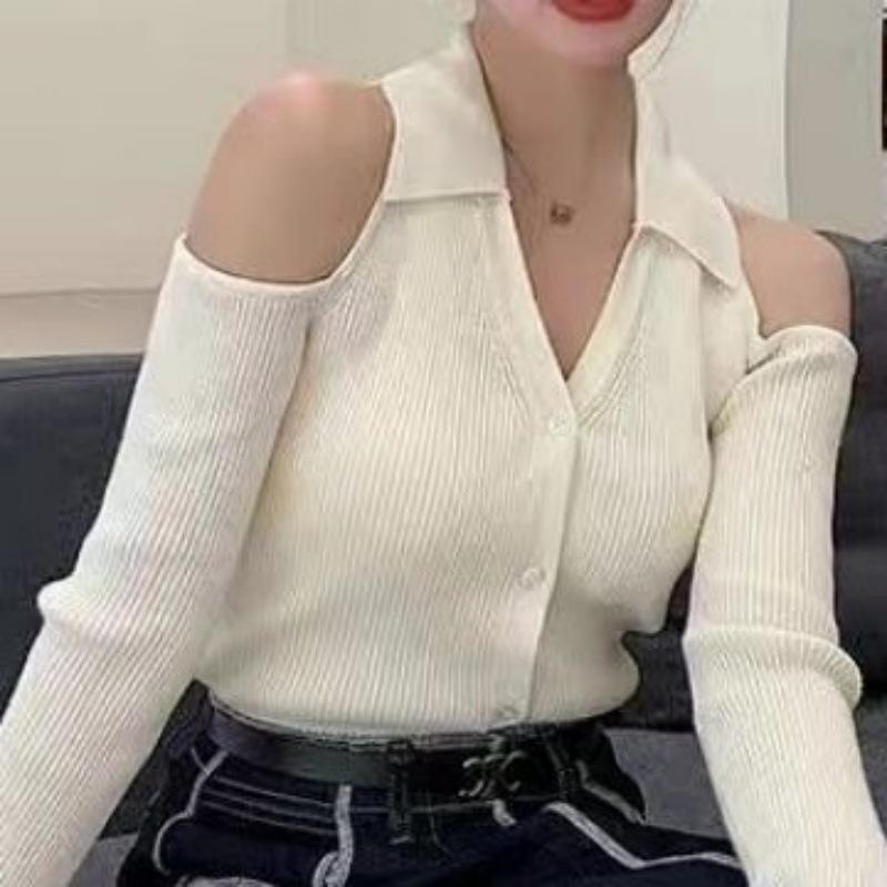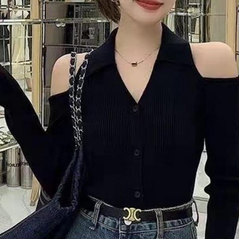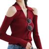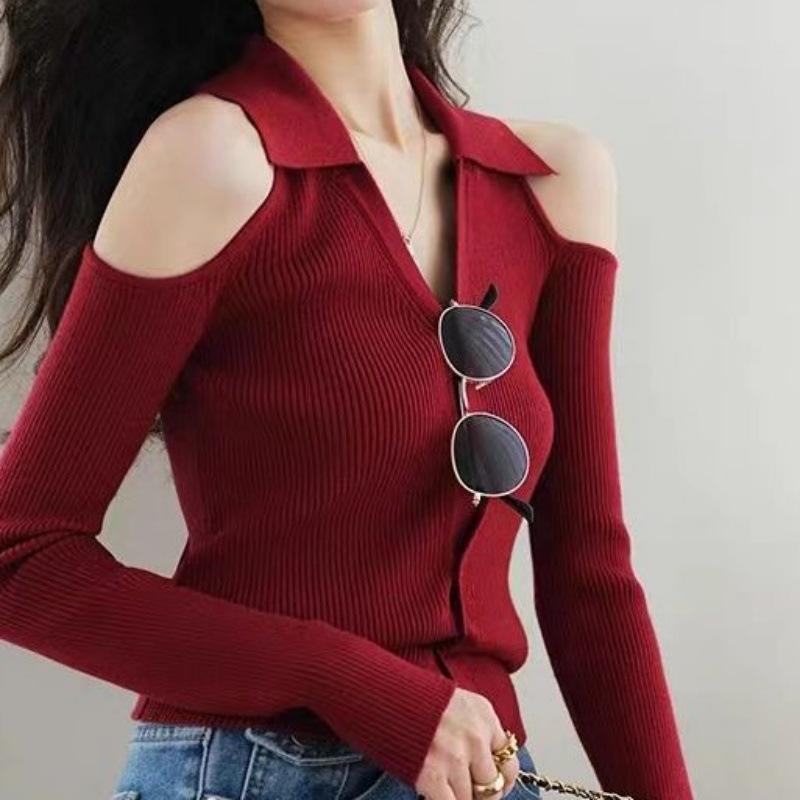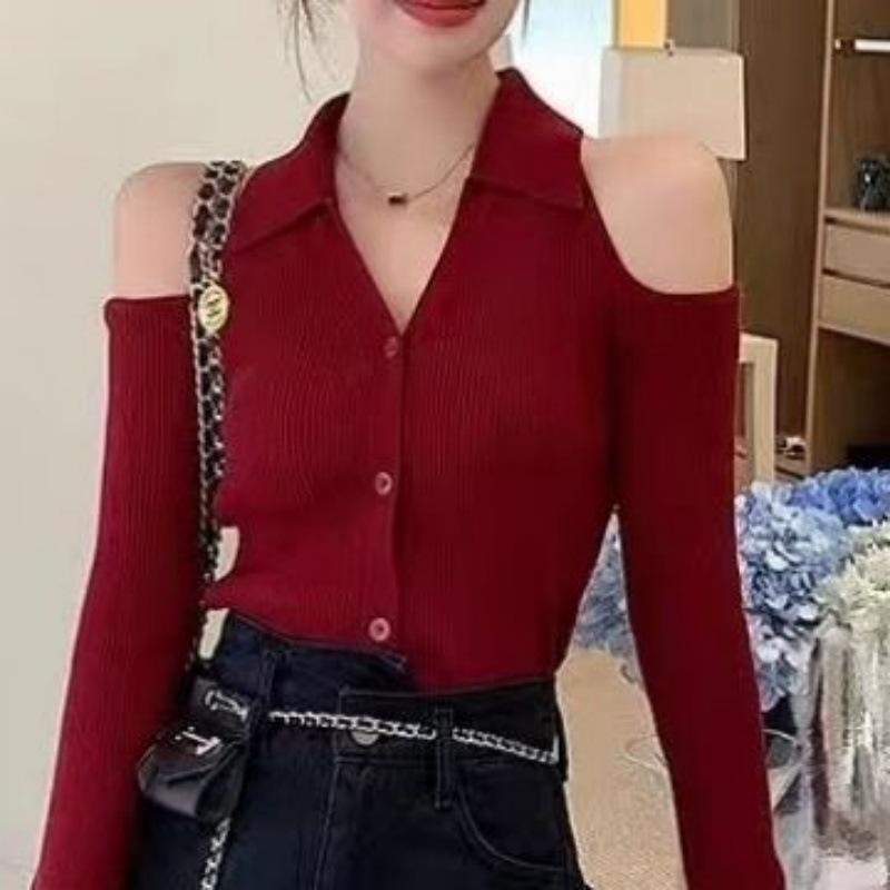 Camisa de punto con cuello en V francés, estilo retro rojo, con hombros descubiertos, para mujer, para otoño, para exteriores, dulce y sexy, top ajustado, manga larga, ropa interior fina