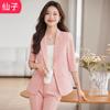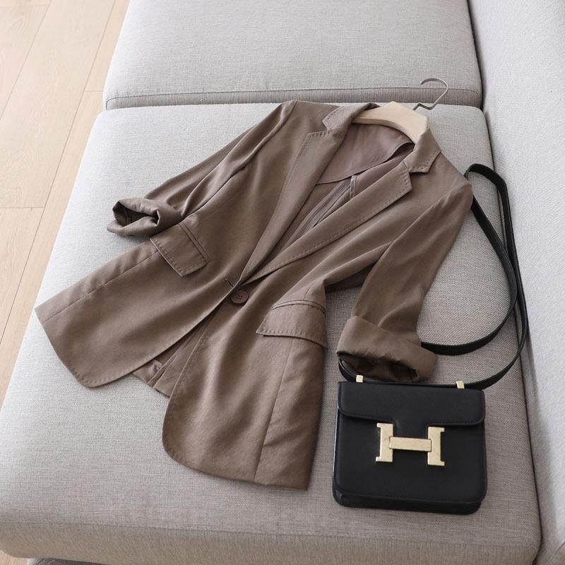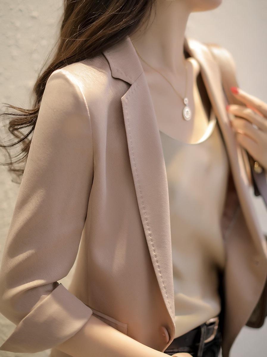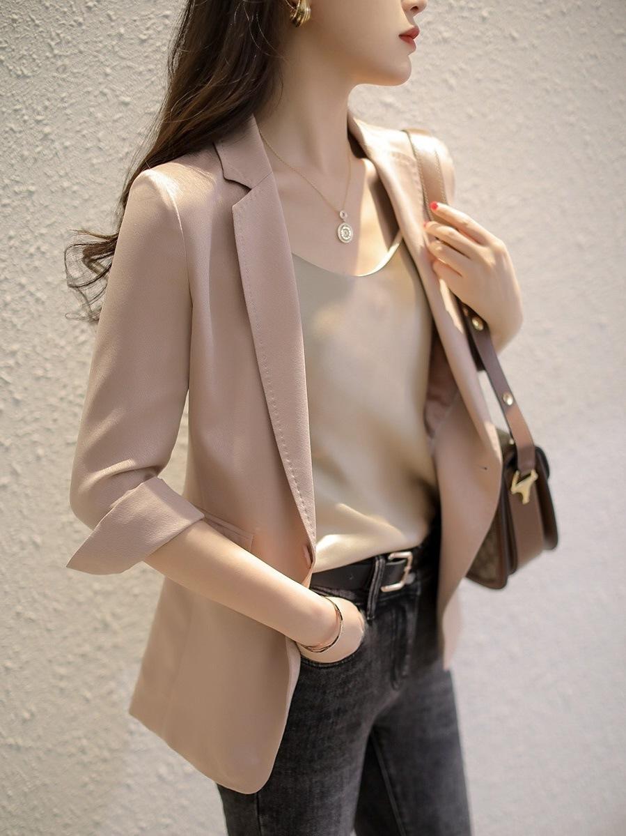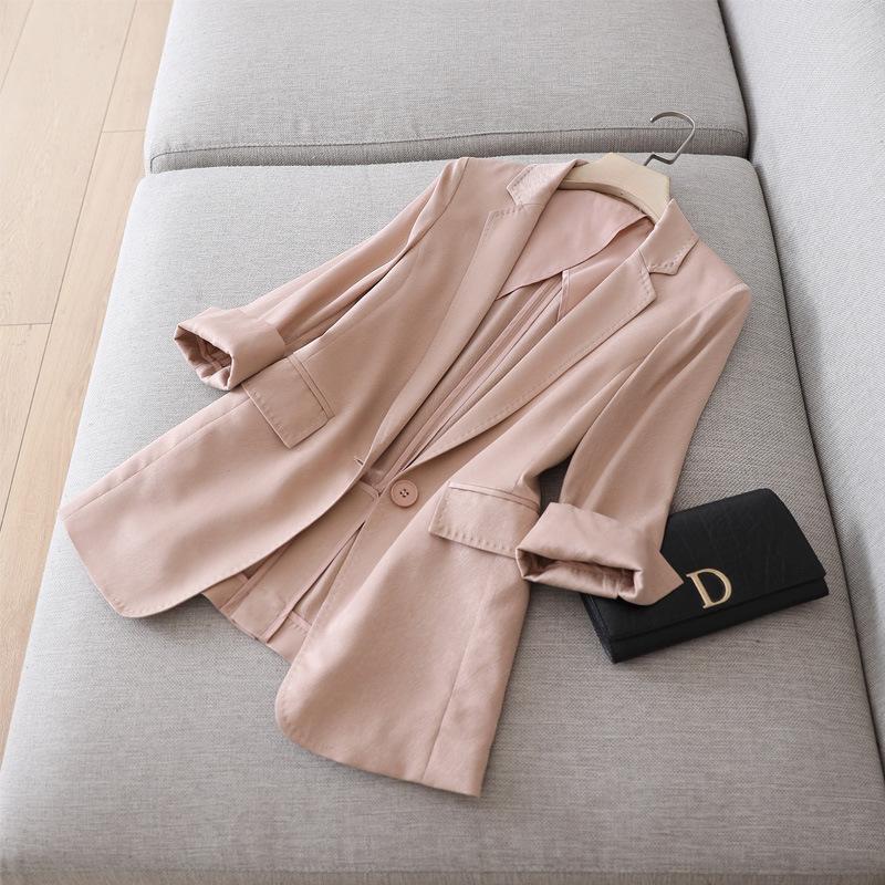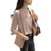 Chaqueta de traje ligera de lujo ajustada de otoño nueva para mujer, traje informal de satén rosa con mangas 3/4 y drapeado fino
