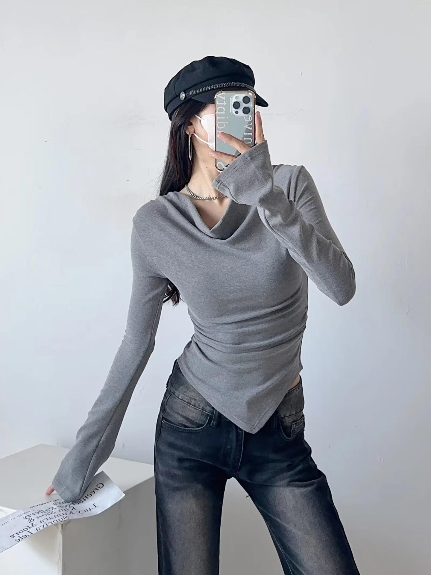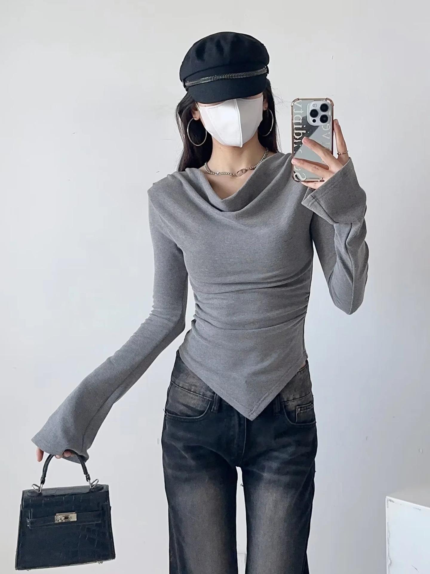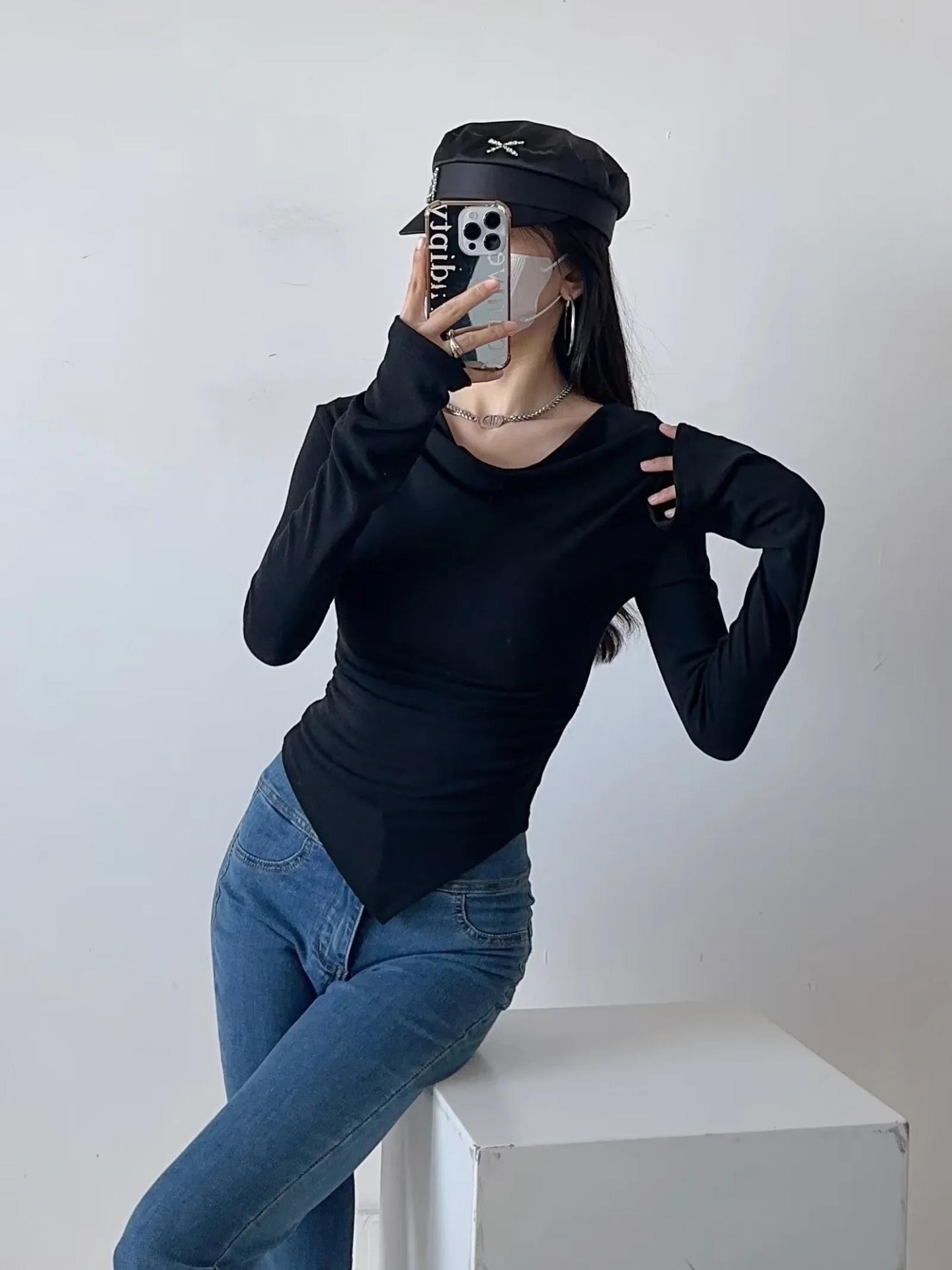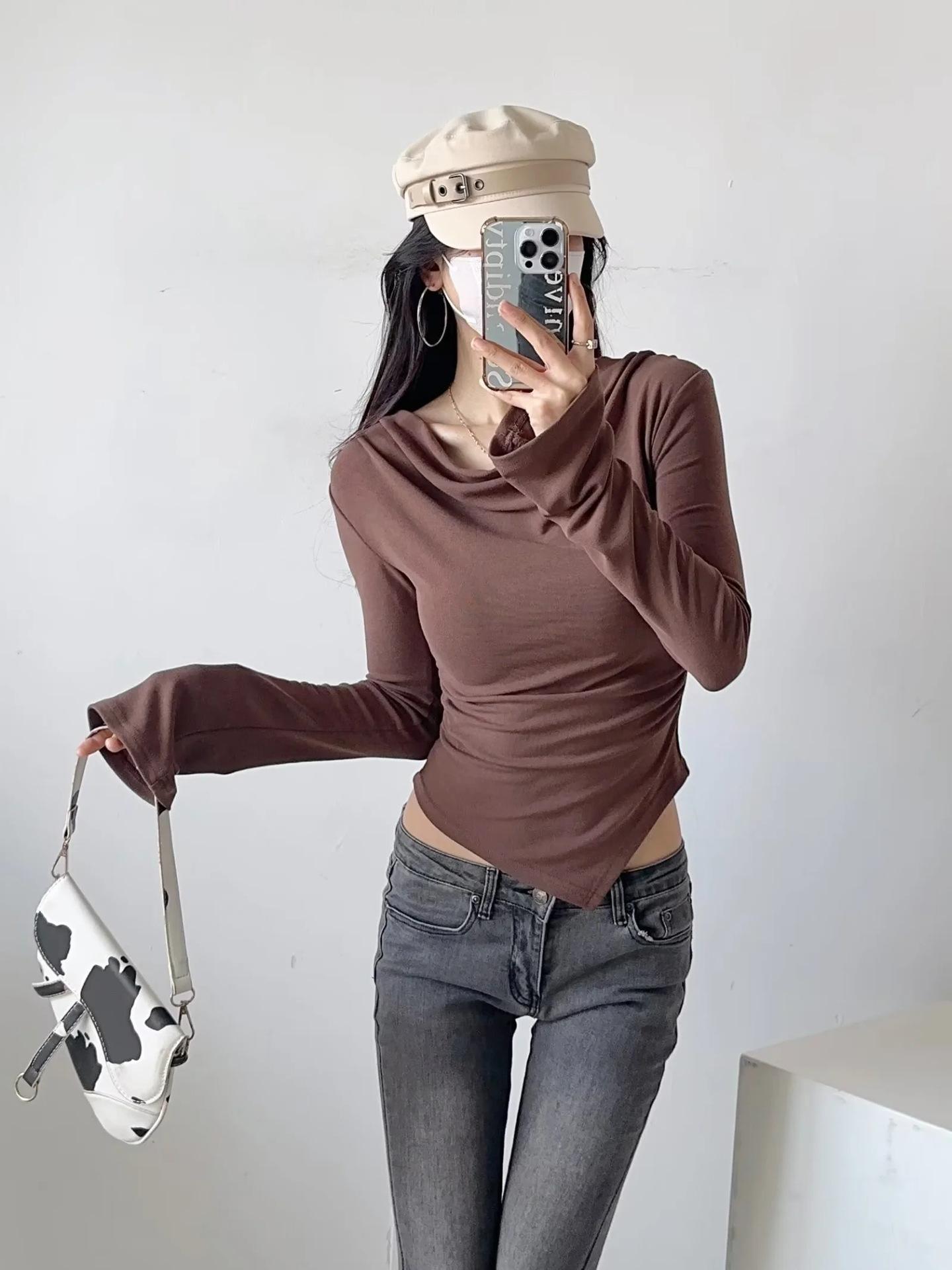 Camiseta de otoño con hombros descubiertos y temperamento de chica dulce y caliente para mujer, ropa interior irregular de puro deseo, camisa de manga larga adelgazante