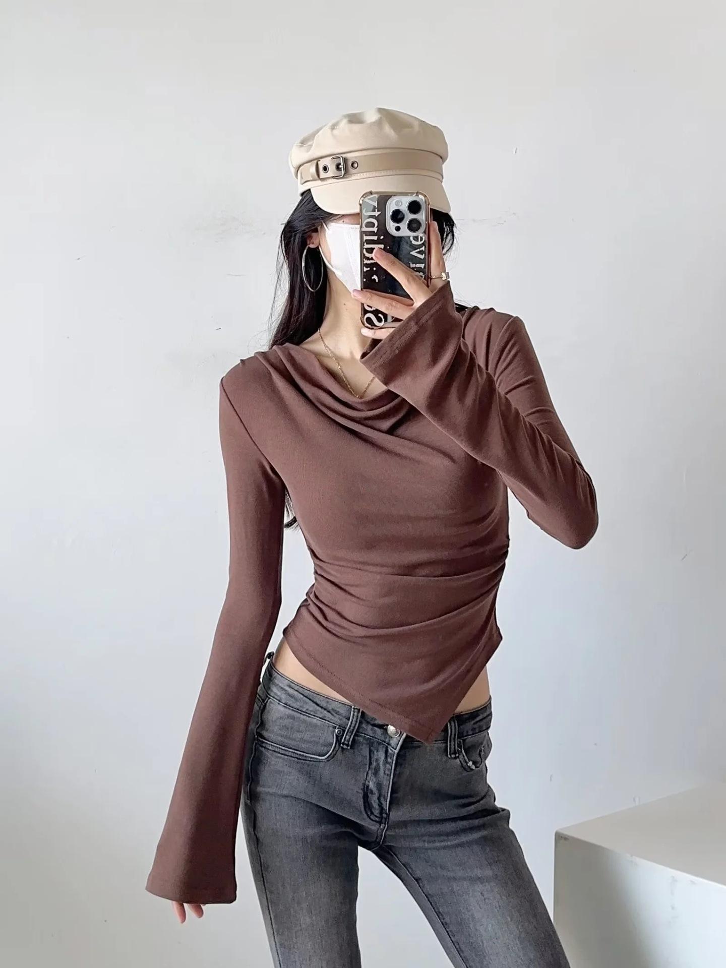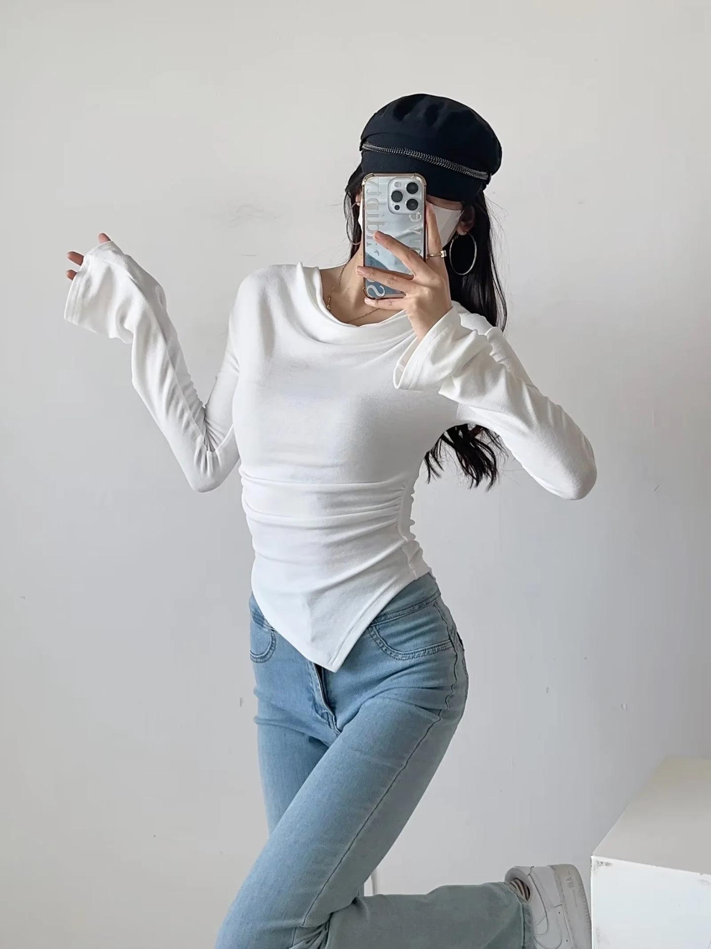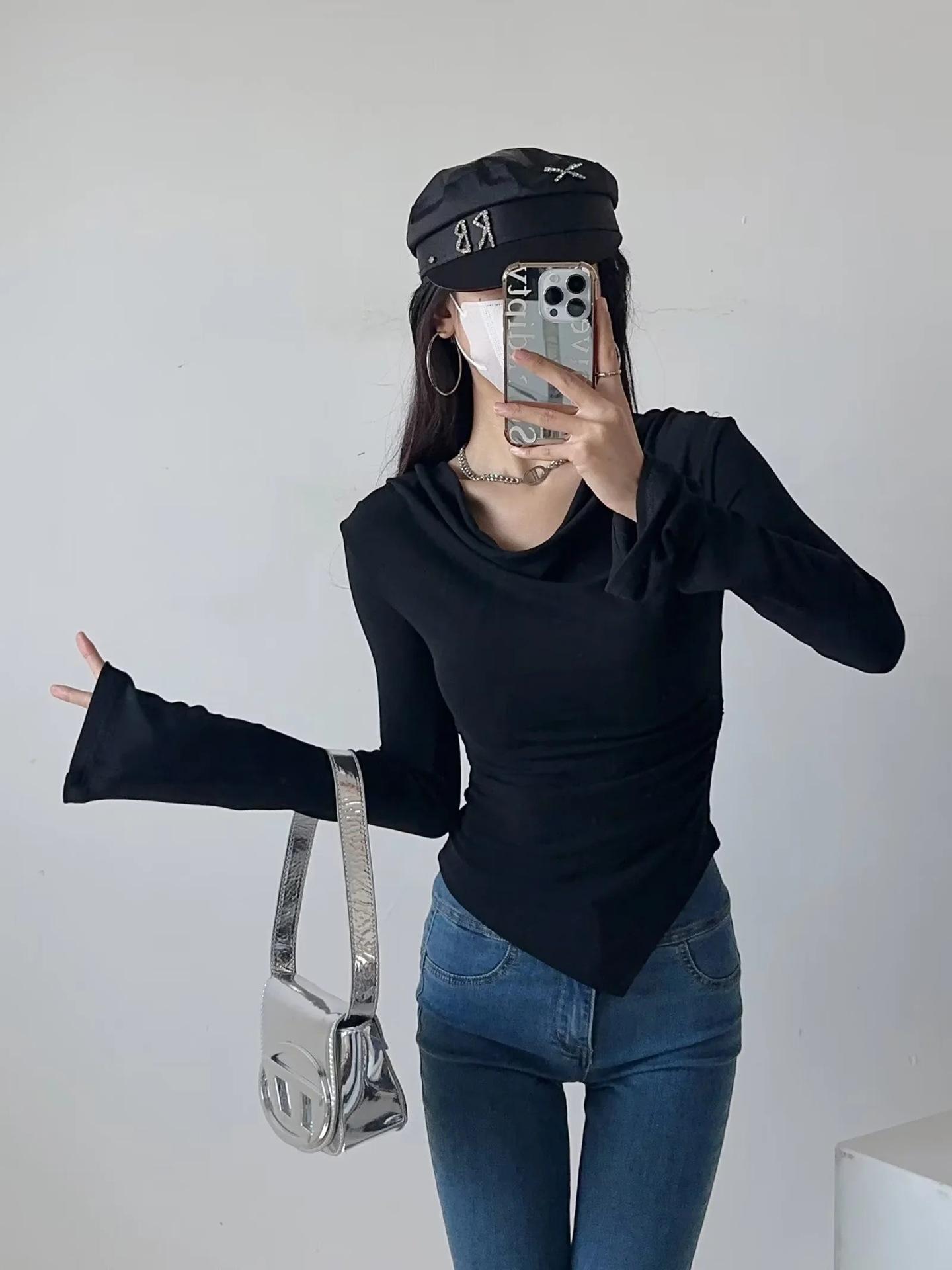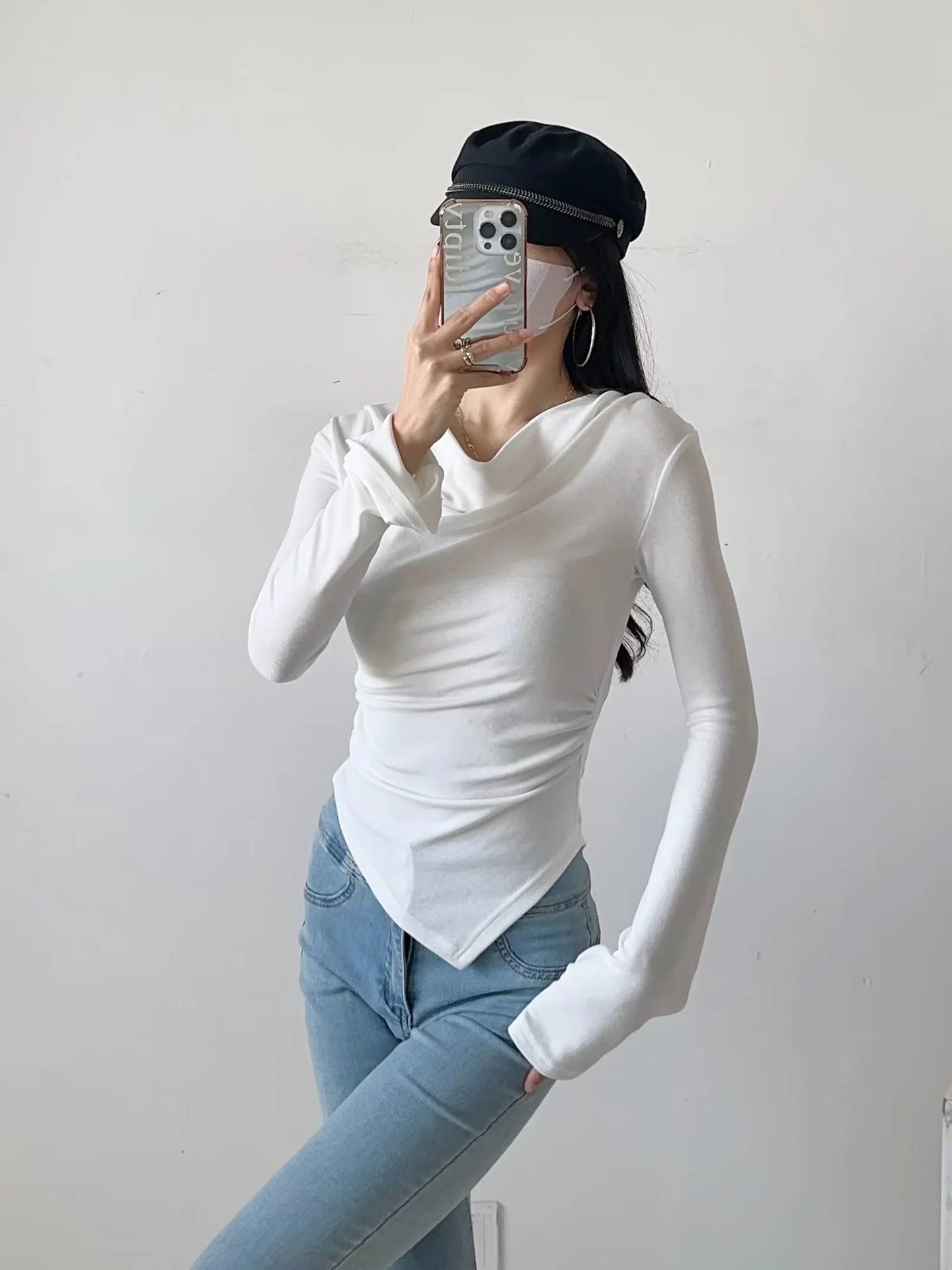 Camiseta de otoño con hombros descubiertos y temperamento de chica dulce y caliente para mujer, ropa interior irregular de puro deseo, camisa de manga larga adelgazante
