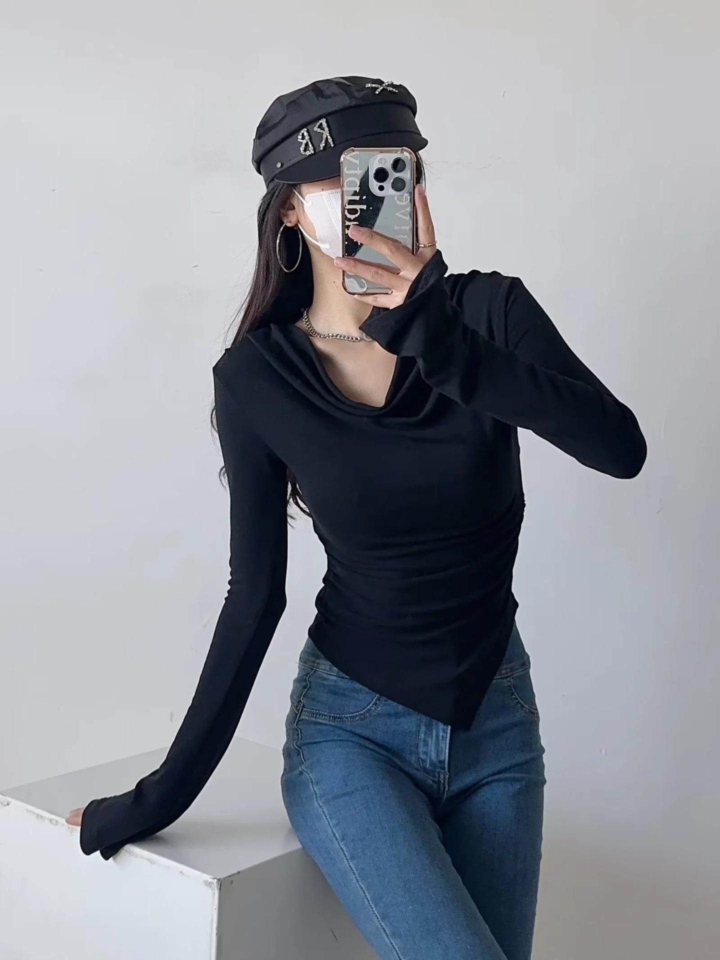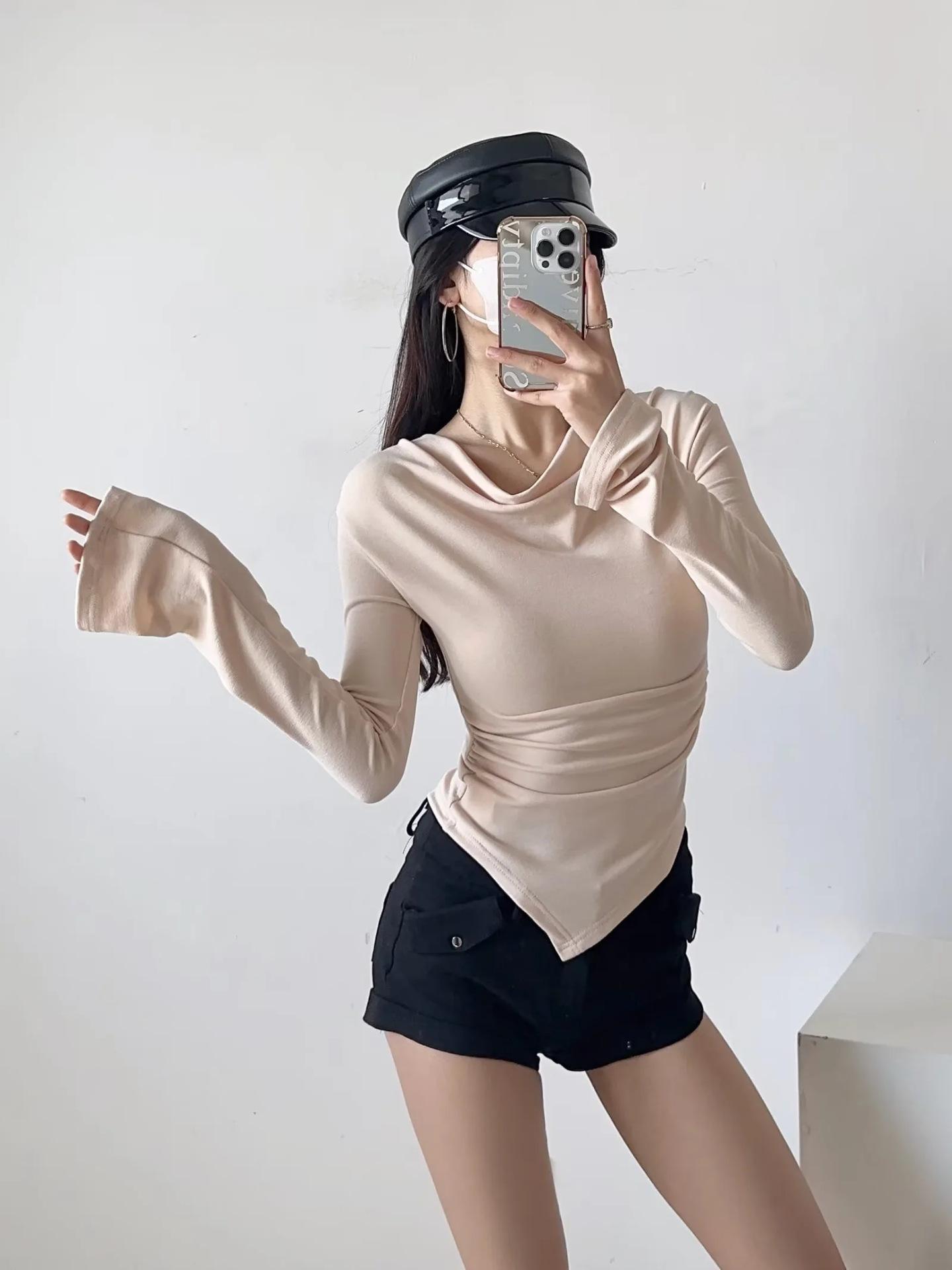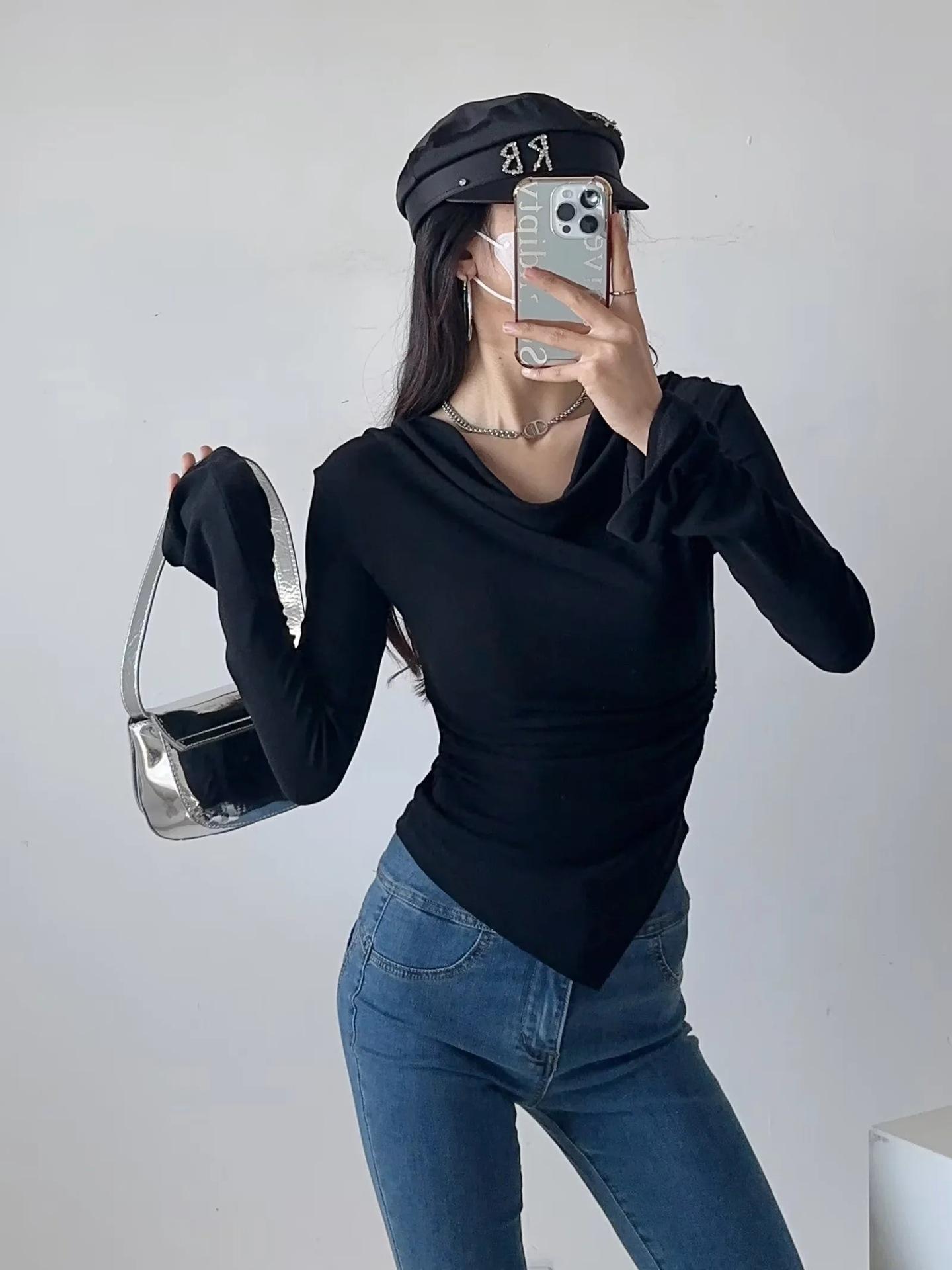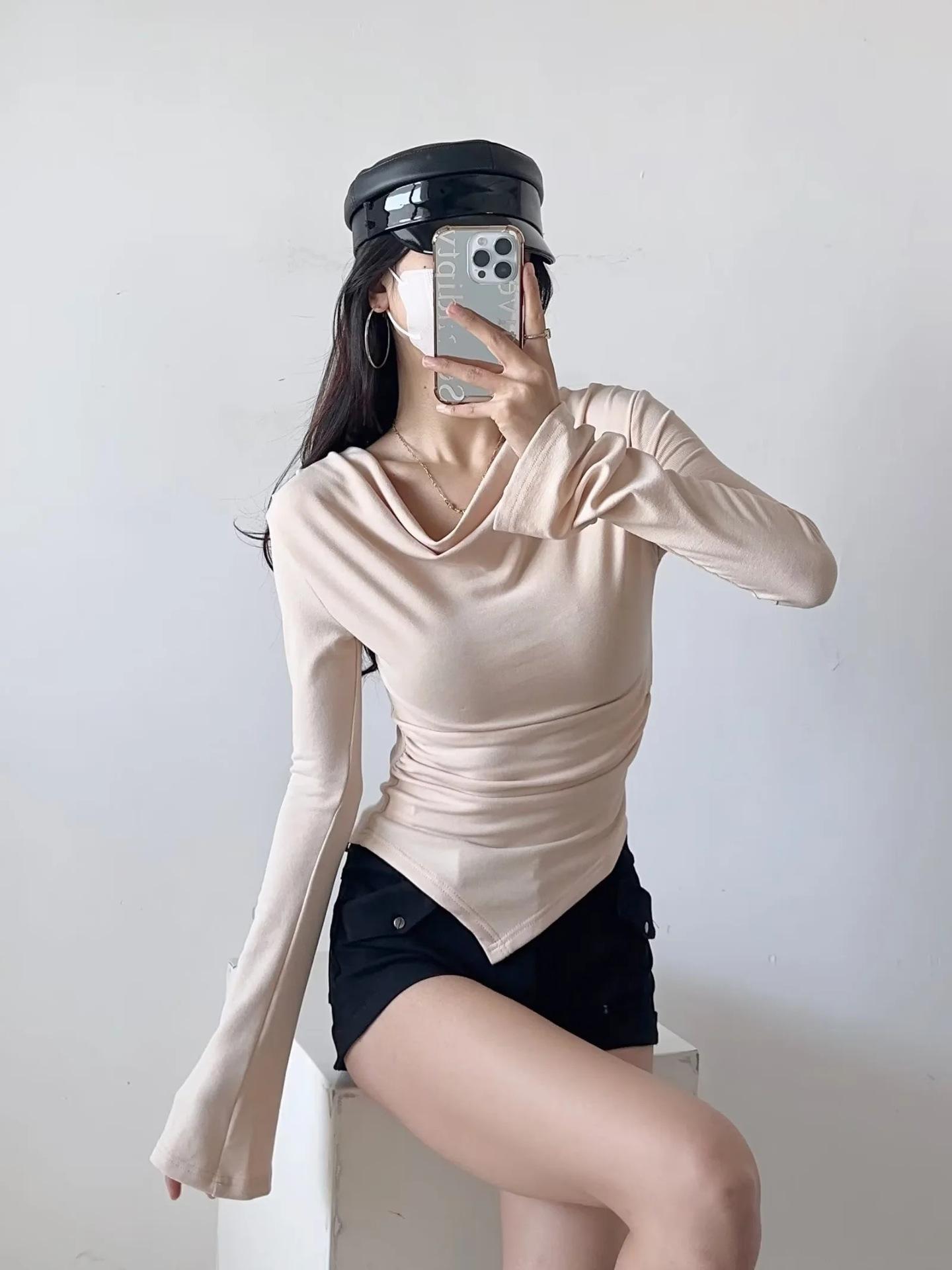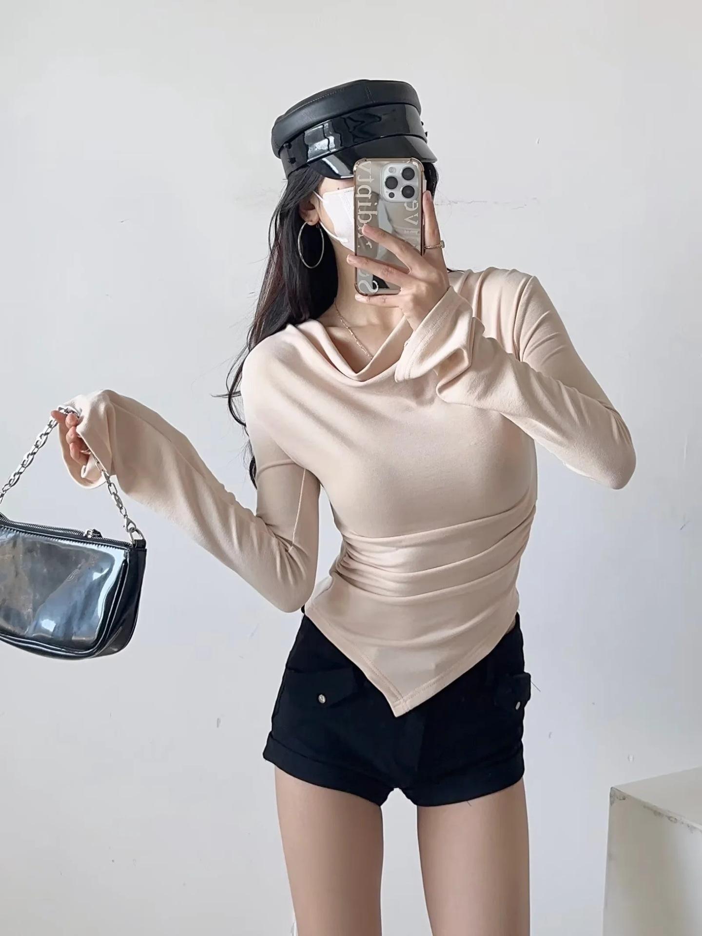 Camiseta de otoño con hombros descubiertos y temperamento de chica dulce y caliente para mujer, ropa interior irregular de puro deseo, camisa de manga larga adelgazante