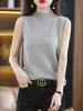 Camiseta de manga corta para mujer, 60% lana peinada ultrafina, base ajustada, sin mangas, cuello semialto interior fino.