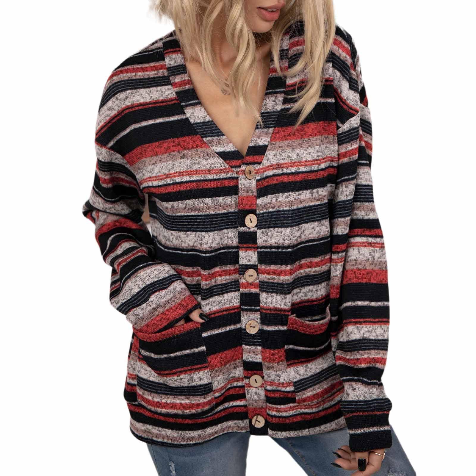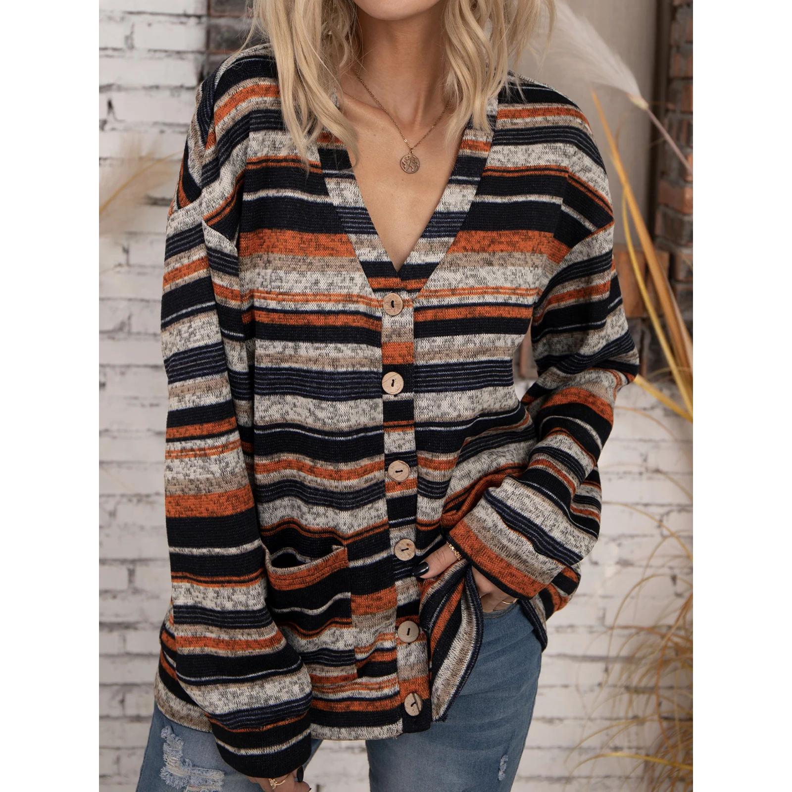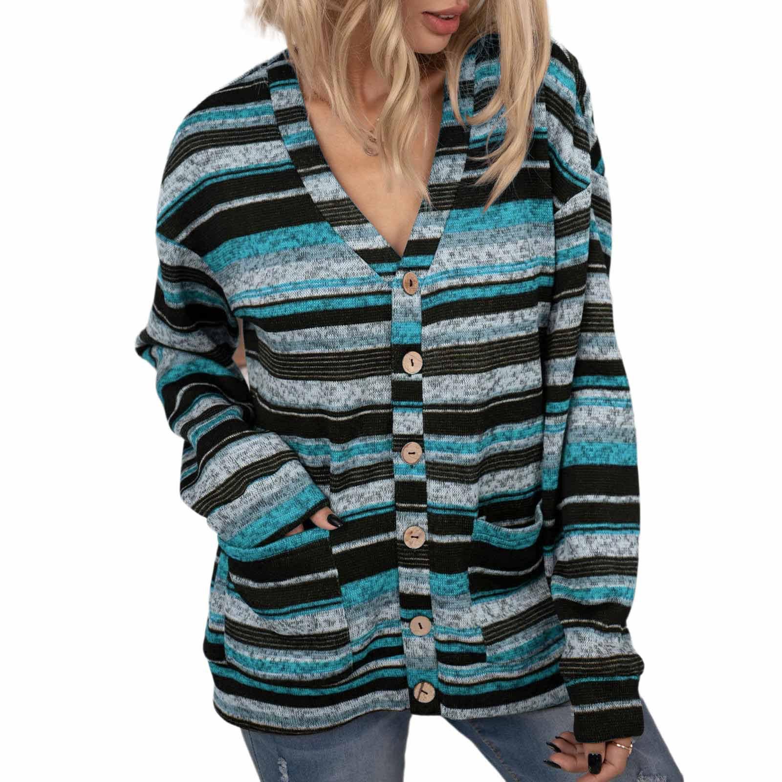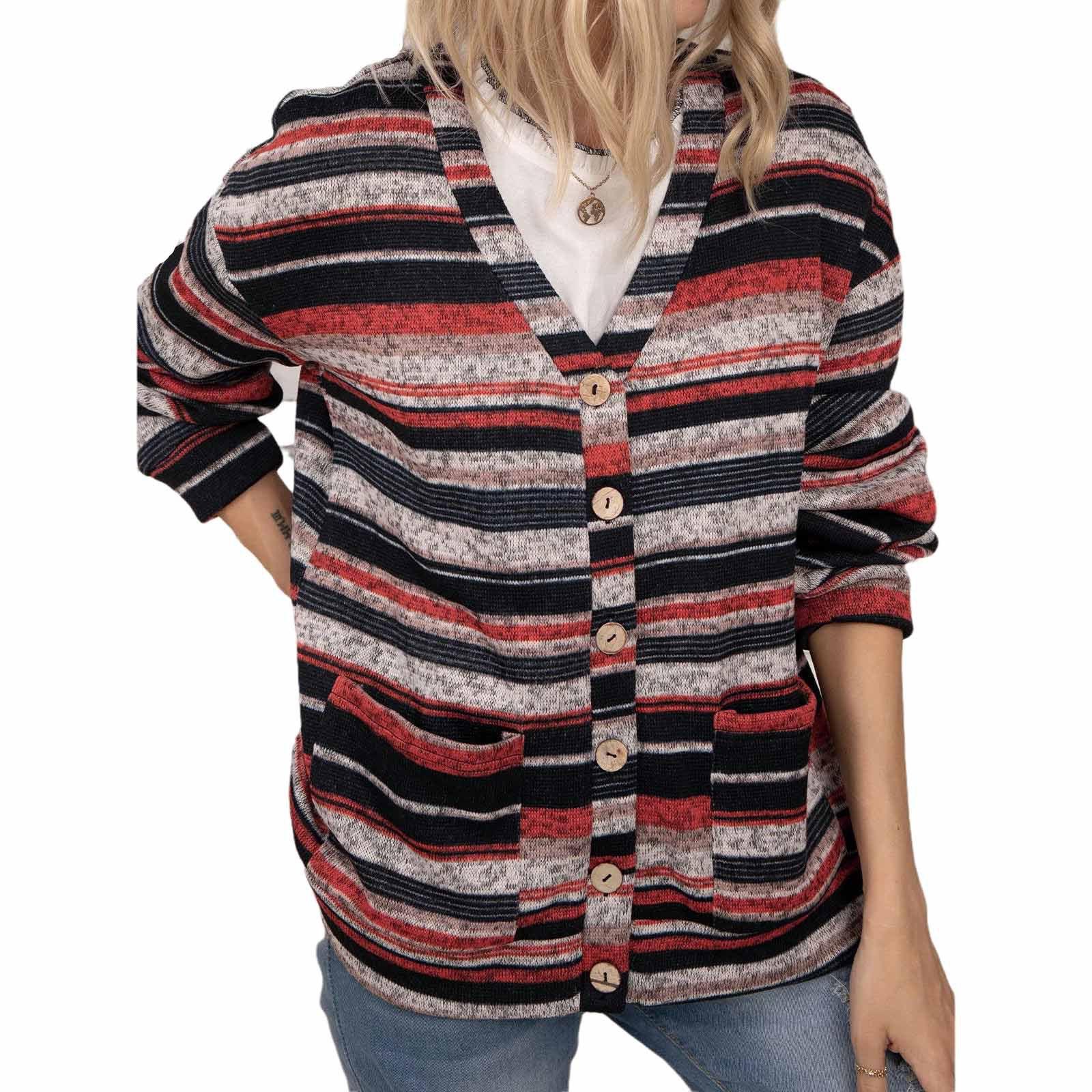 Cárdigan de punto con cuello en V de otoño europeo y americano, suéter de manga larga con bolsillo de un solo pecho, top informal holgado de color en contraste en stock