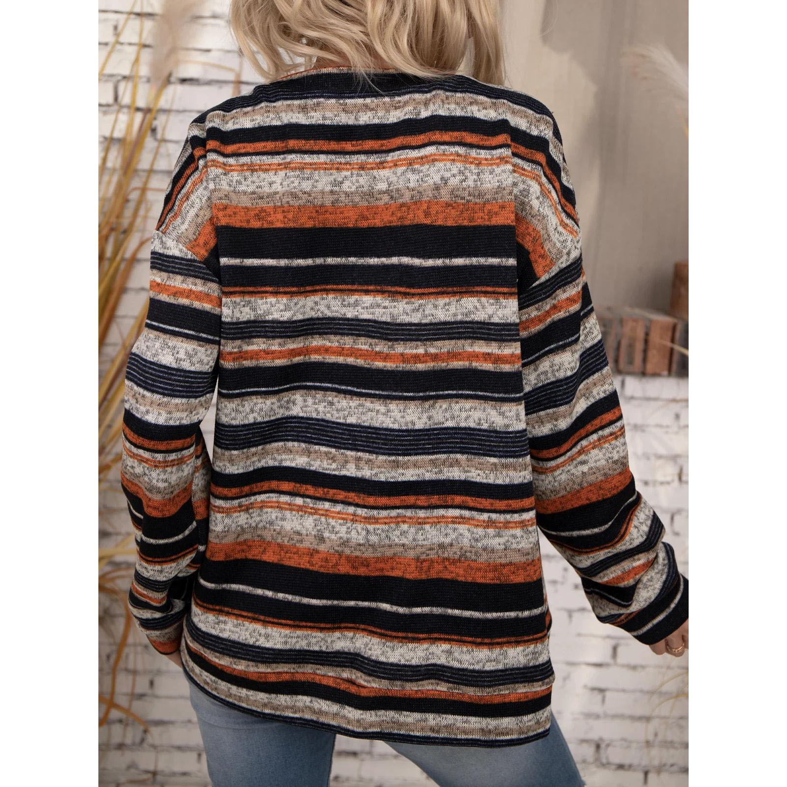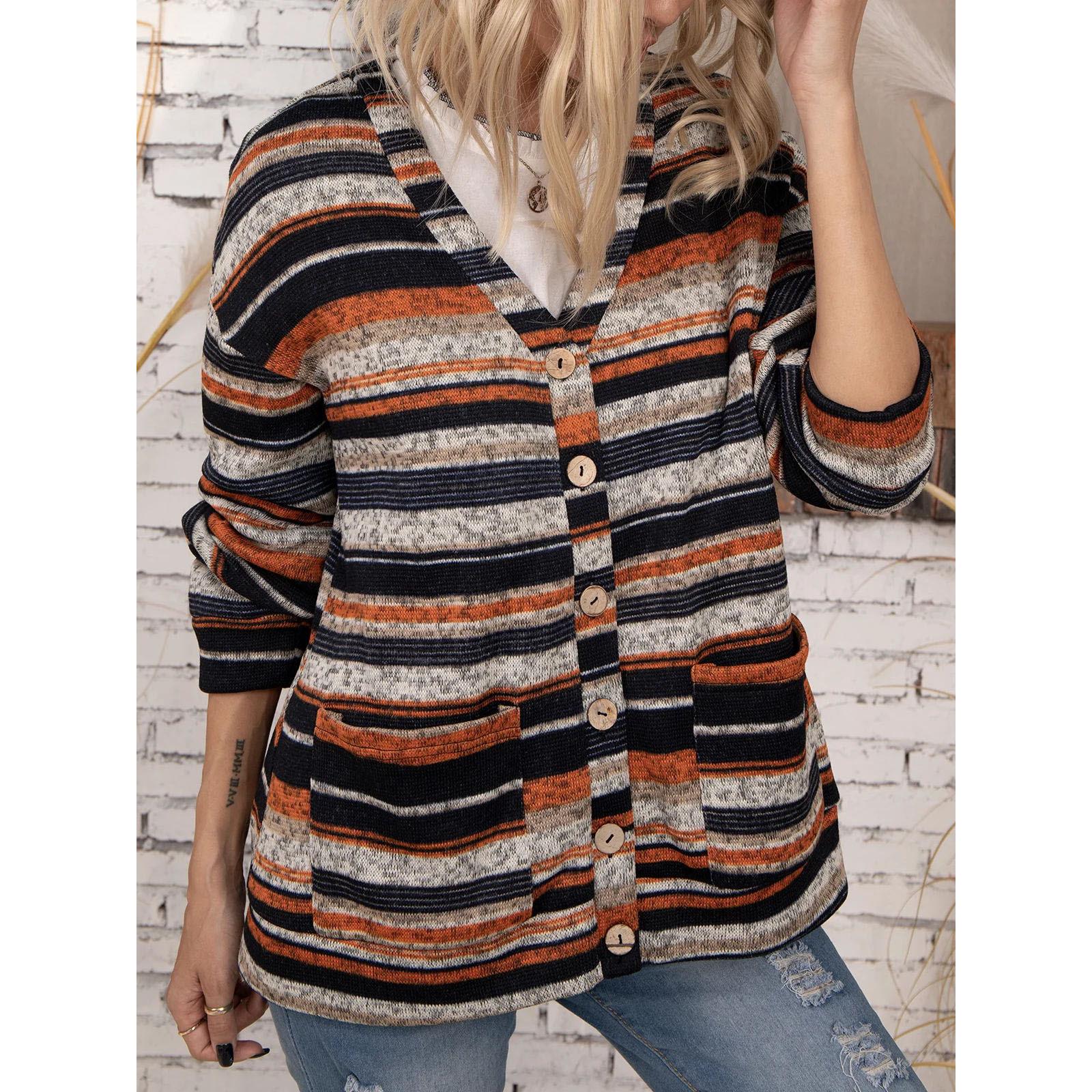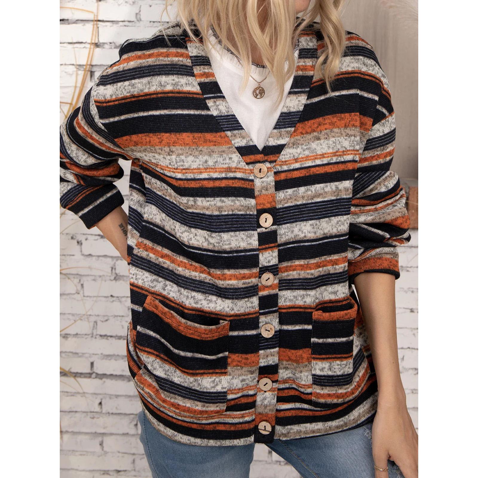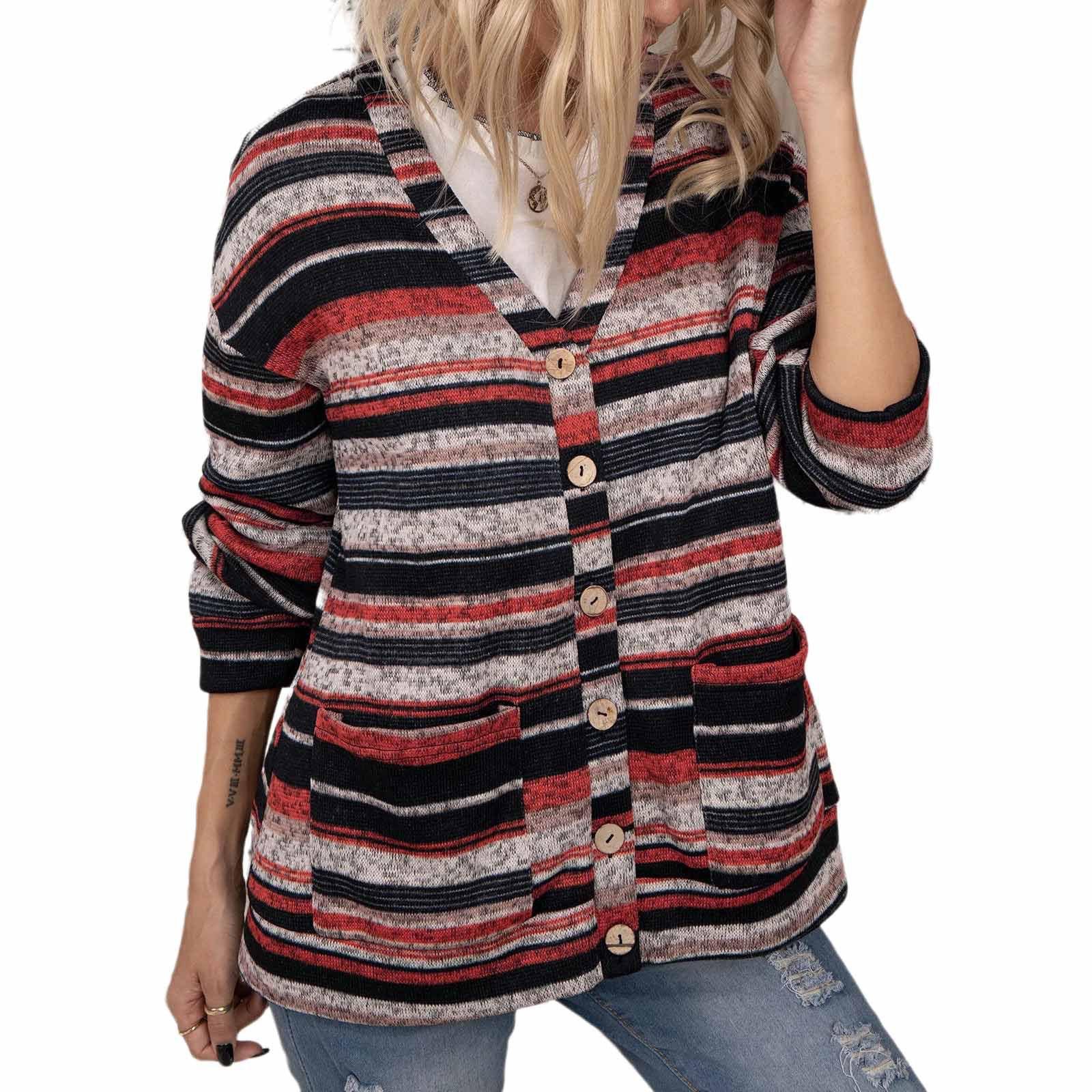 Cárdigan de punto con cuello en V de otoño europeo y americano, suéter de manga larga con bolsillo de un solo pecho, top informal holgado de color en contraste en stock