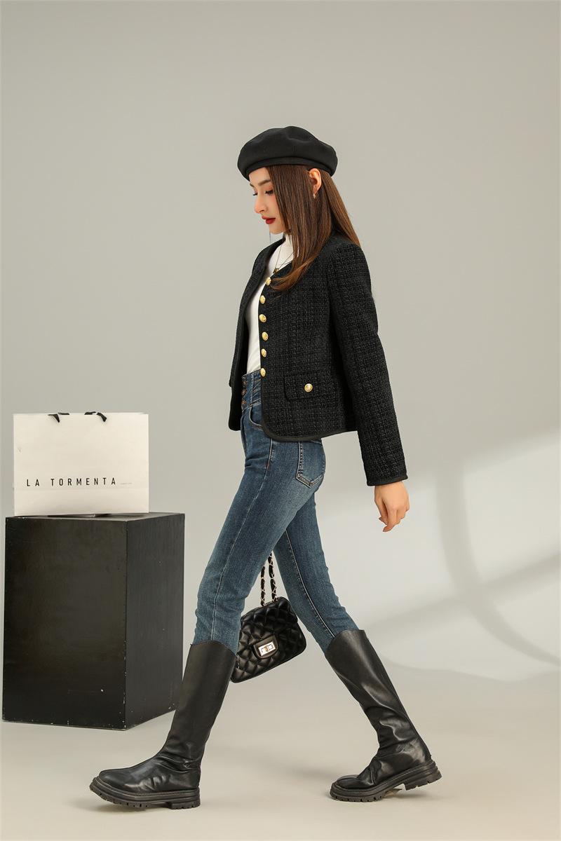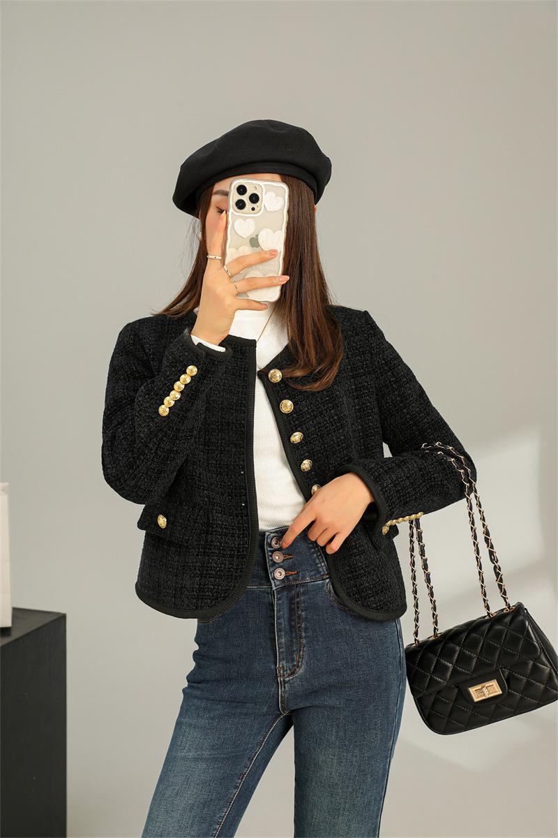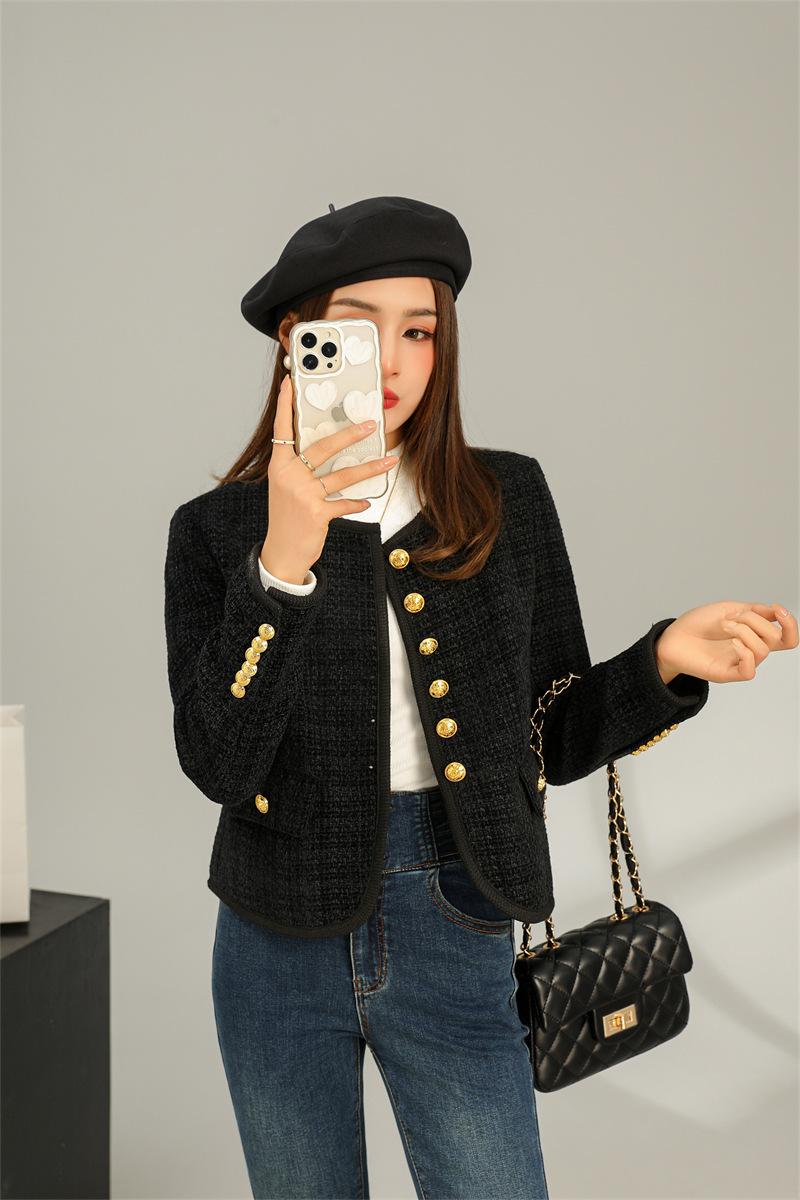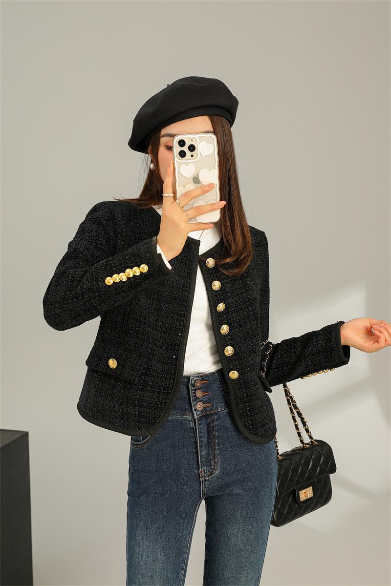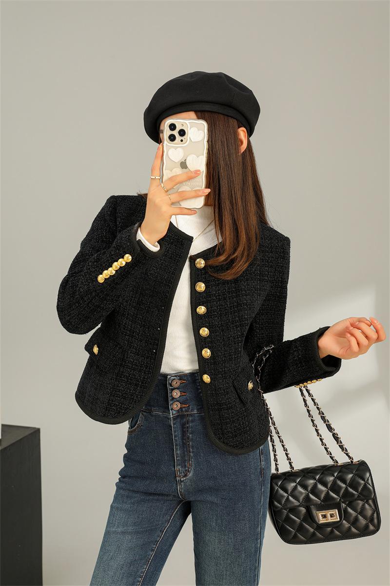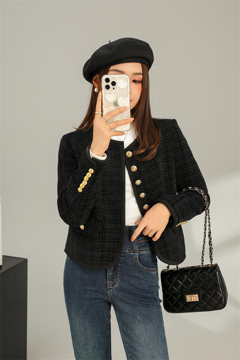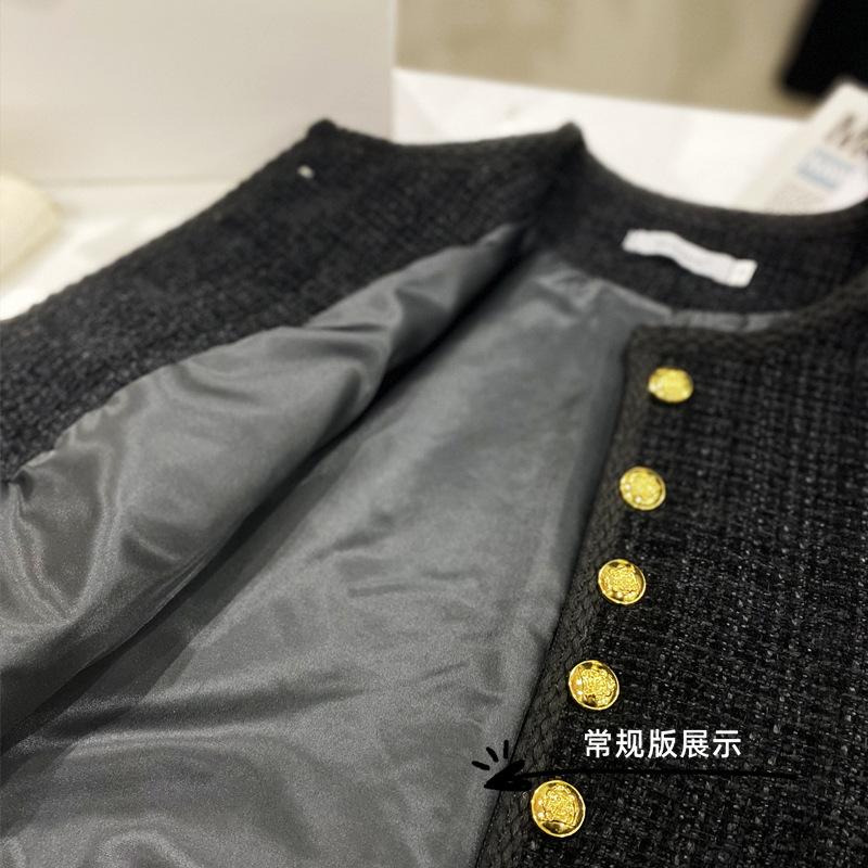 Abrigo elegante estilo Chanel dorado negro para primavera y otoño, abrigo corto retro francés de alta gama para socialité, cuello redondo, top de alta gama