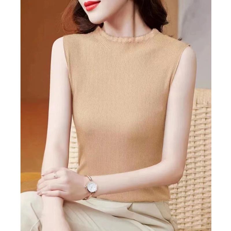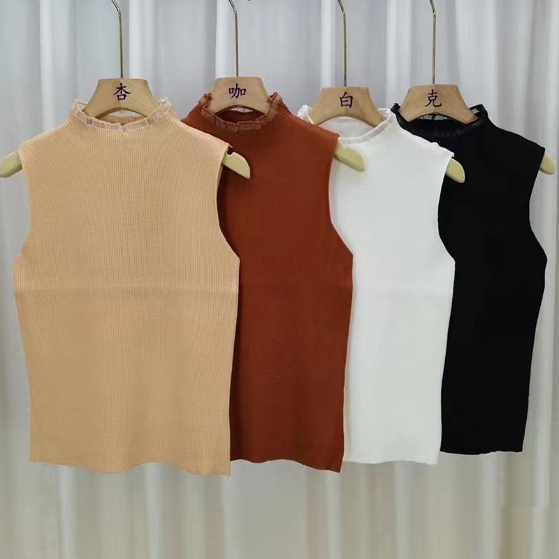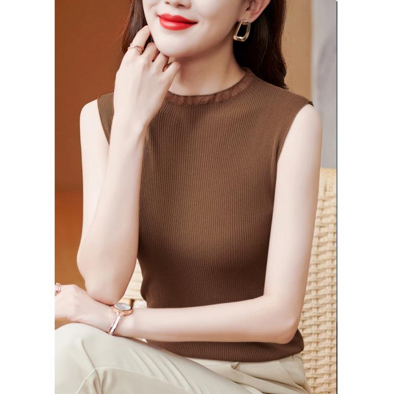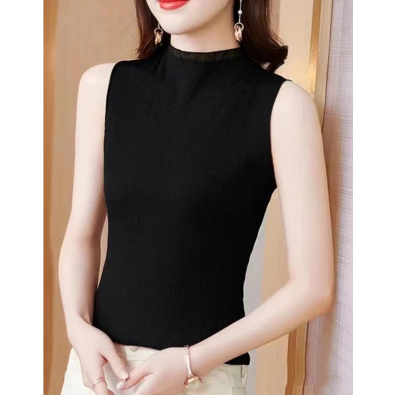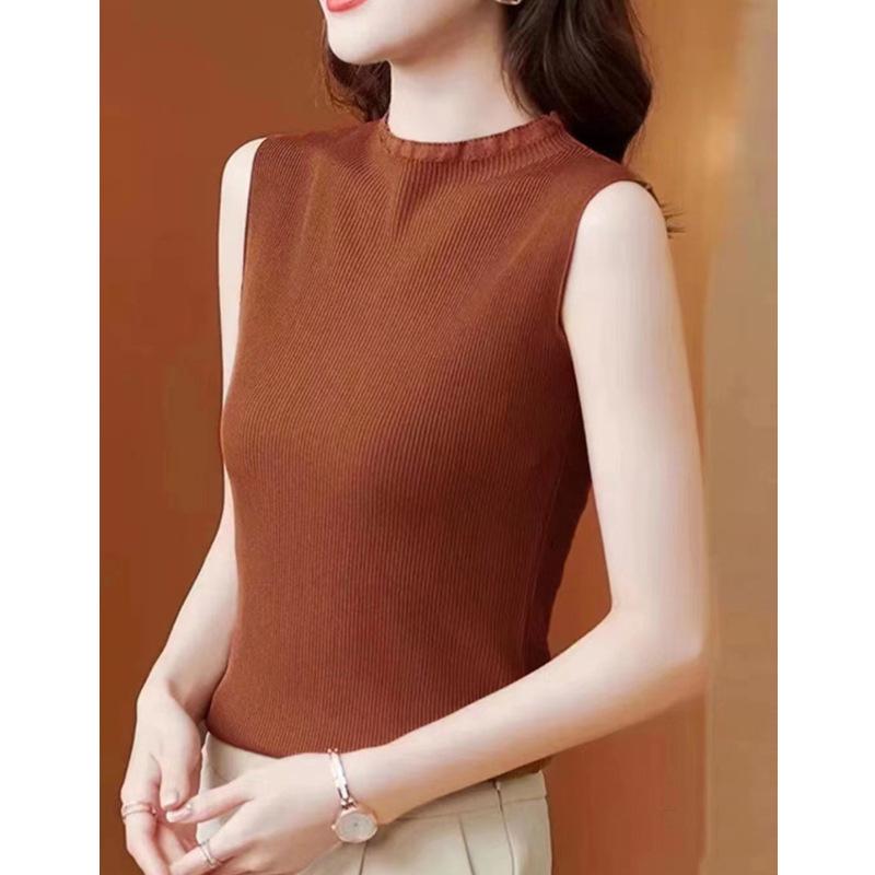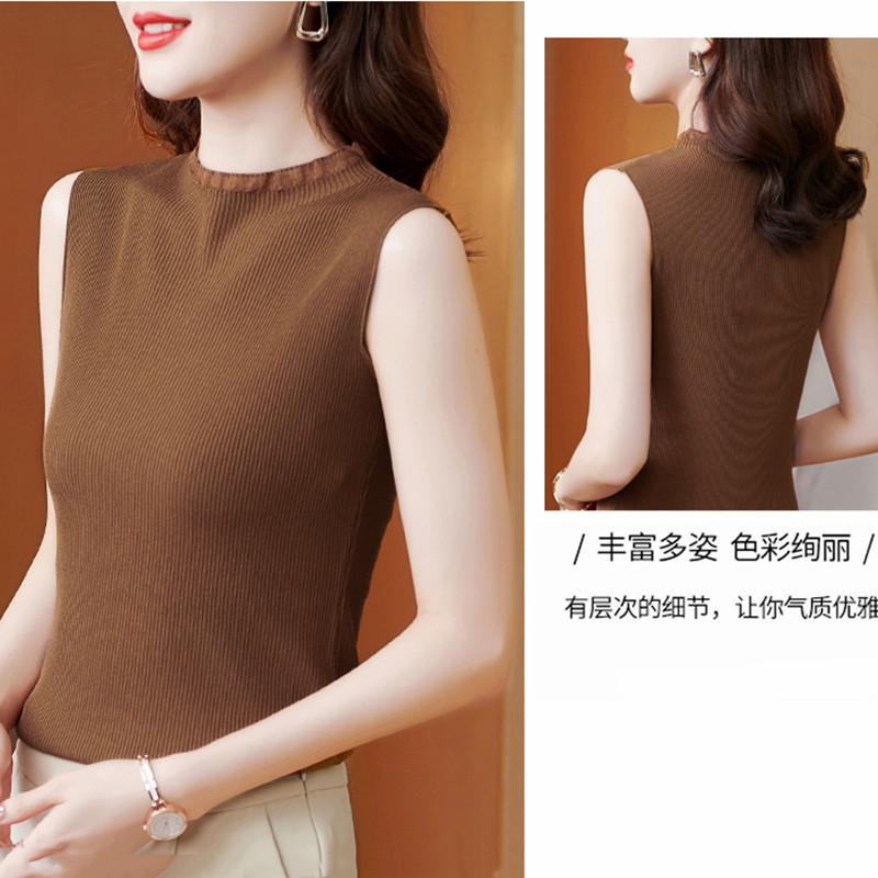Suéter de cuello alto medio estilo occidental de seda de hielo de verano nuevo, chaleco superior interior y exterior sin mangas de color sólido para mujer